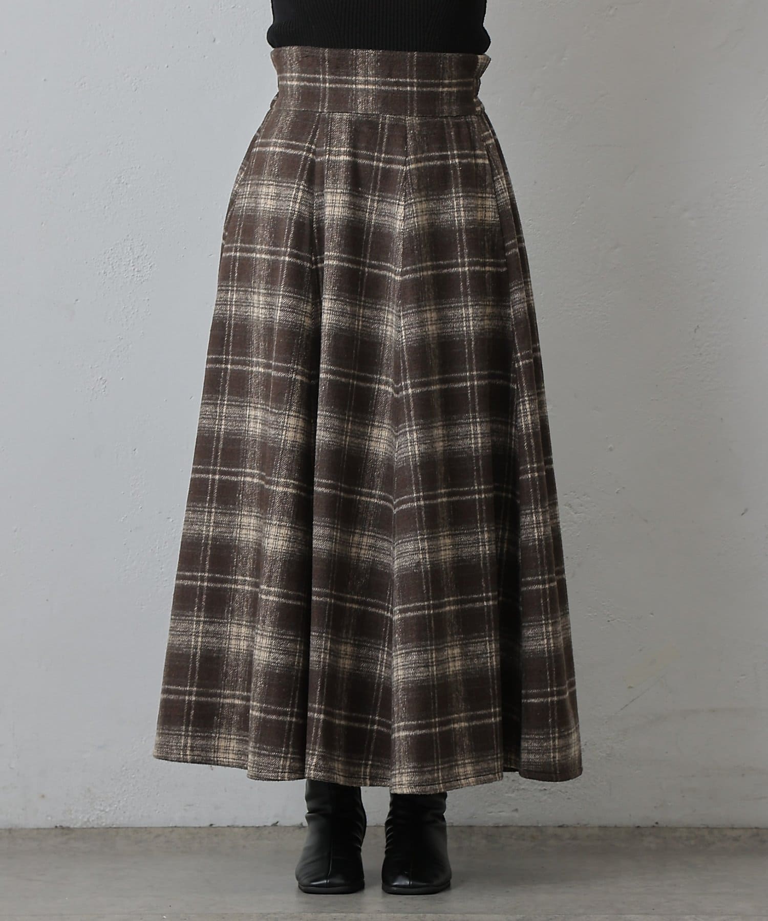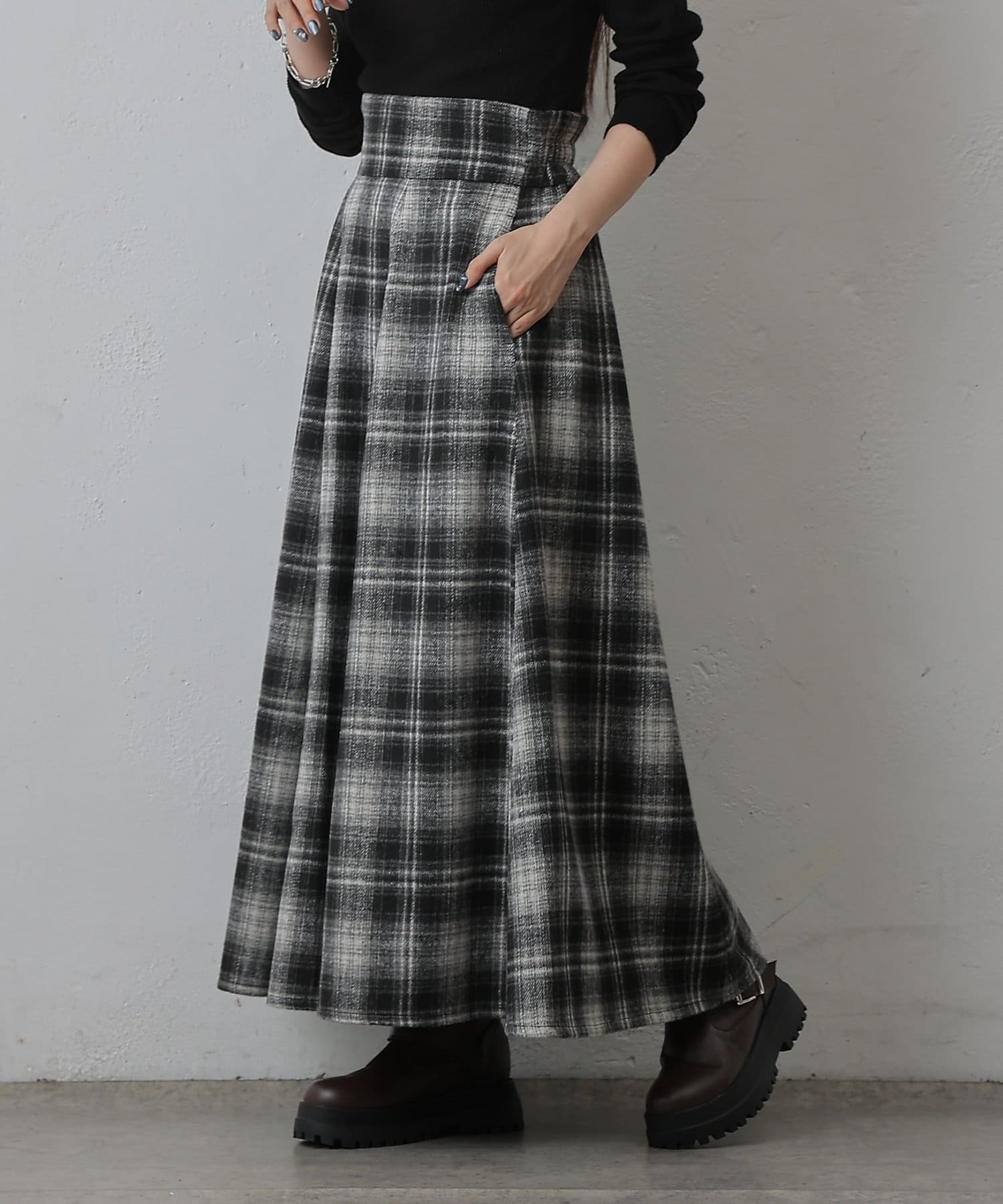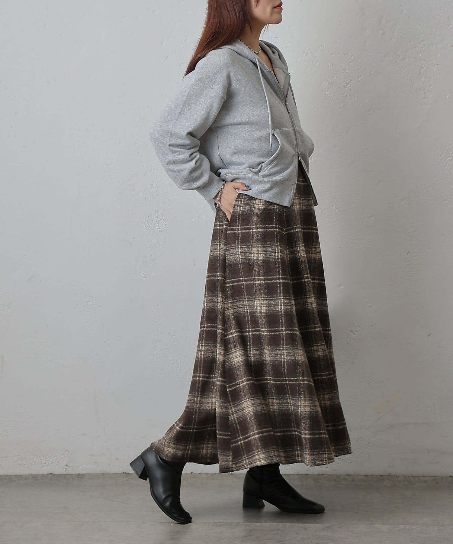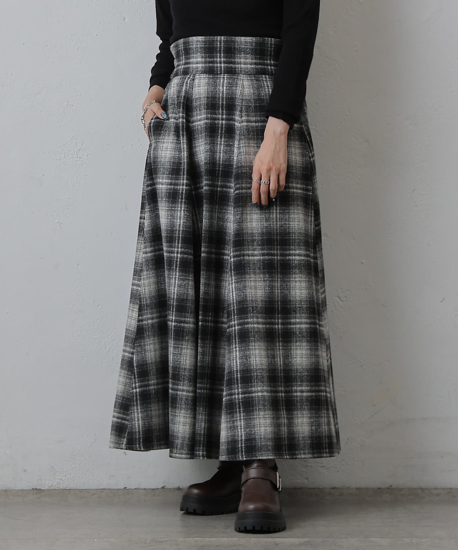 起毛素材と大きめのチェック柄がかわいいフレアスカートです。