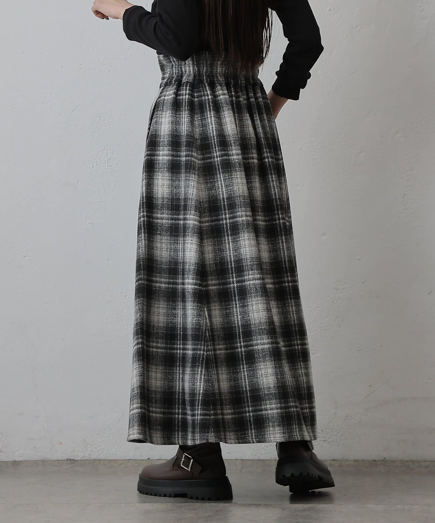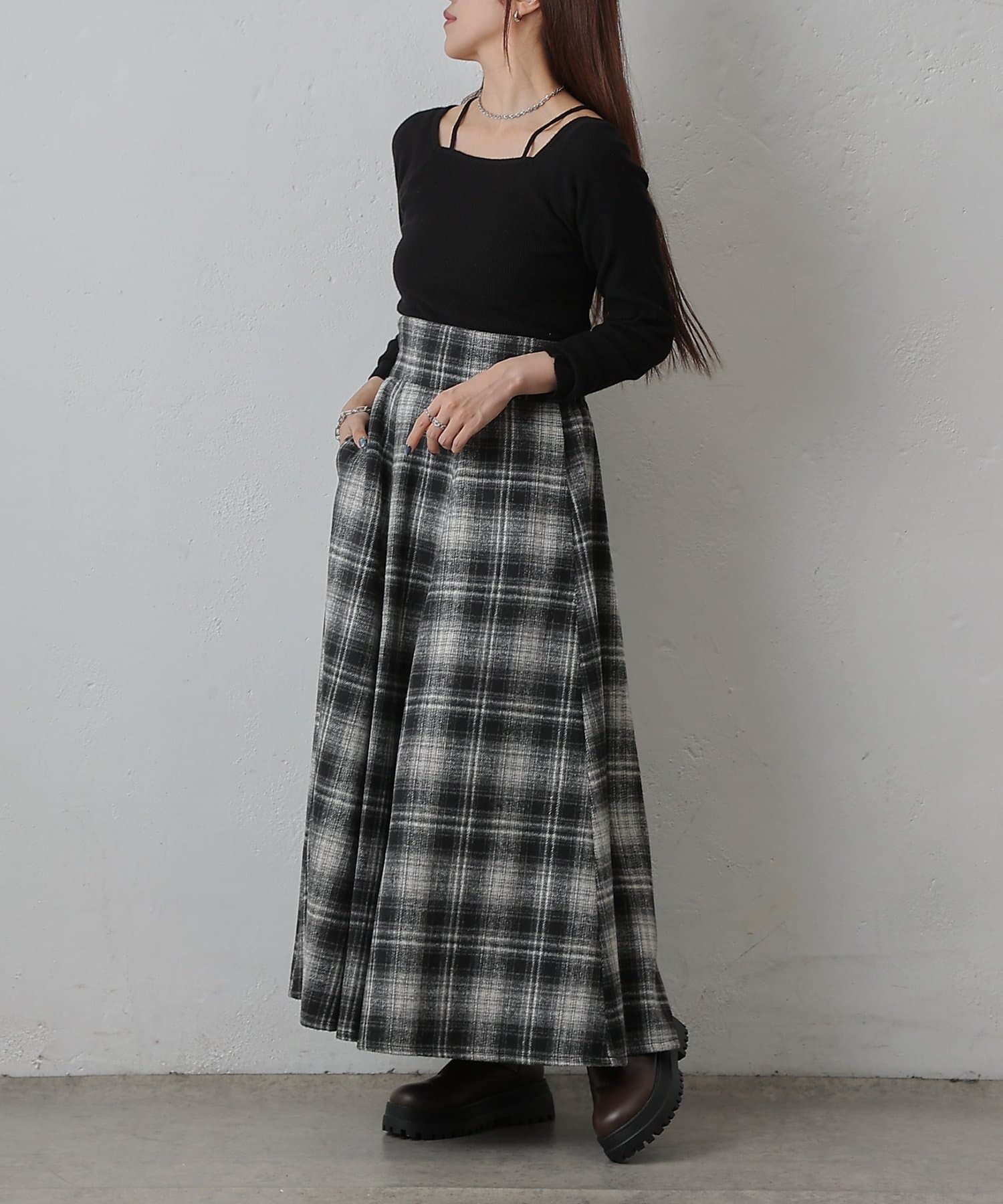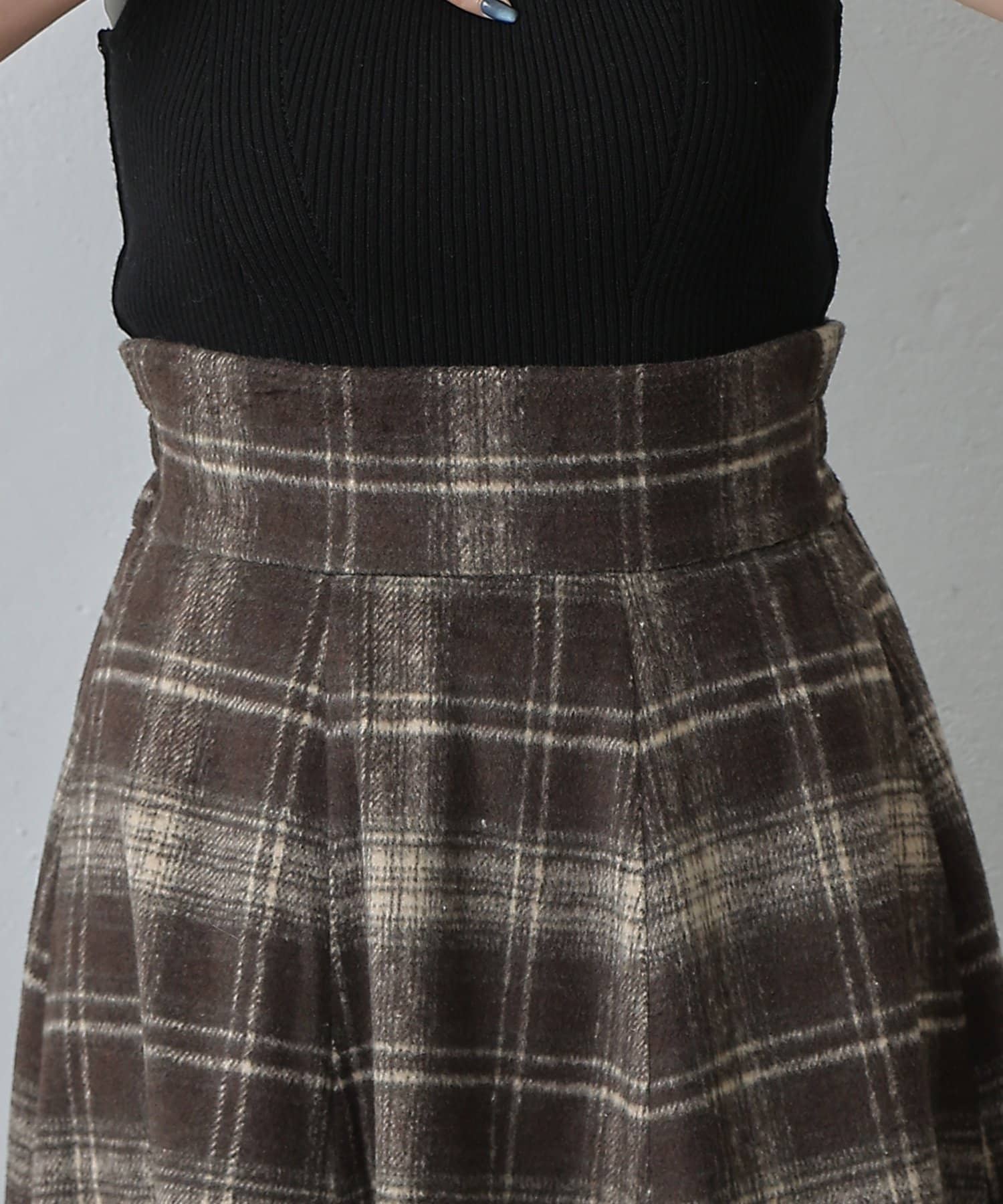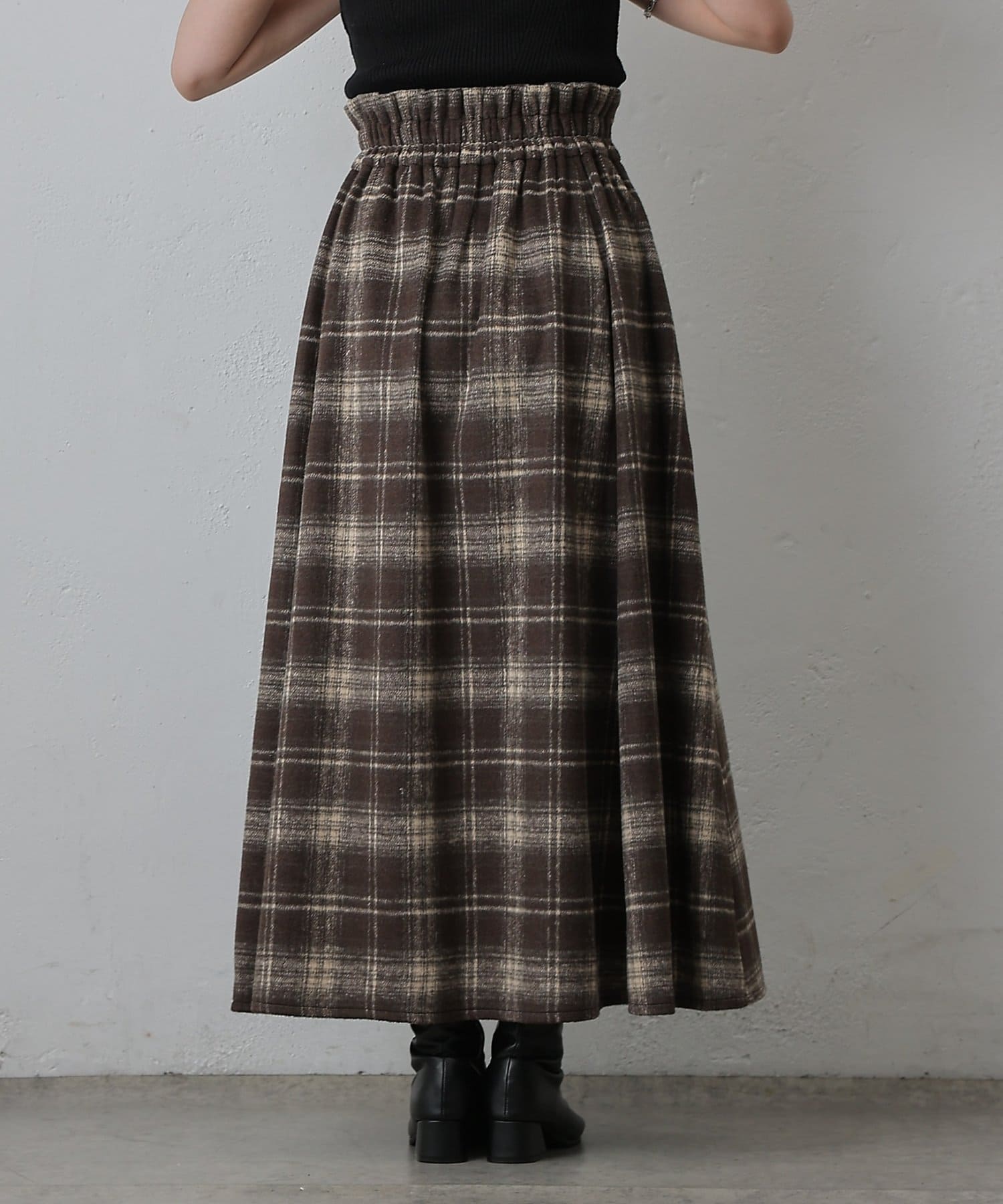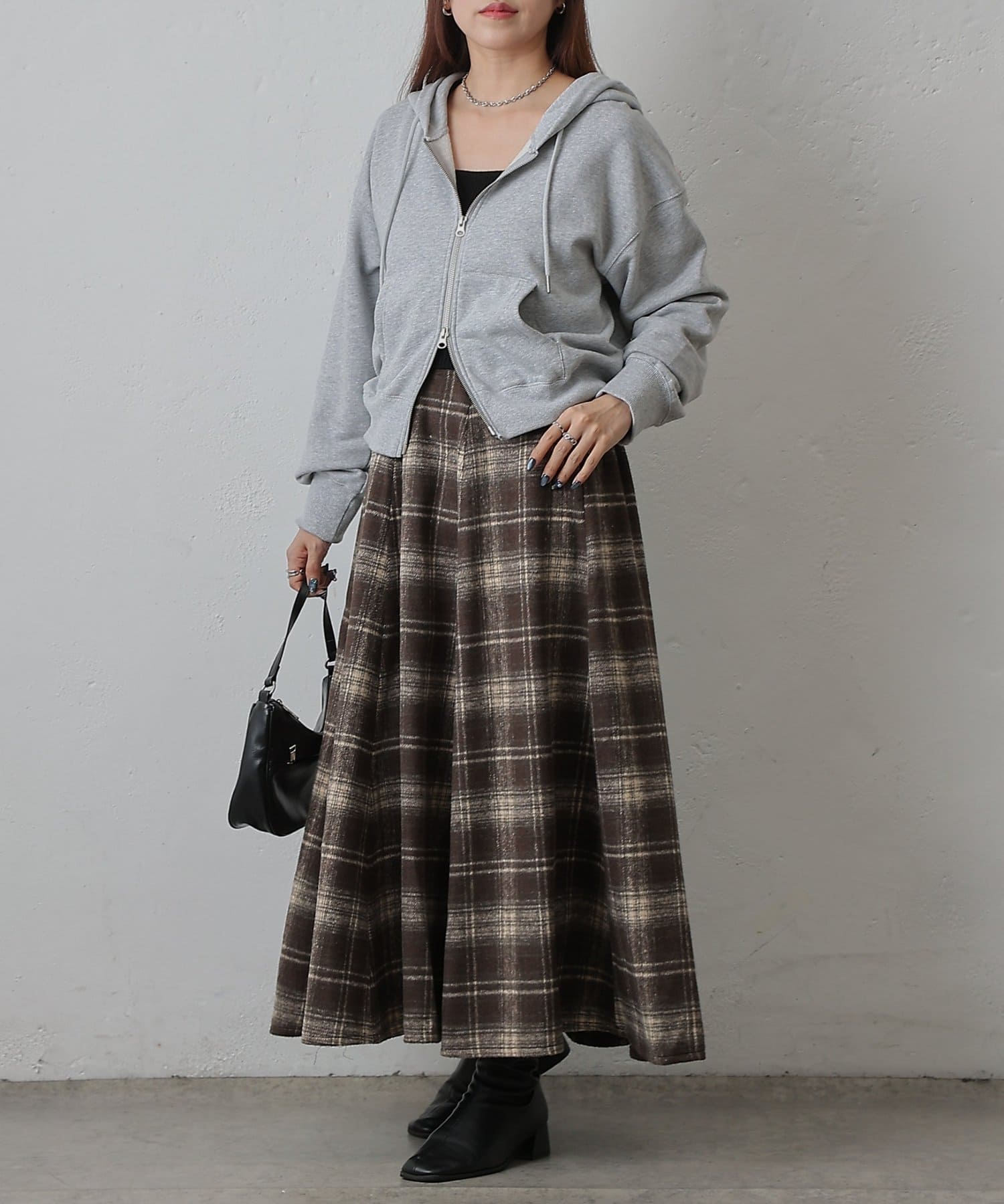 起毛素材と大きめのチェック柄がかわいいフレアスカートです。