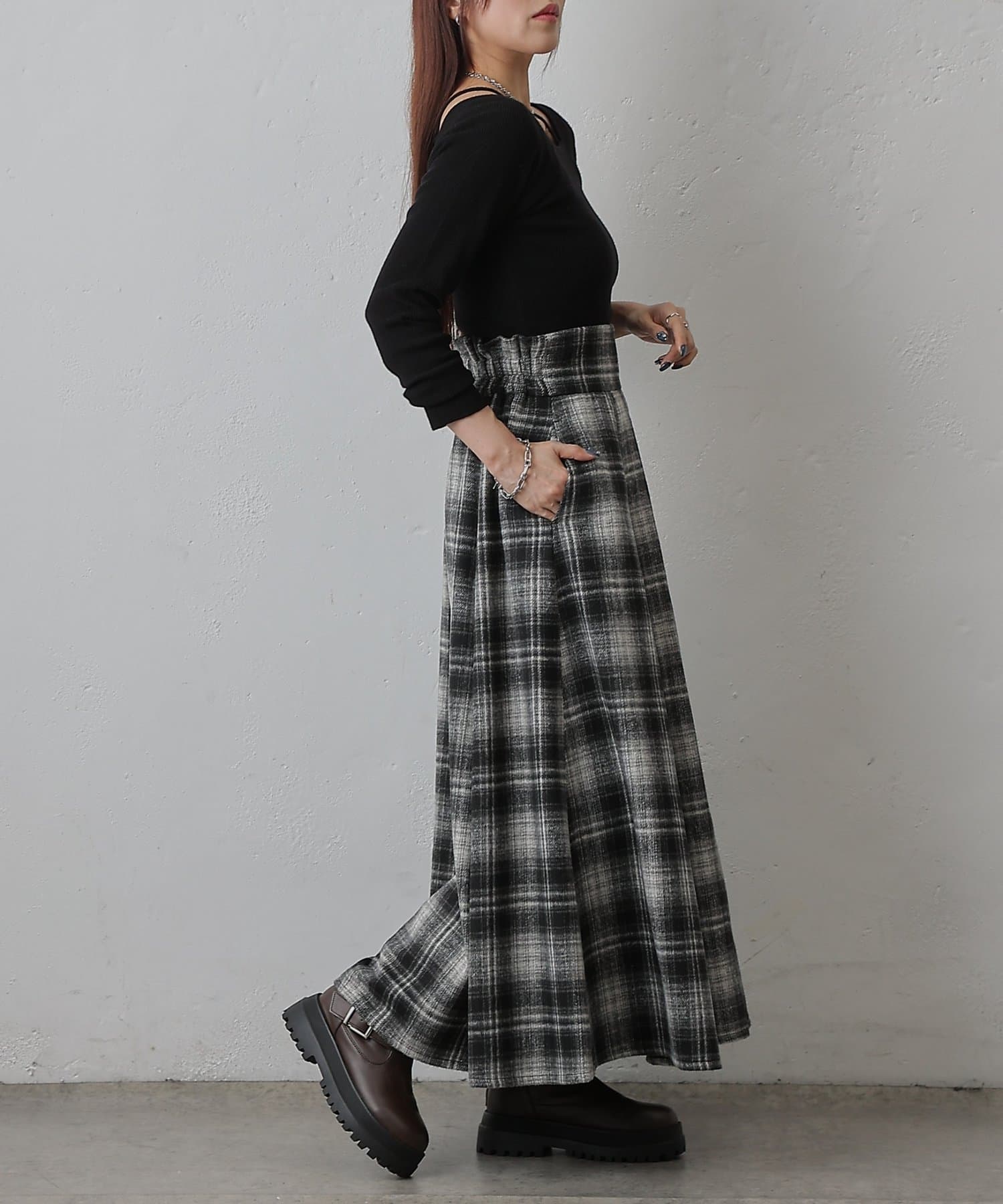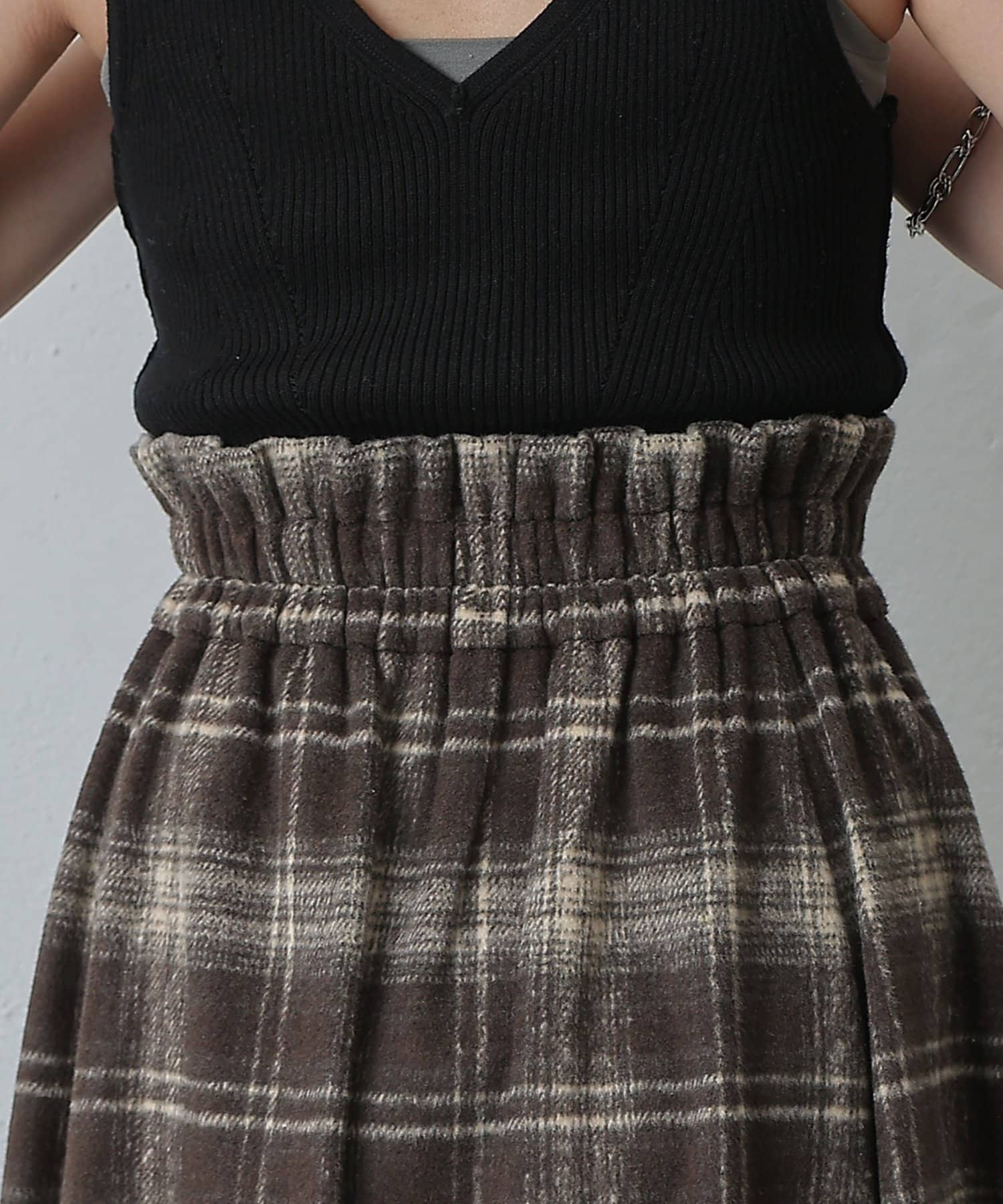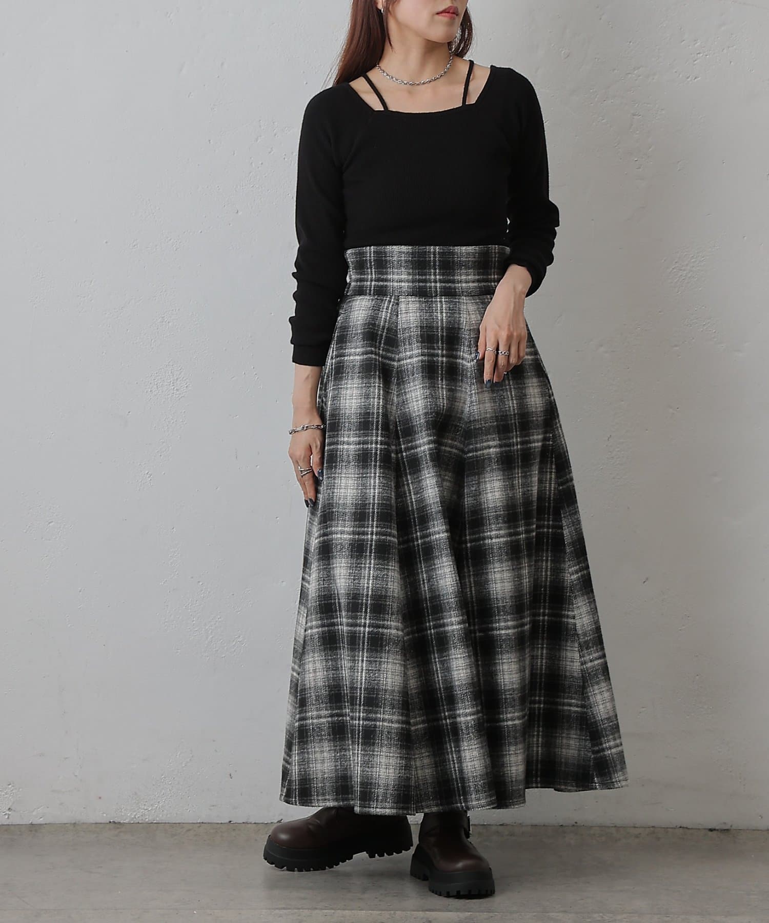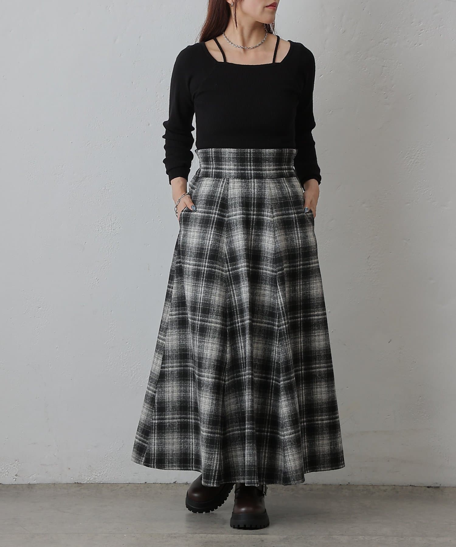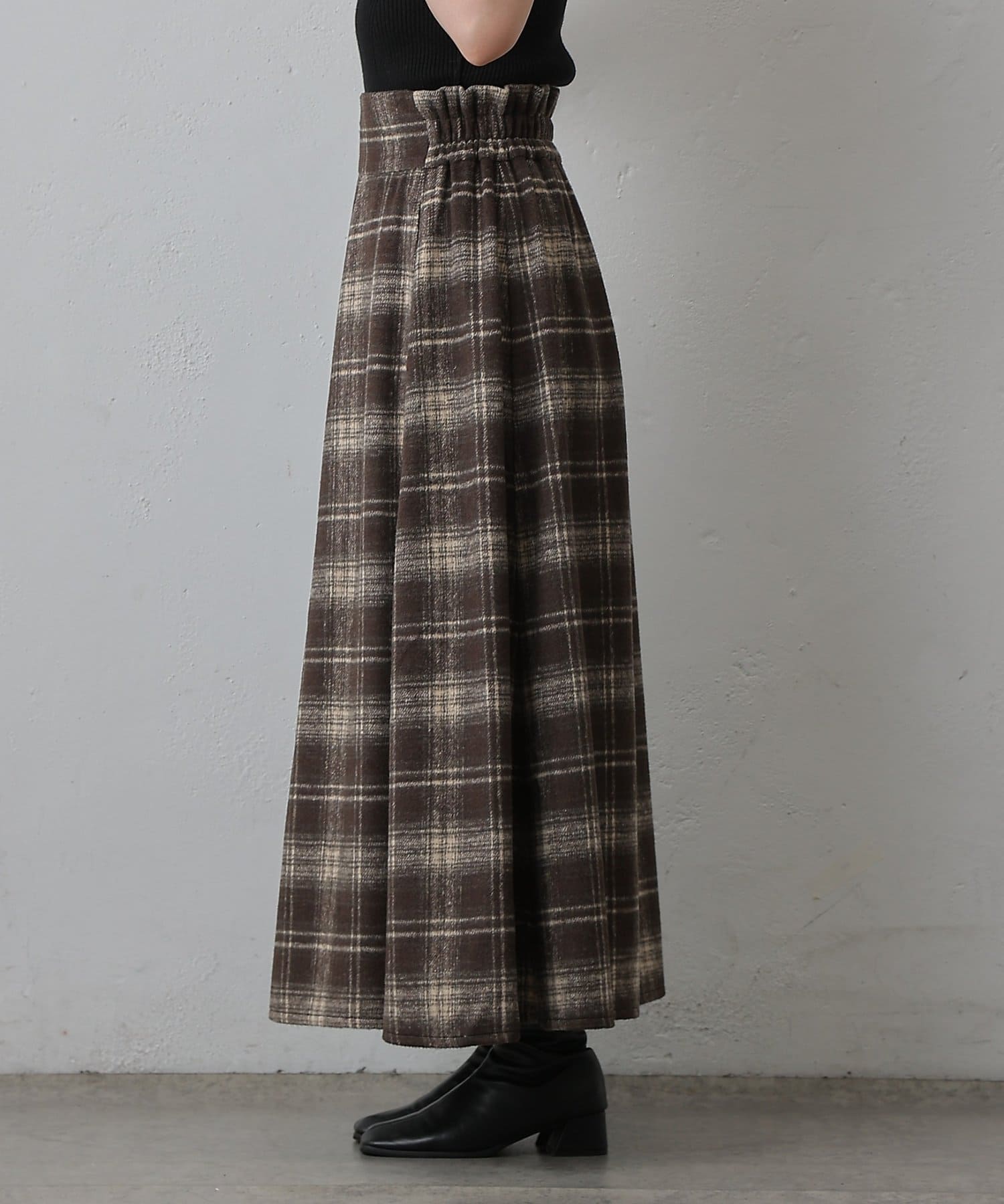 起毛素材と大きめのチェック柄がかわいいフレアスカートです。