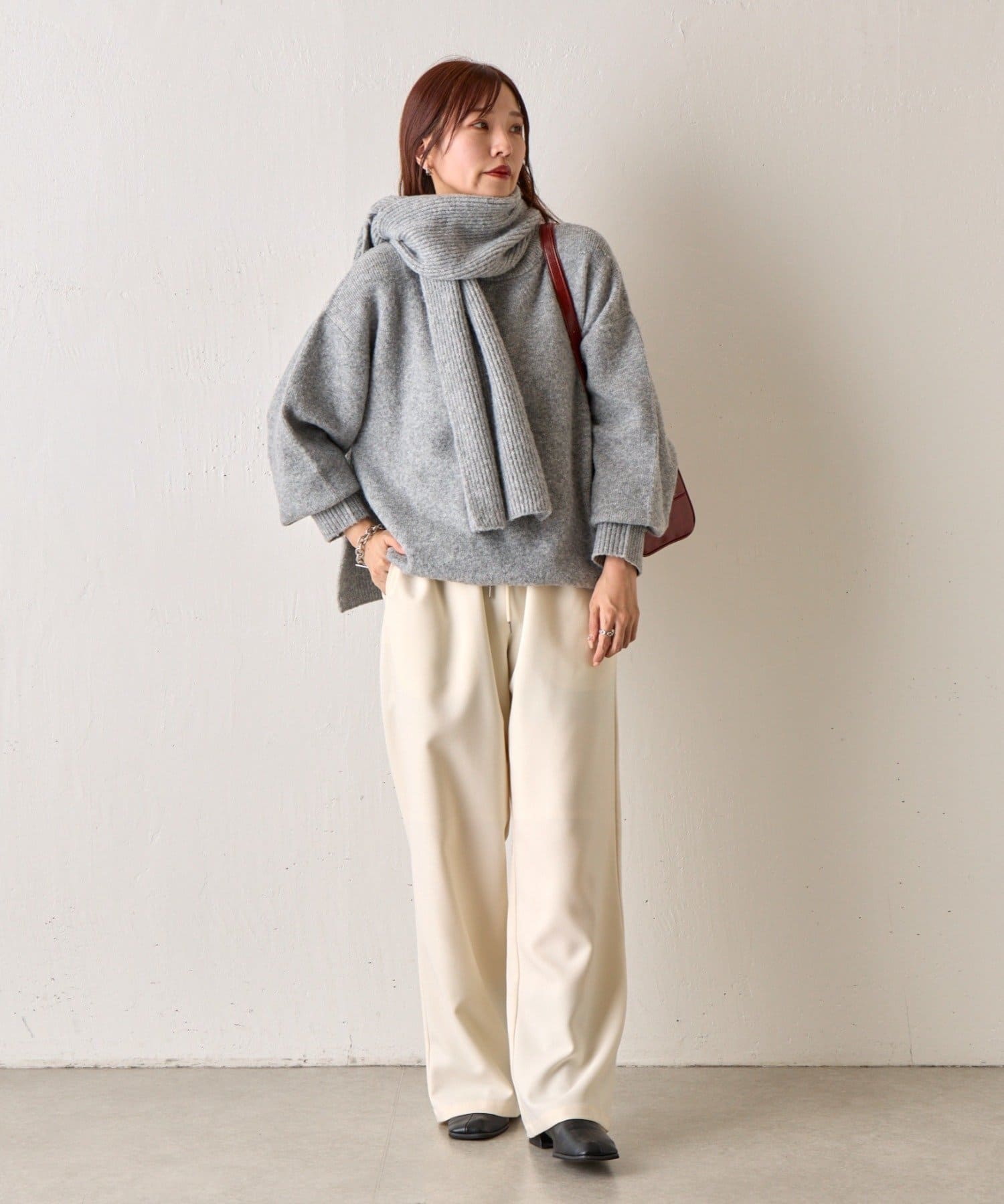 クルーネックニットと同色のマフラーのセットアイテムです。