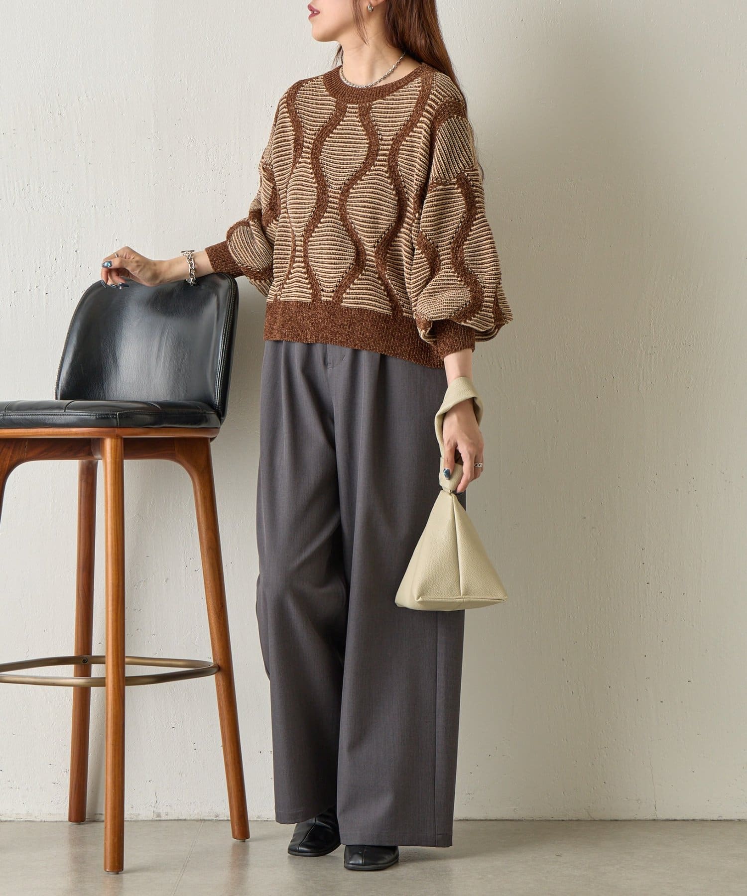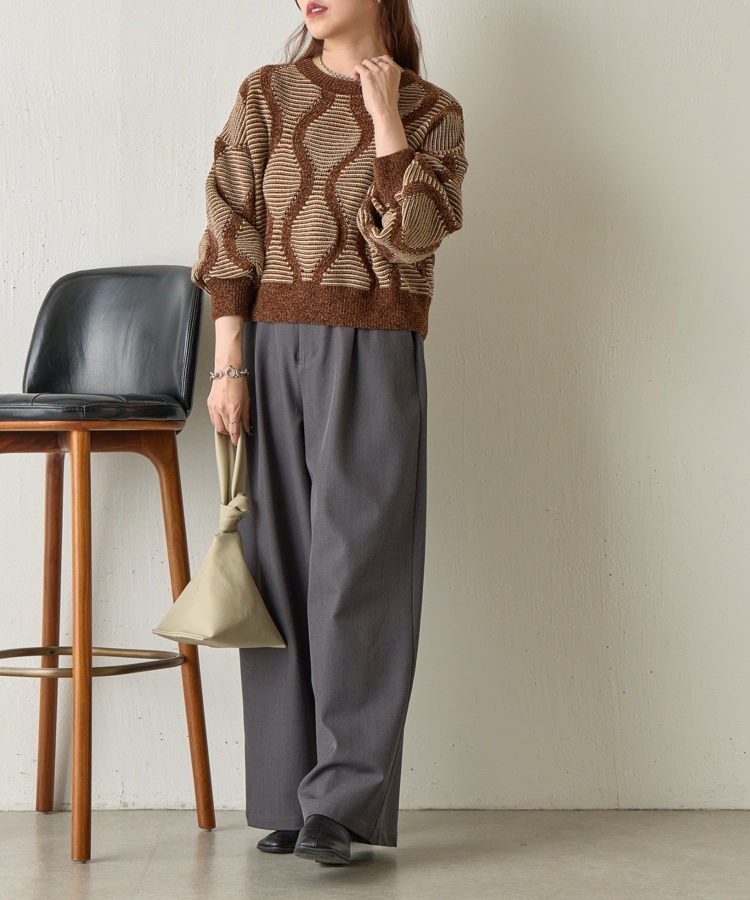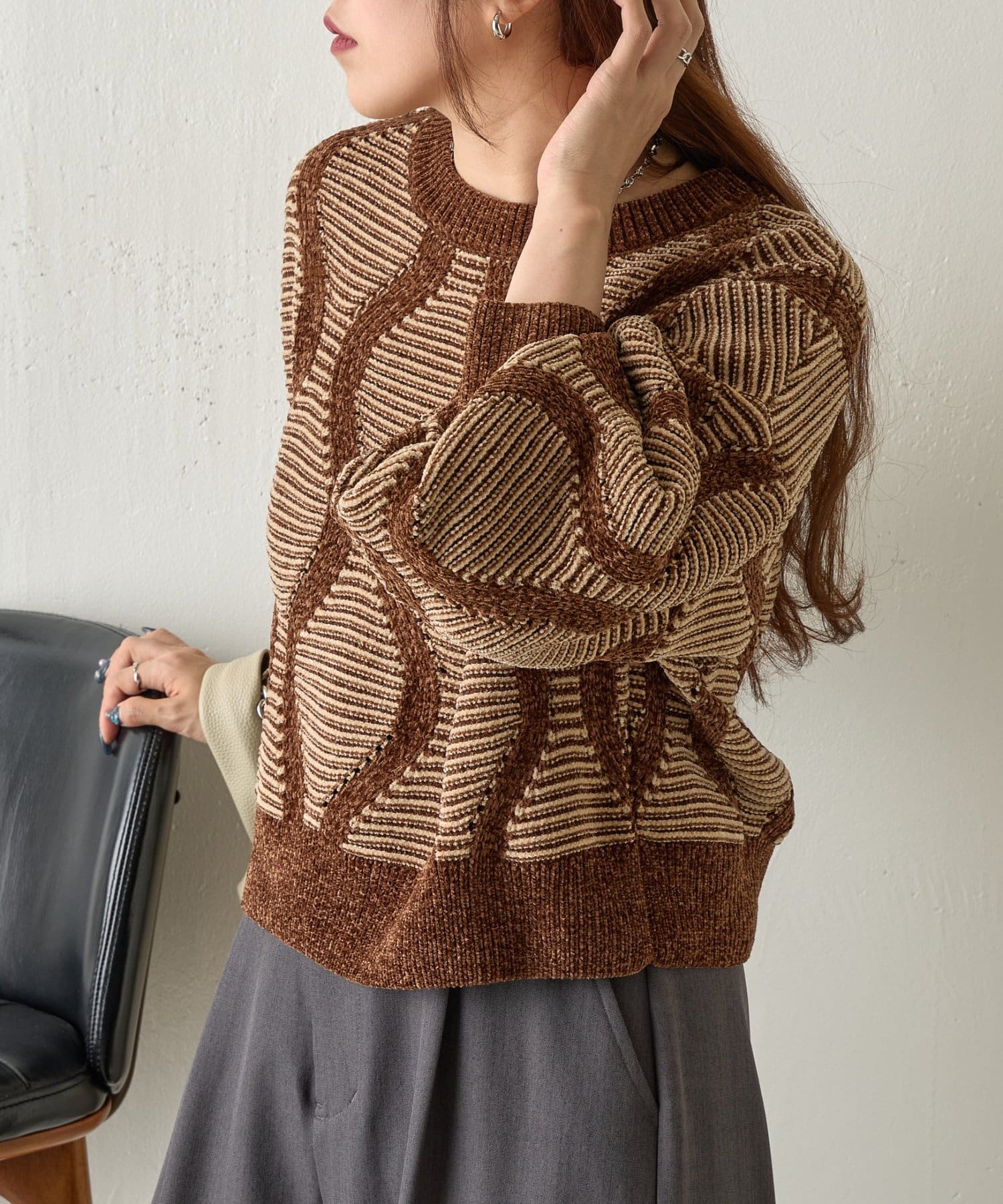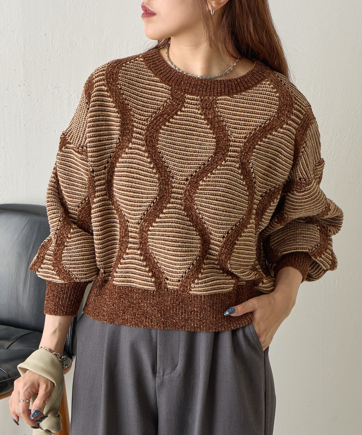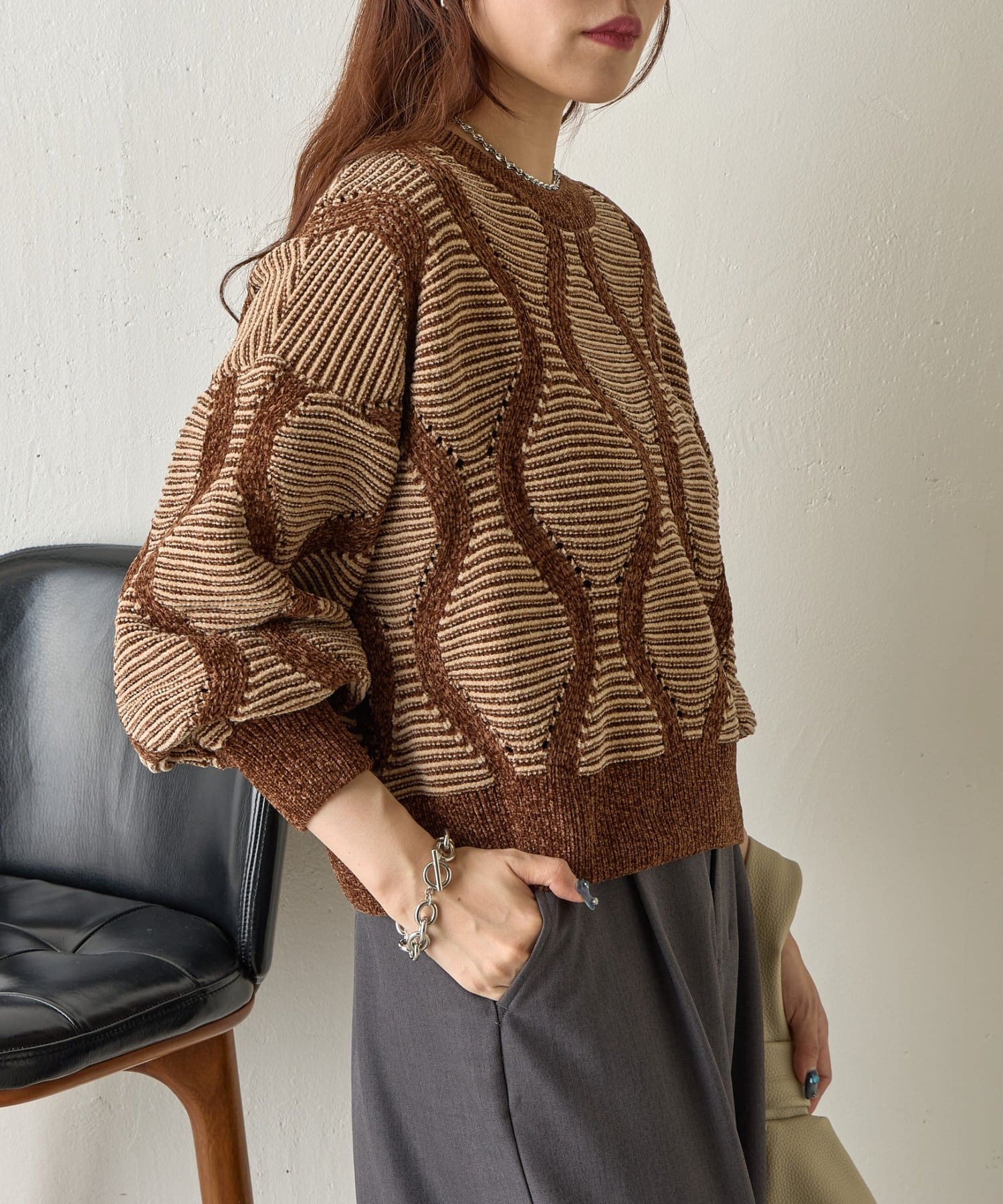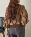 コード状の糸でひょうたん柄を表現したジャガード編みが印象的なショートプルオーバーです。