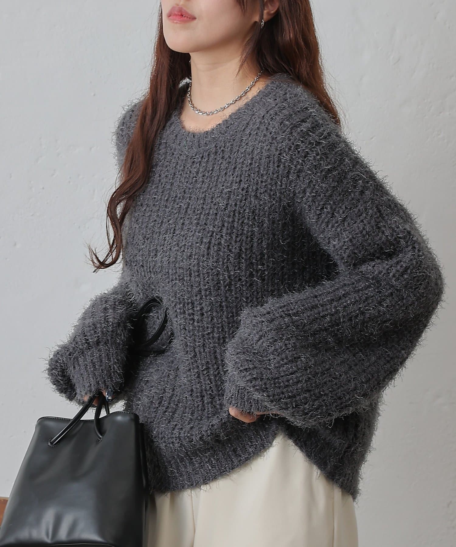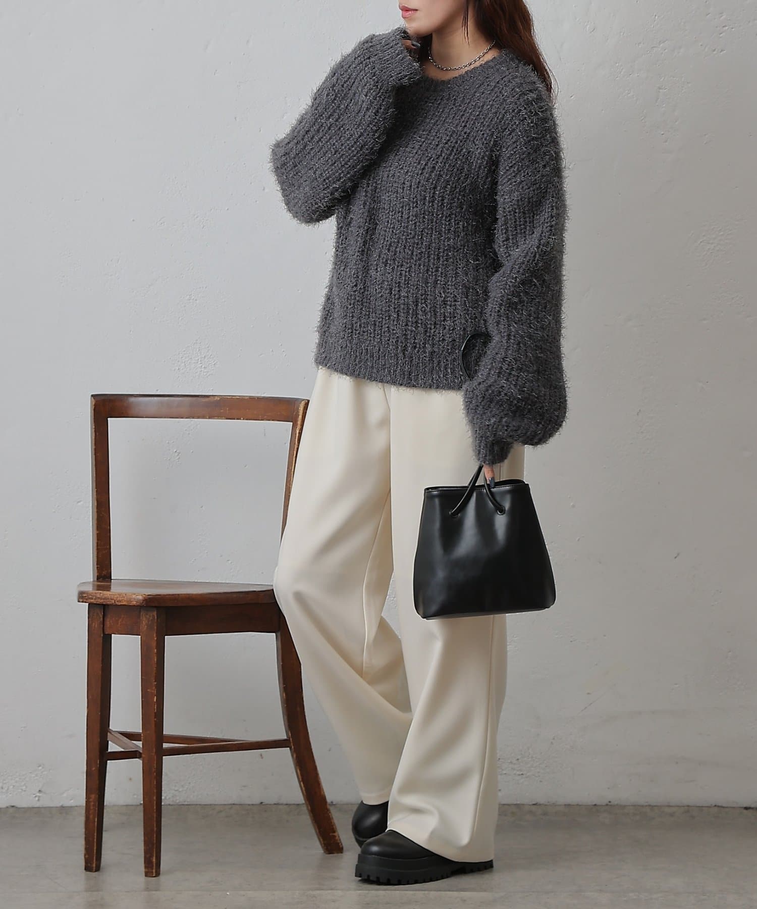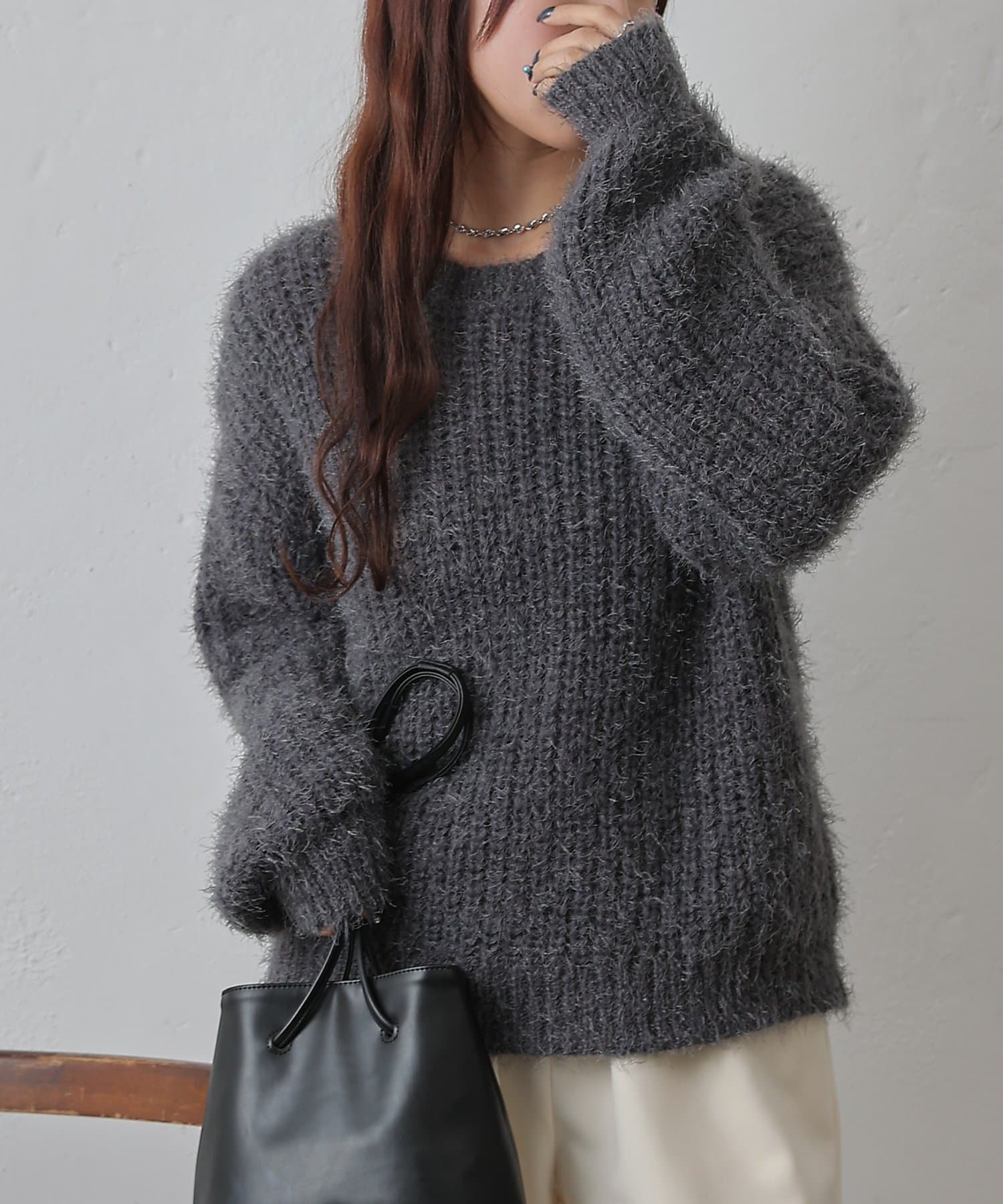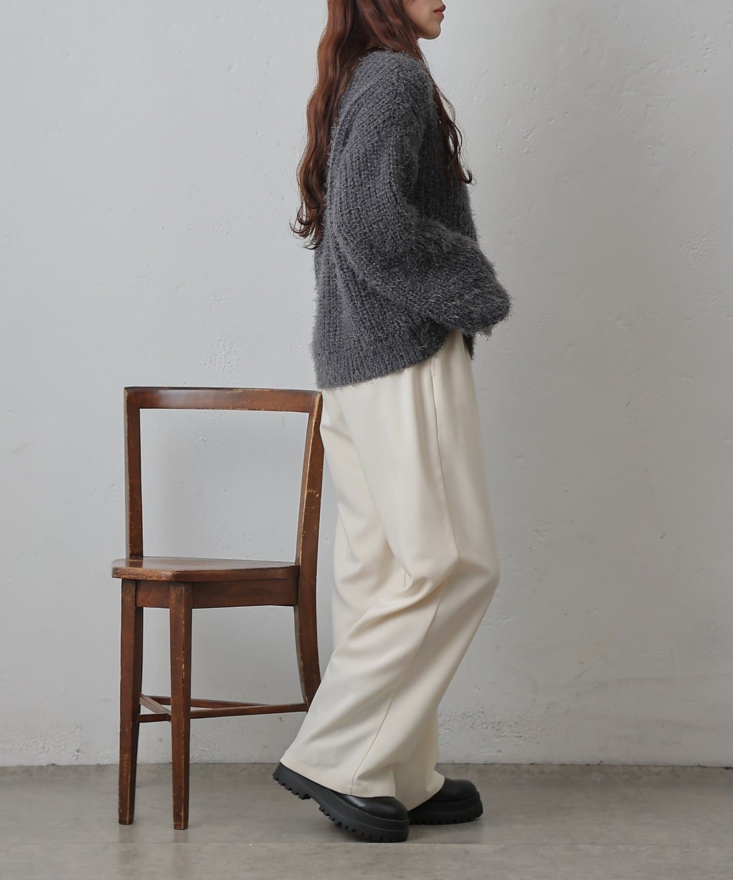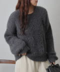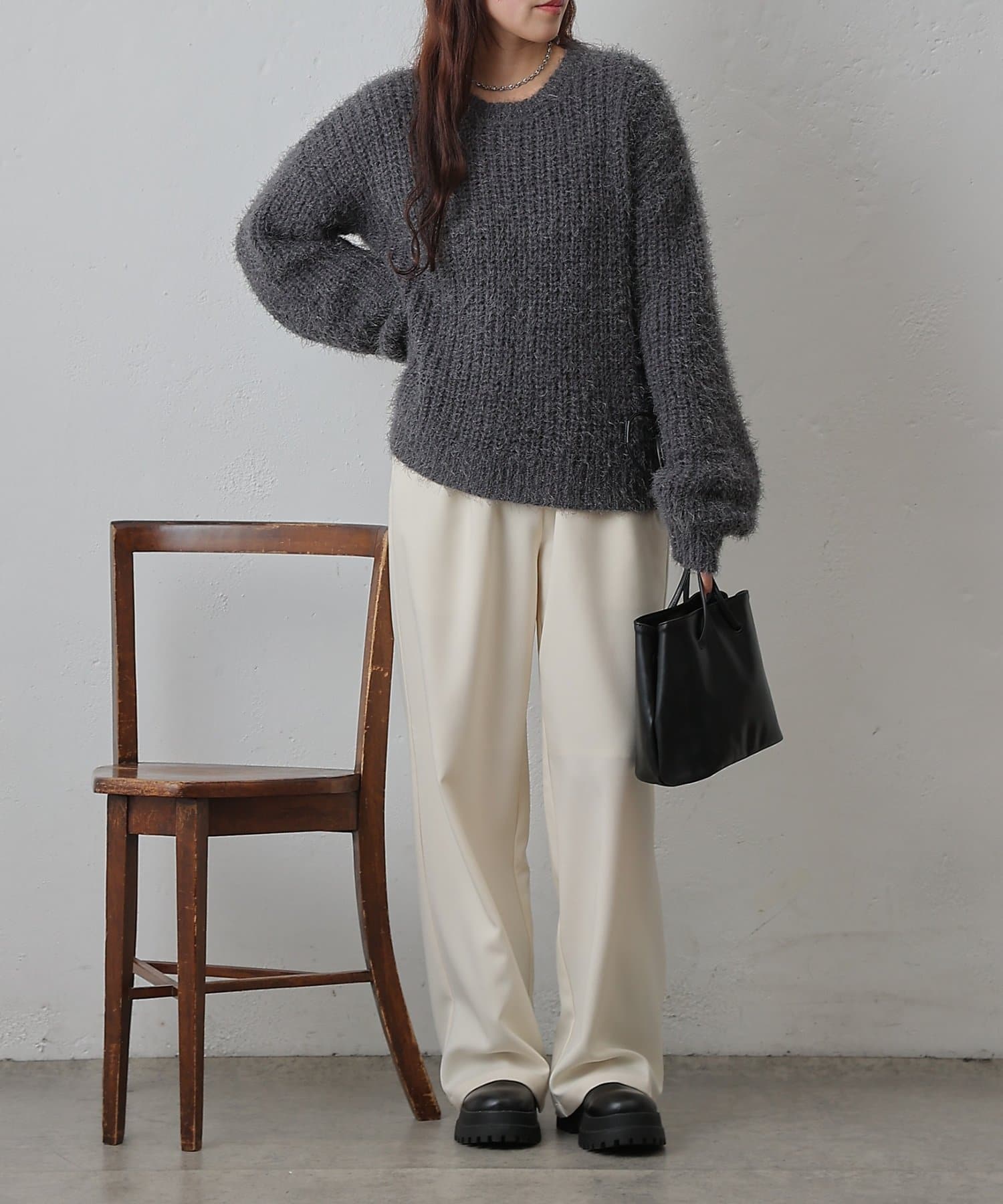 片畦編み特有の凹凸感のある生地もかわいく、ゆとりのあるシルエットや毛足長めの素材感から女性らしく合わせられます。
