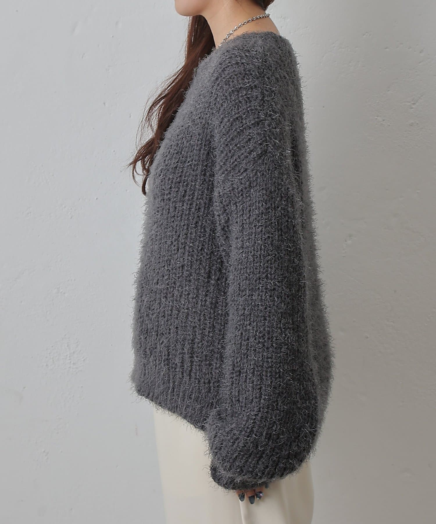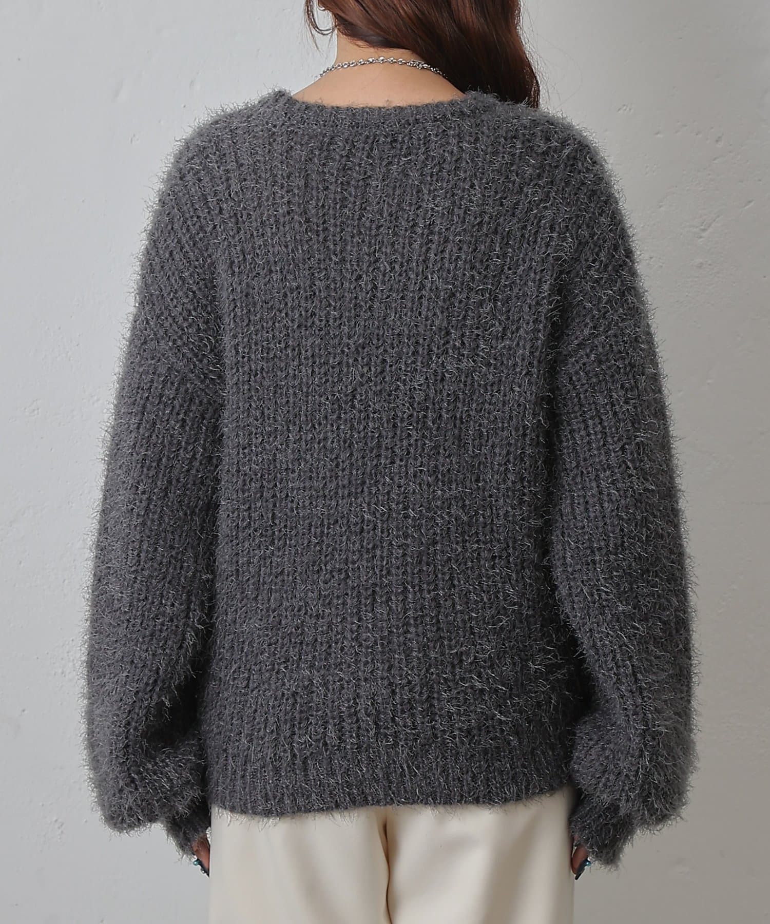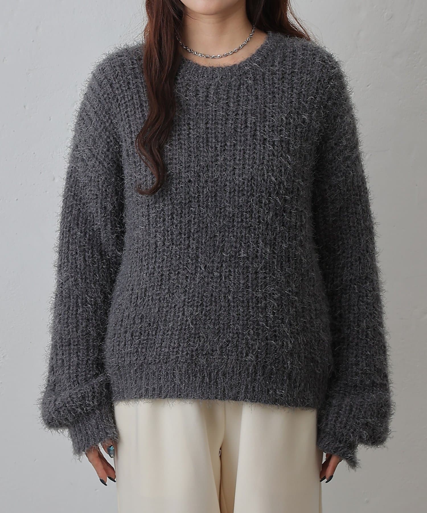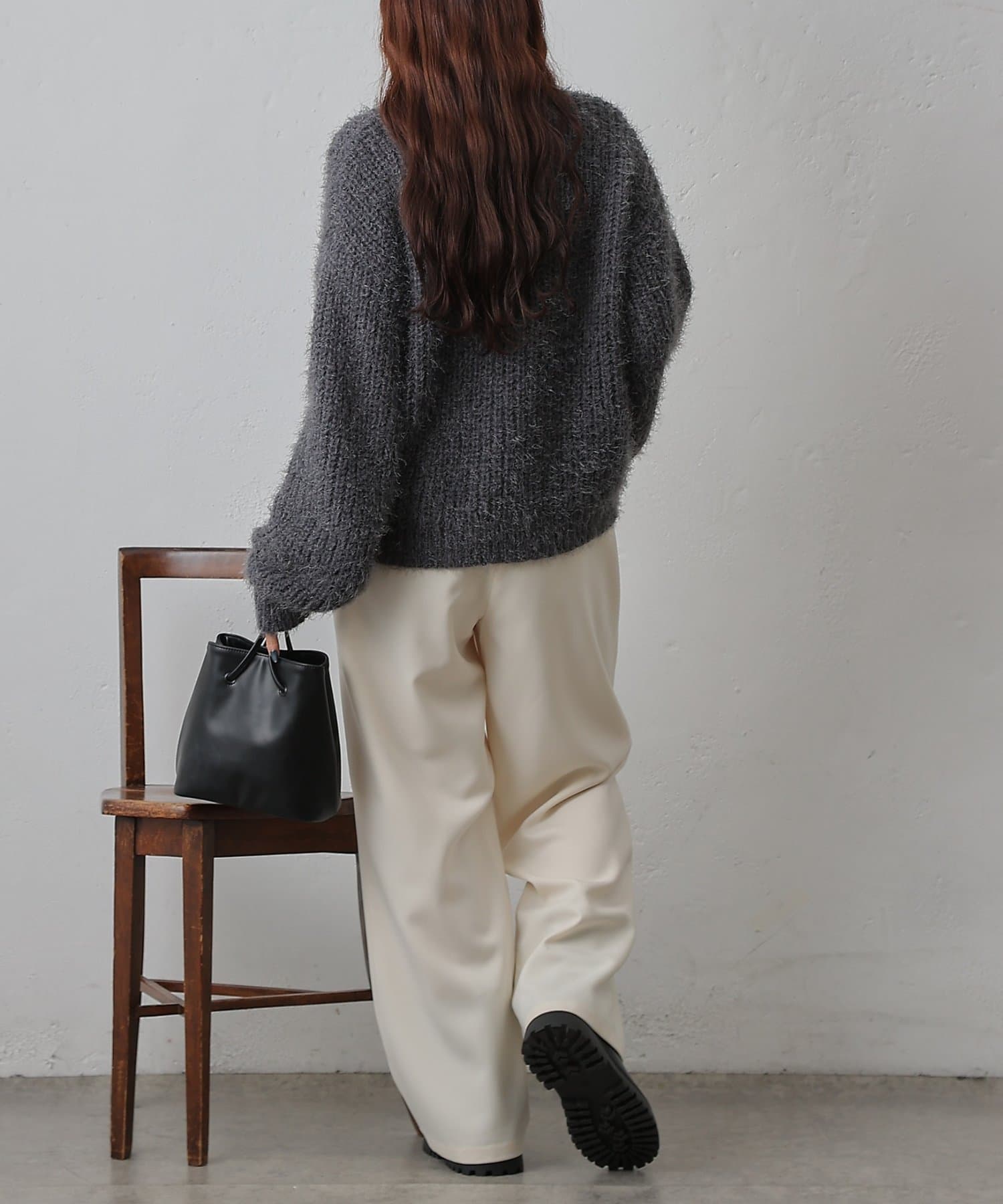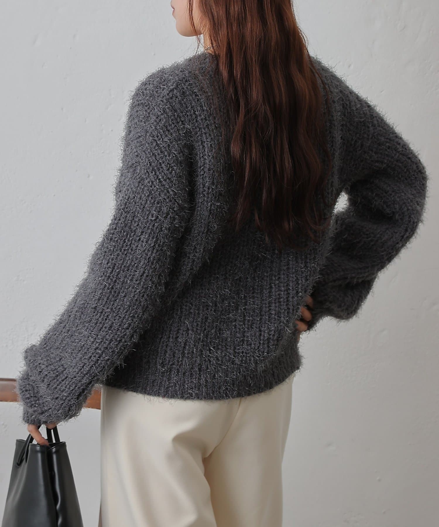 片畦編み特有の凹凸感のある生地もかわいく、ゆとりのあるシルエットや毛足長めの素材感から女性らしく合わせられます。