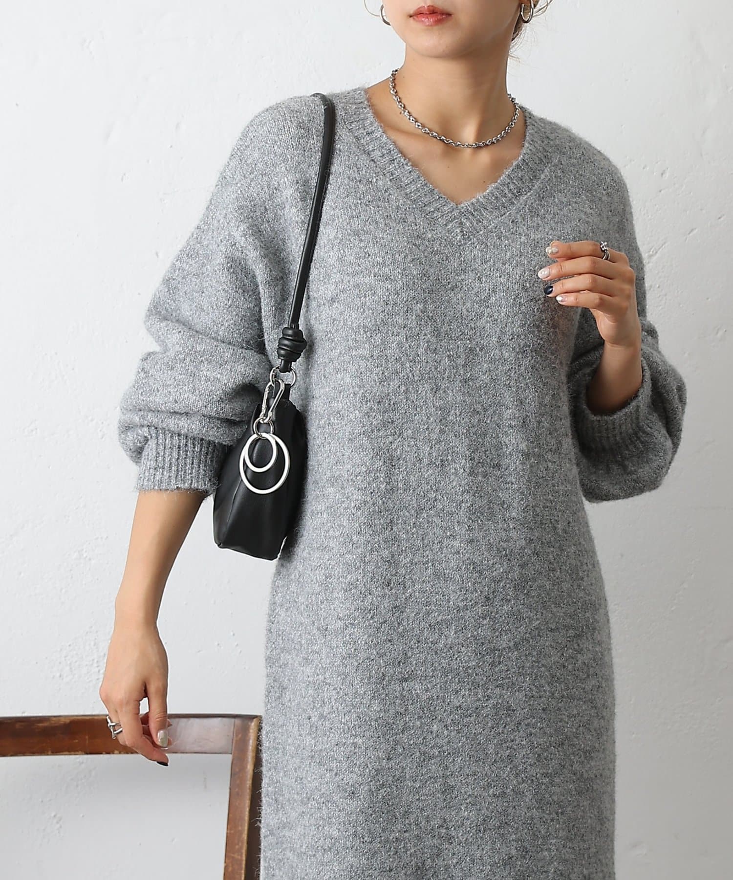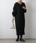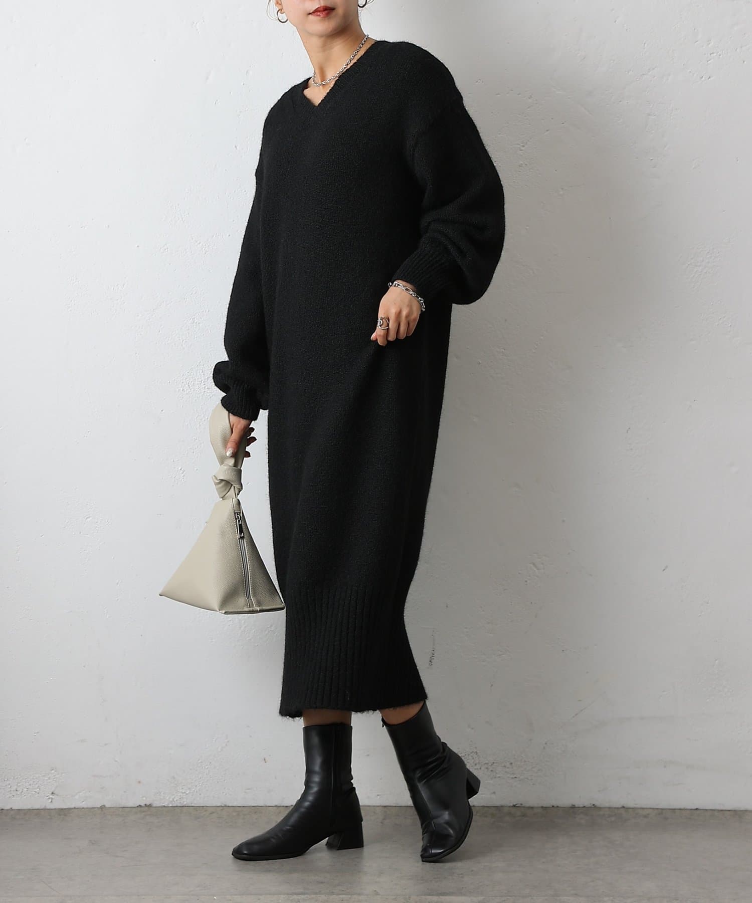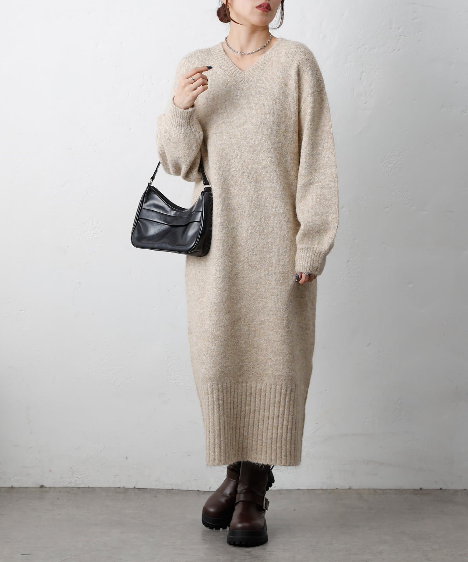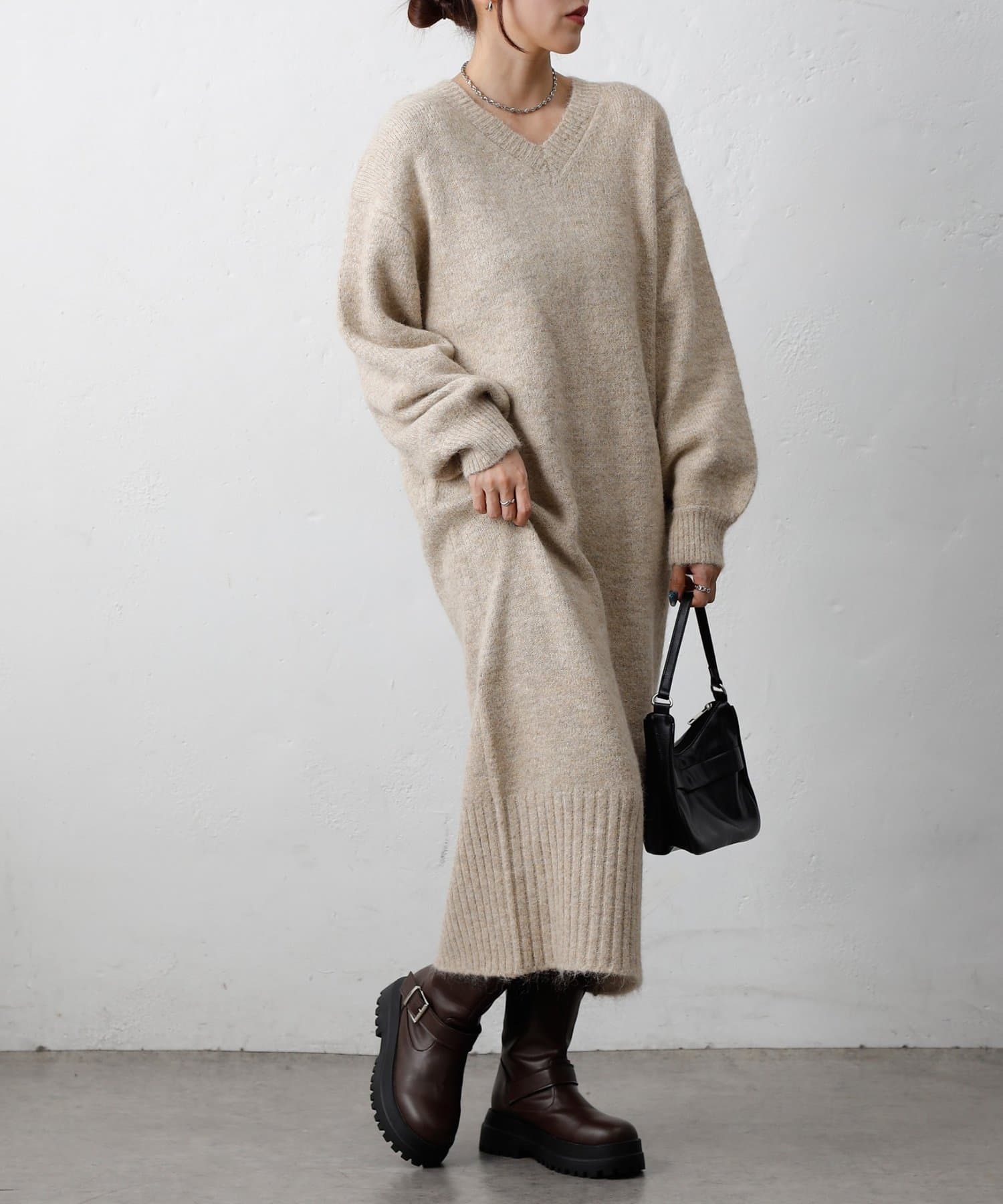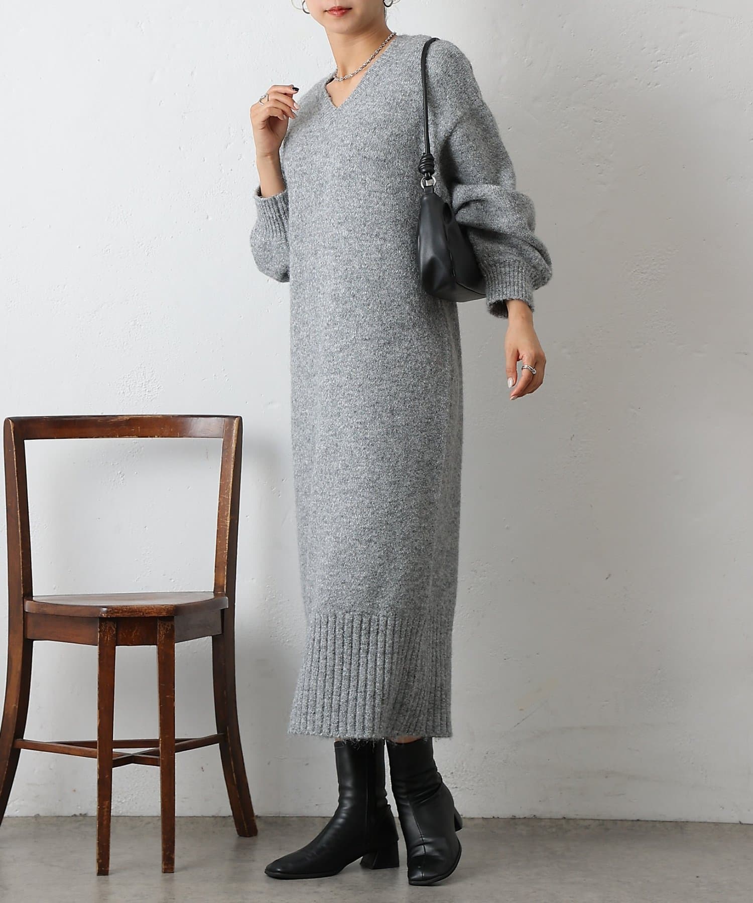 伸縮性がありストレスフリーな着心地のVネックニットワンピです。