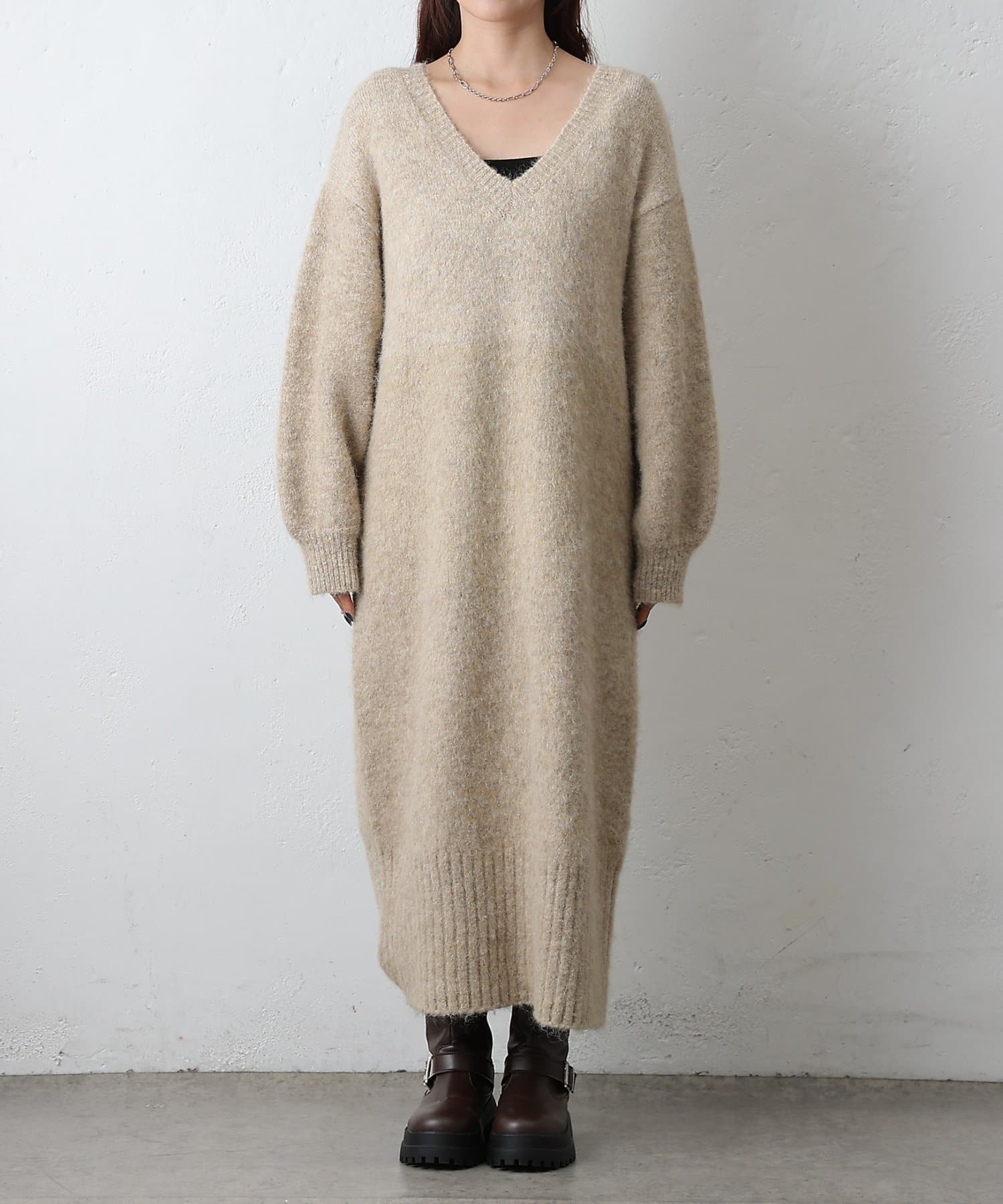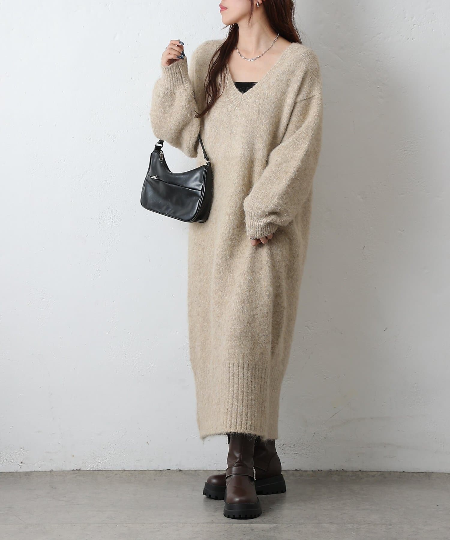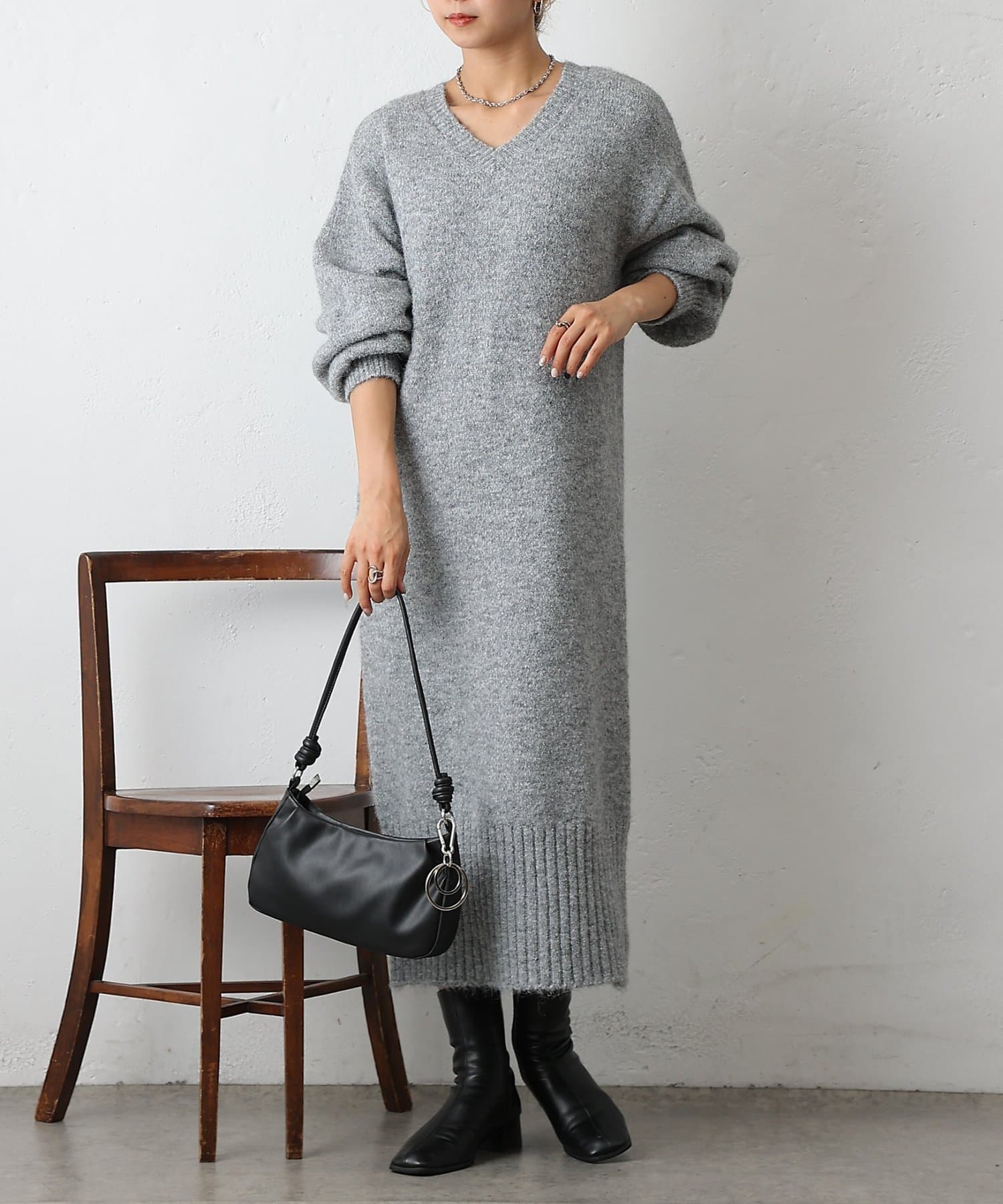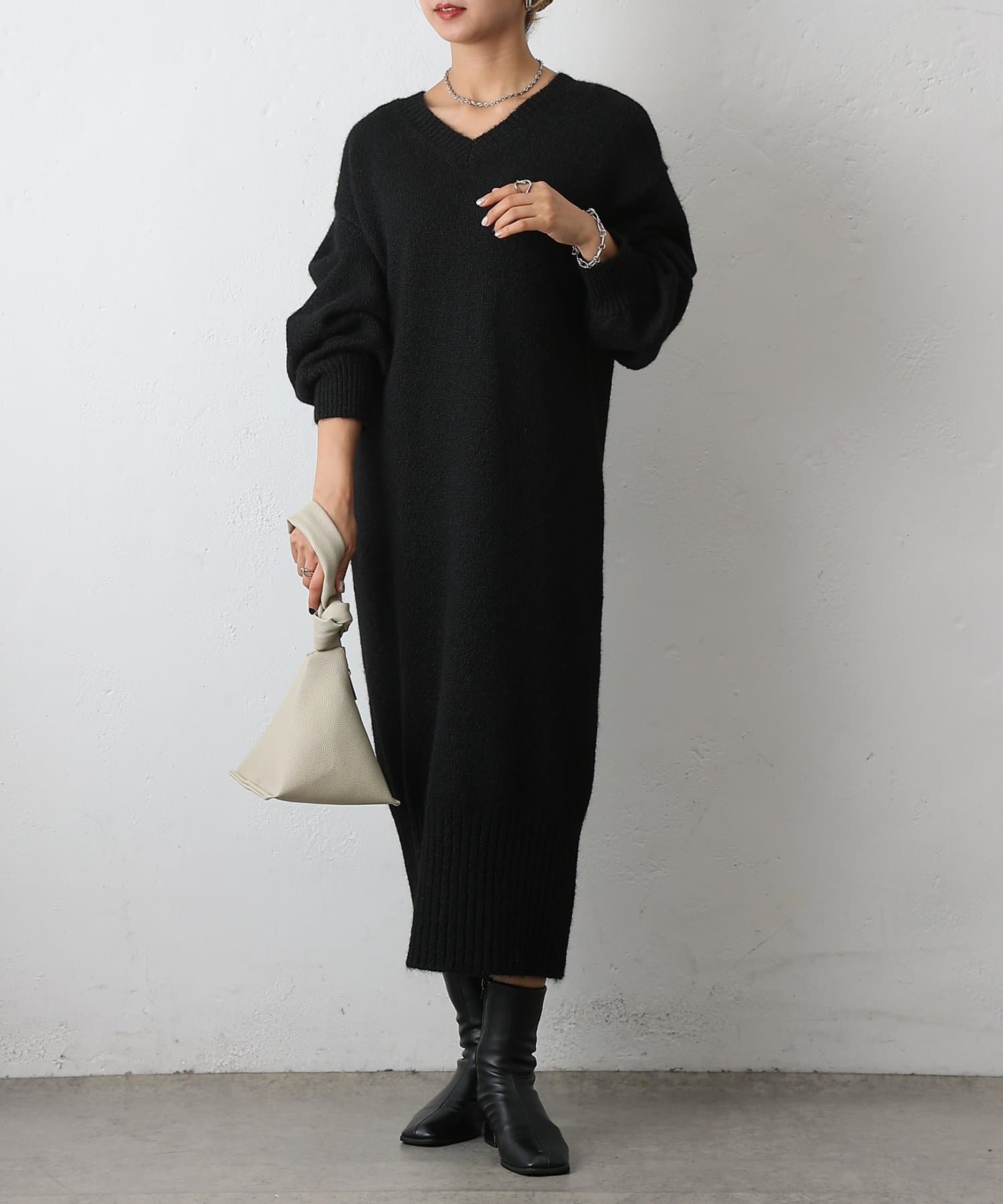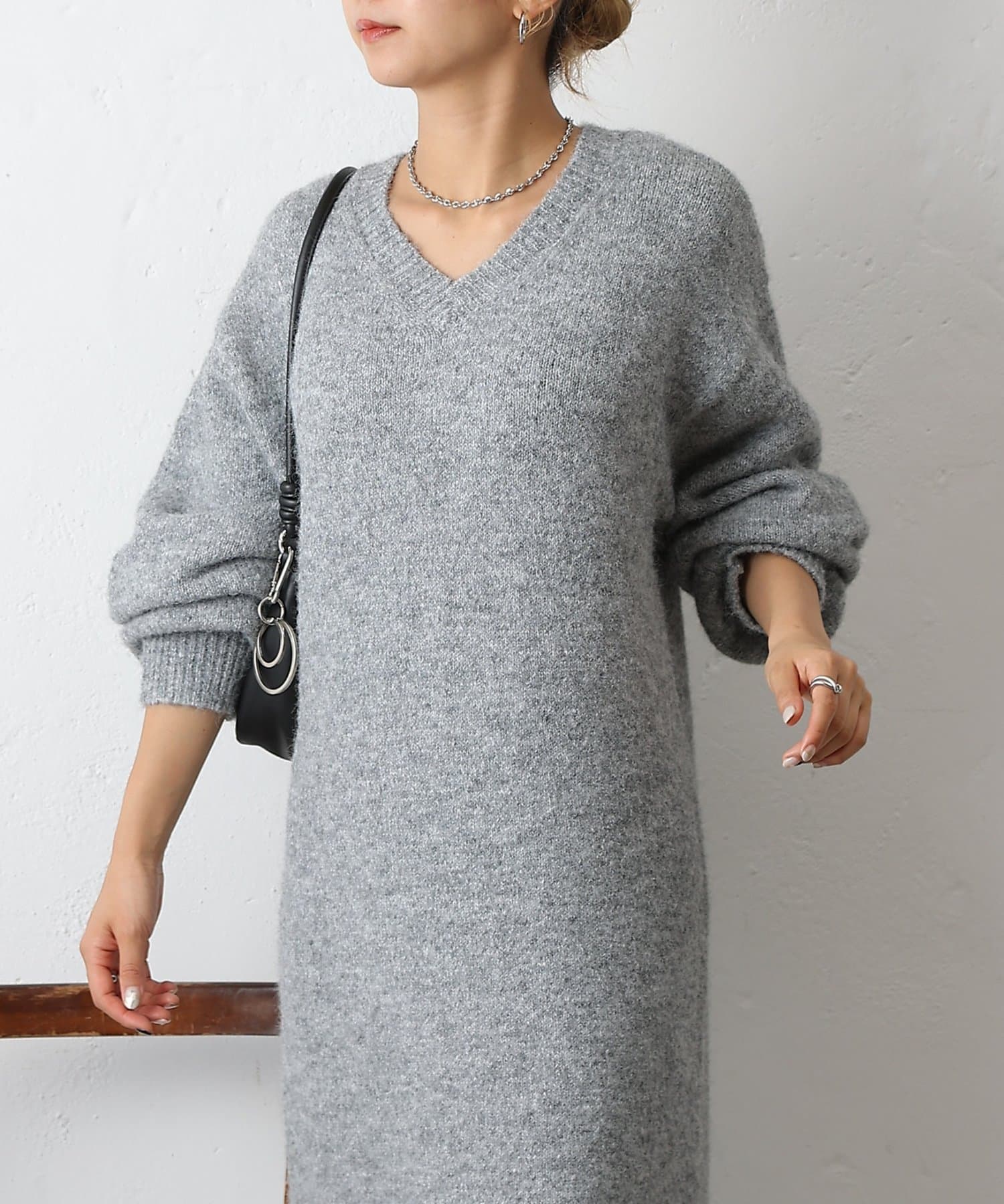 伸縮性がありストレスフリーな着心地のVネックニットワンピです。