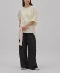 全体的にゆったりとしたラフなシルエットですが、袖や首元の切り替えや裾の太めのリブ切り替えがアクセントになっているので、ラフ過ぎない絶妙なバランスで着ていただけます。