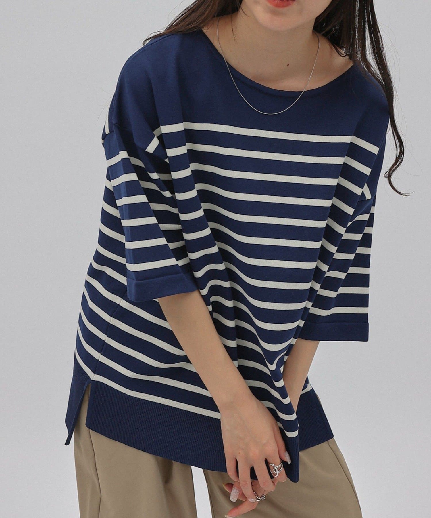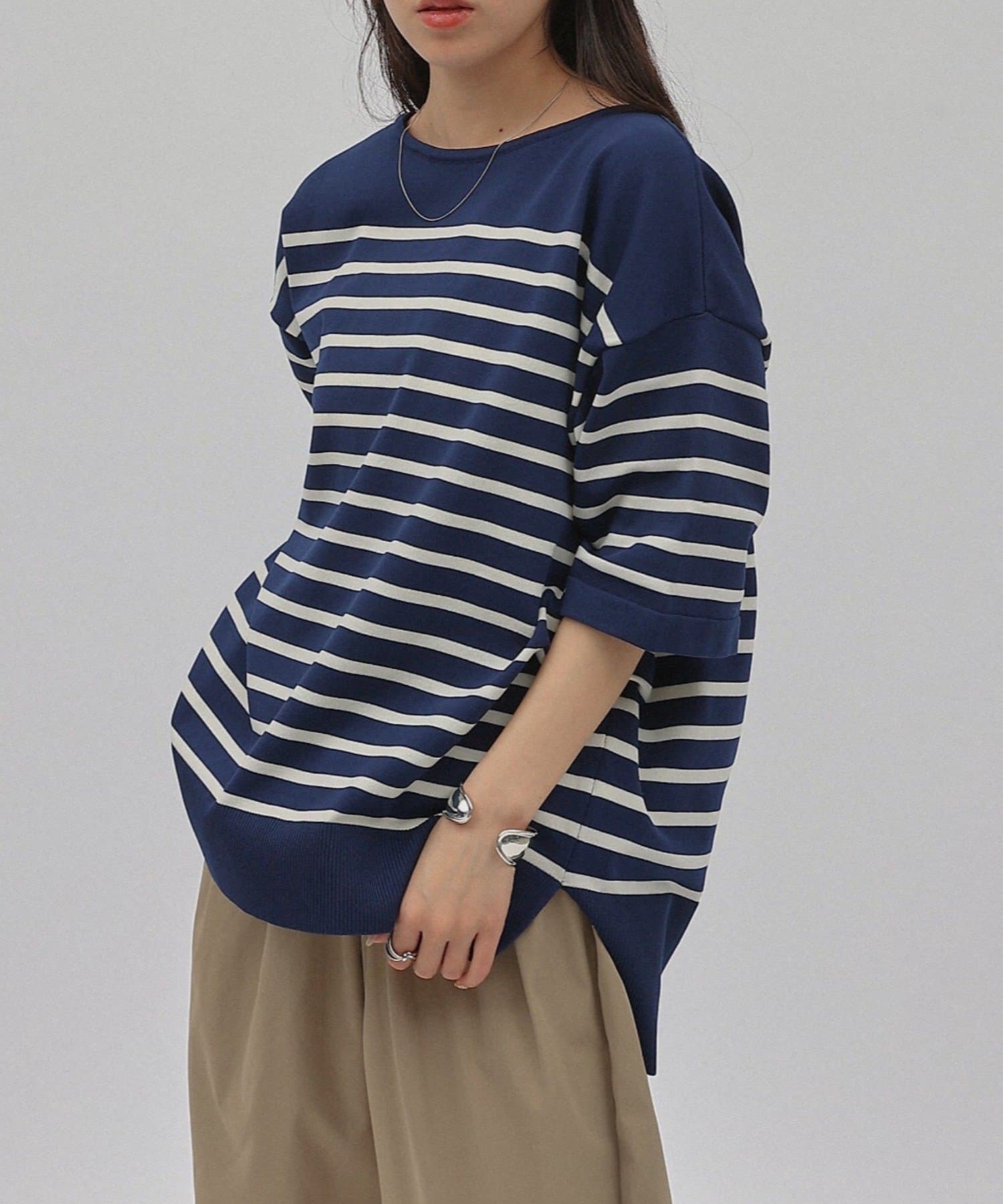 ゆとりのあるシルエットですが、首元はクルーネックですっきりな印象に。