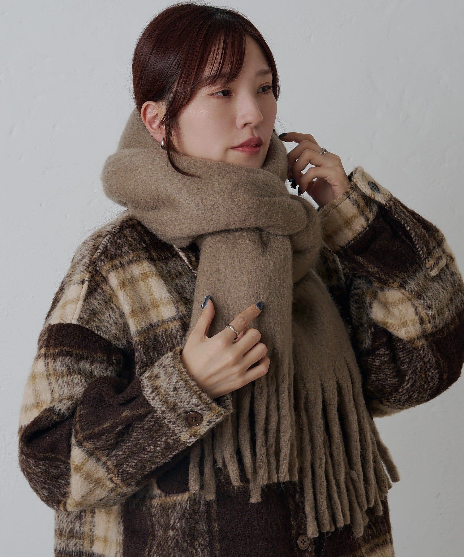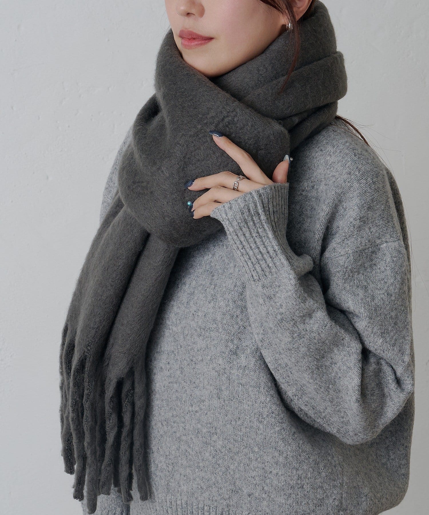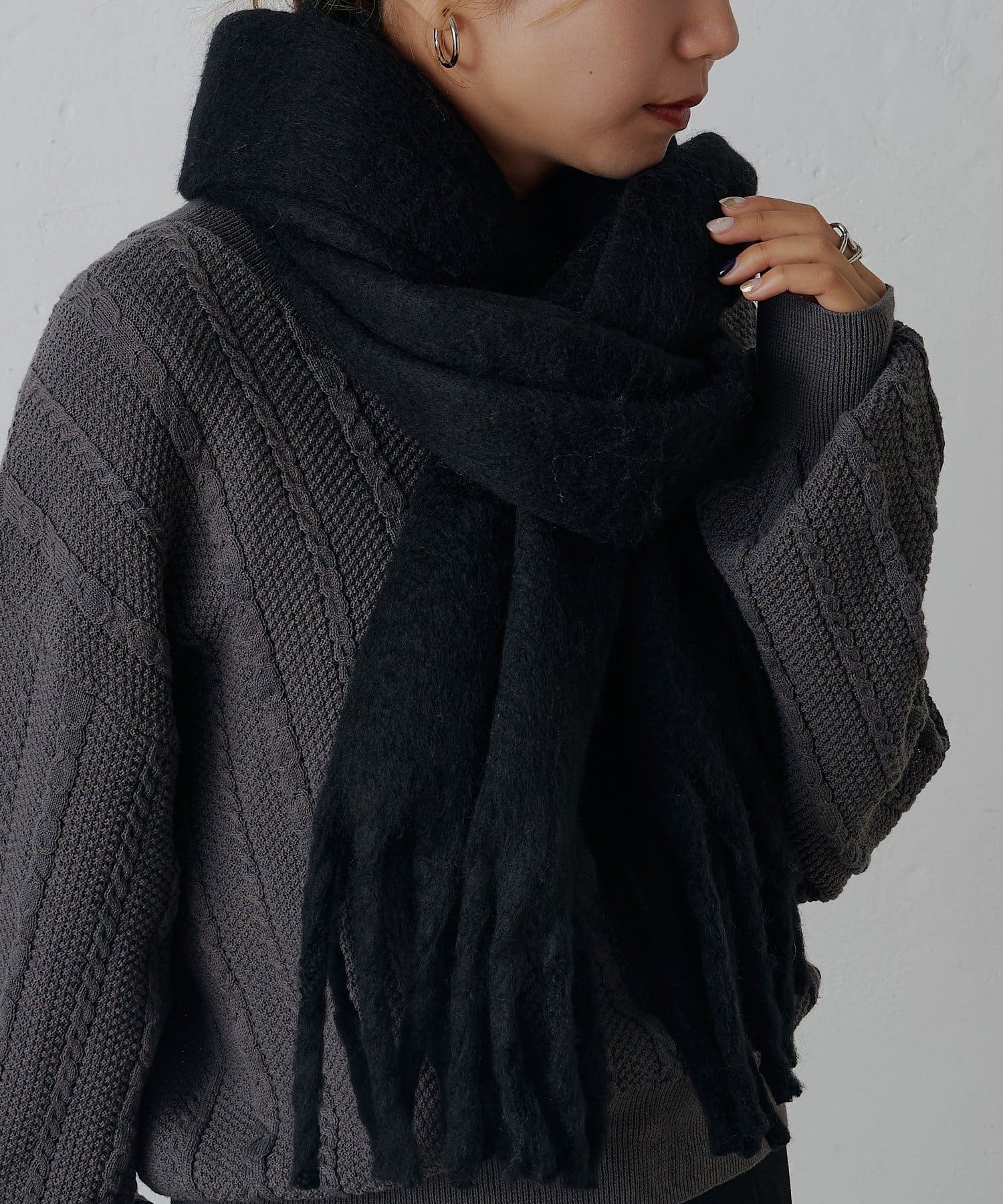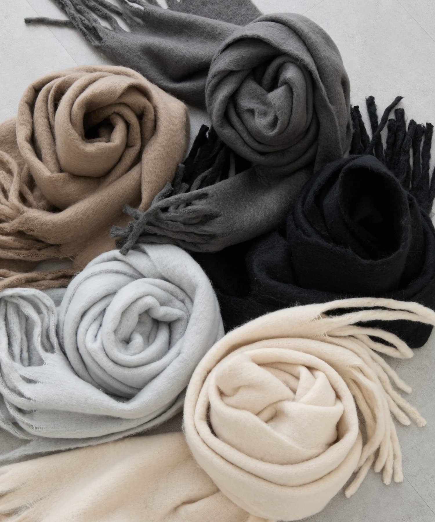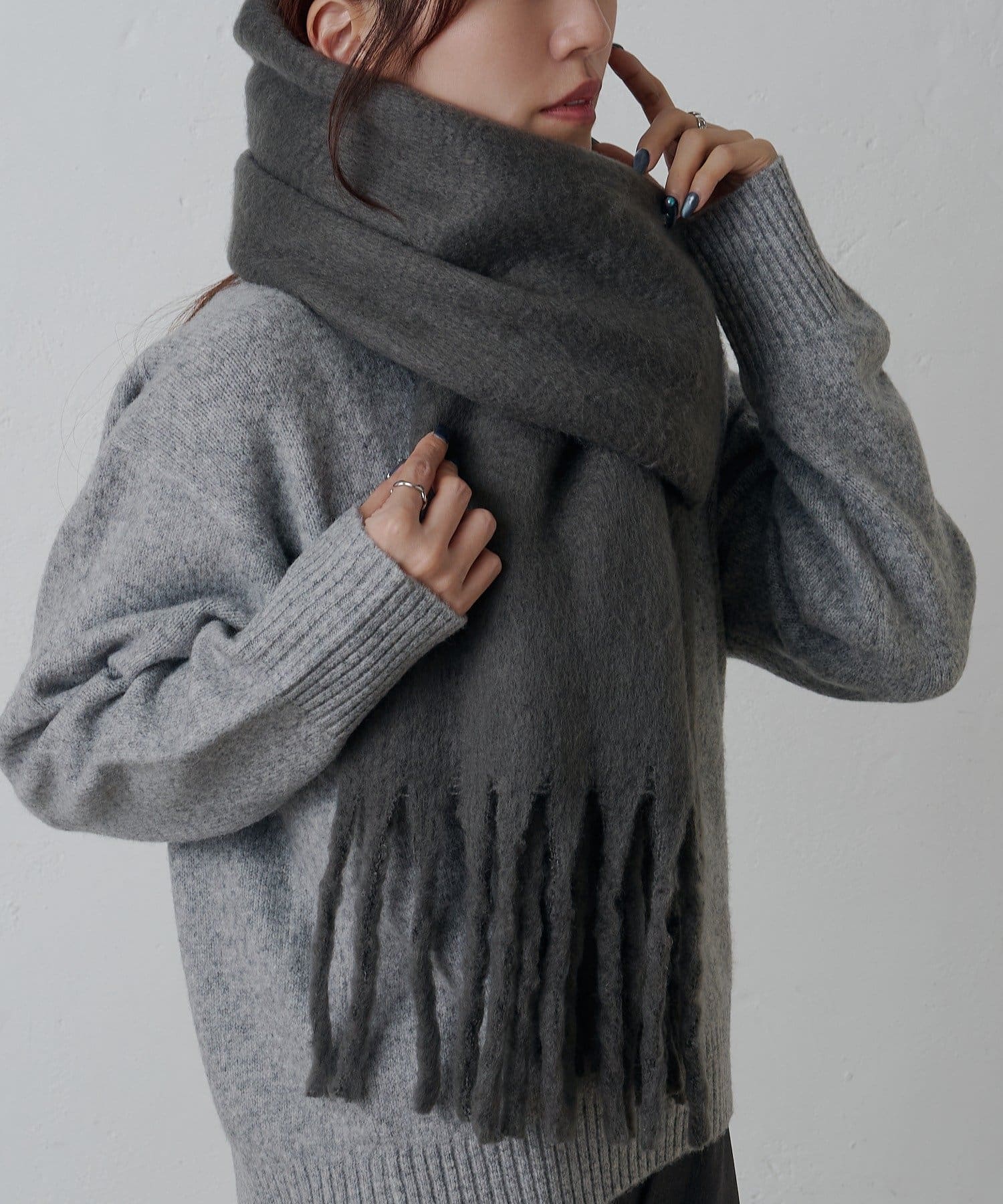 シンプルなデザインだからこそ様々なアイテムと相性が良く、合わせに困らないマフラーになっています。