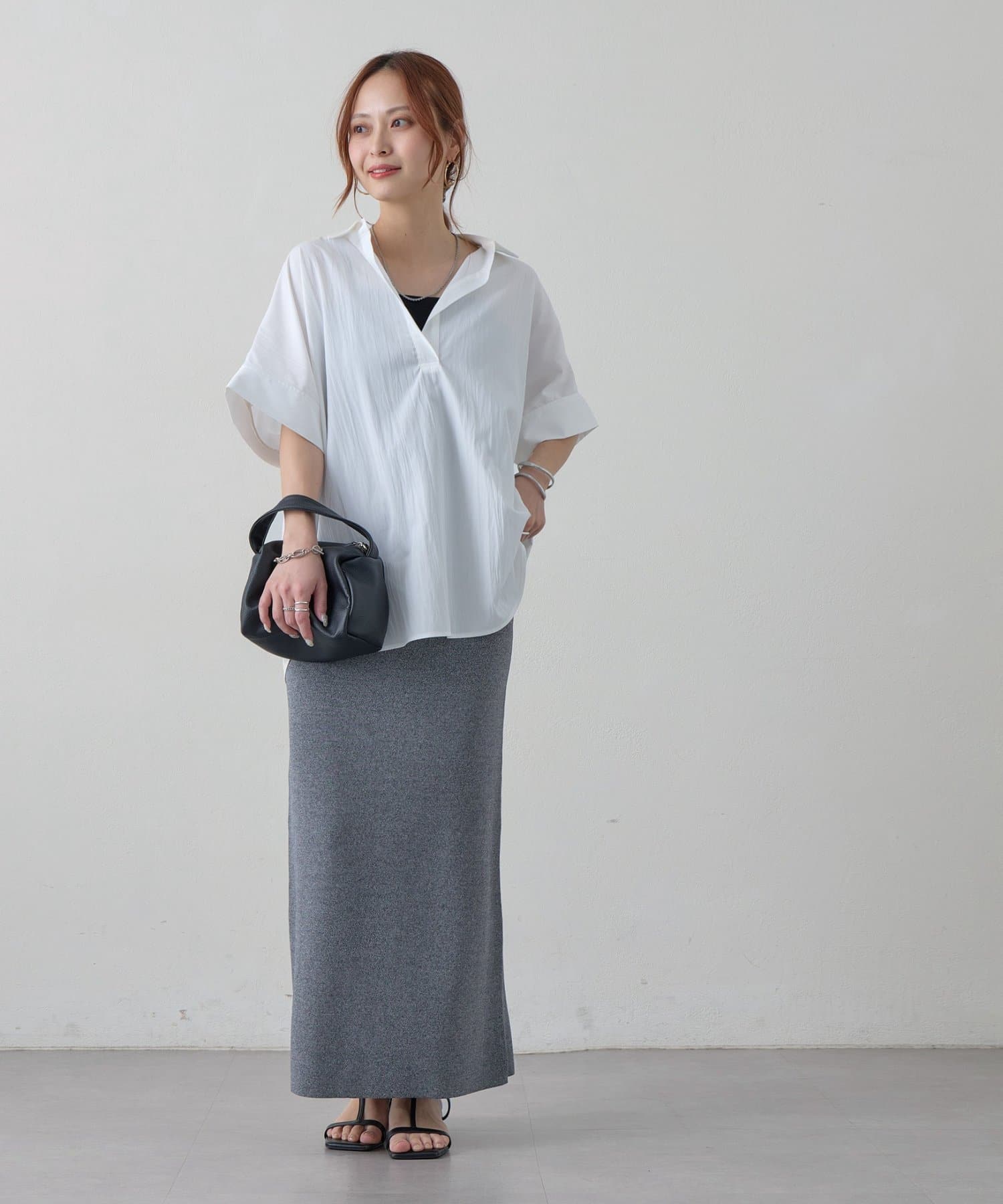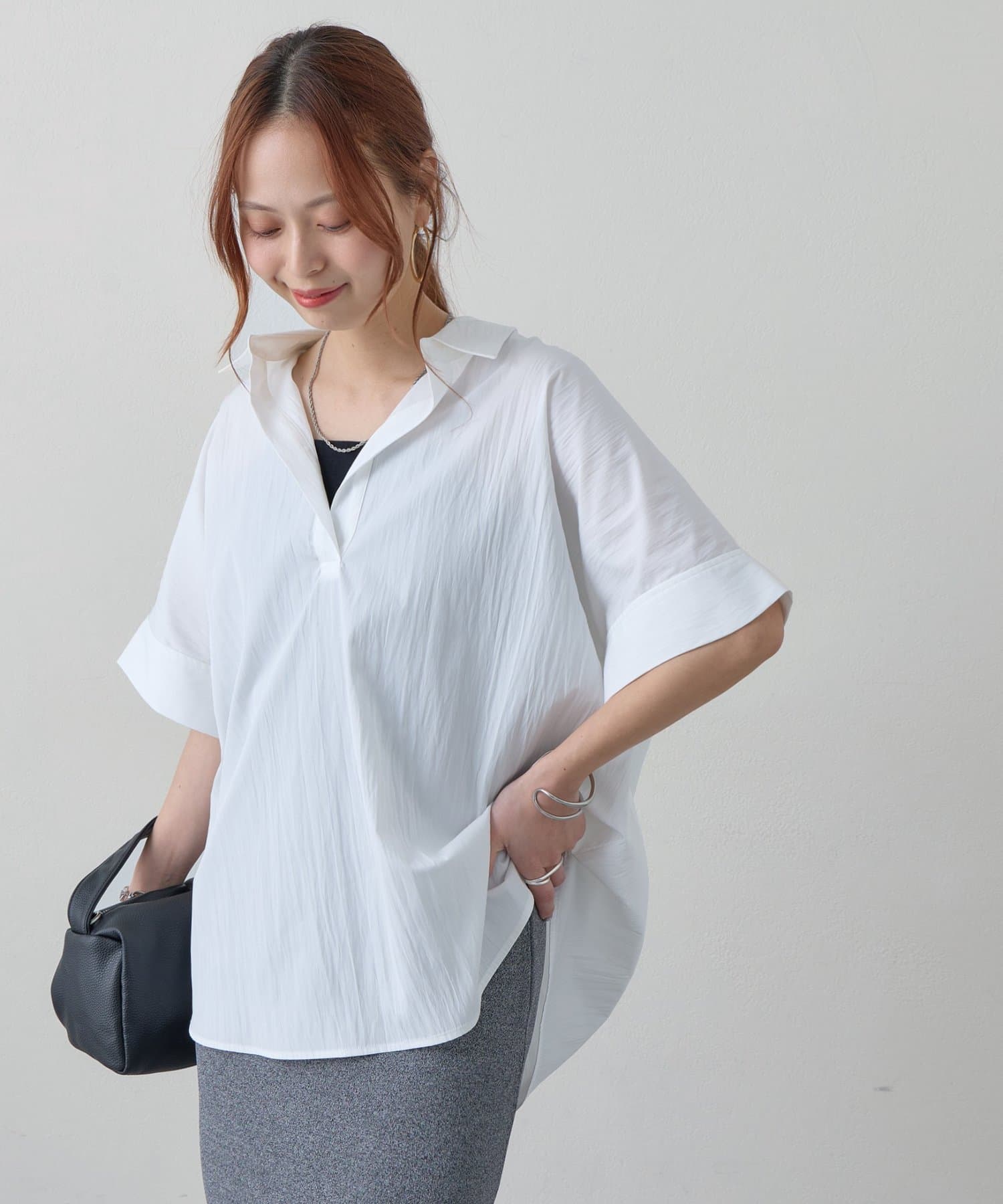 162cmスタッフ:さらっとした軽やかな生地感がとても心地よく、これからの暑い季節に大活躍間違いなし。首元のスキッパーデザインがデコルテをきれいに見せてくれて、女性らしい抜け感を演出してくれます。