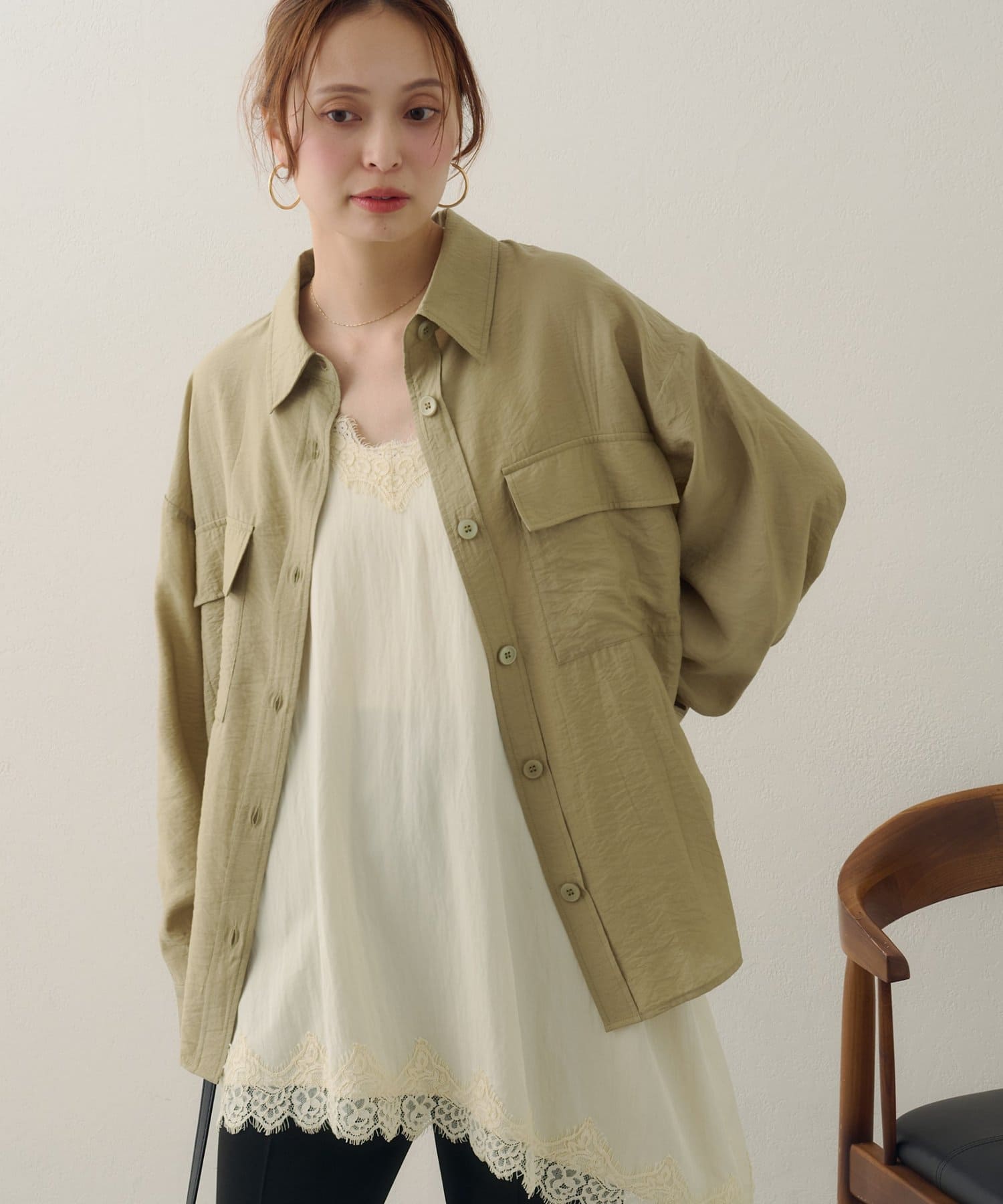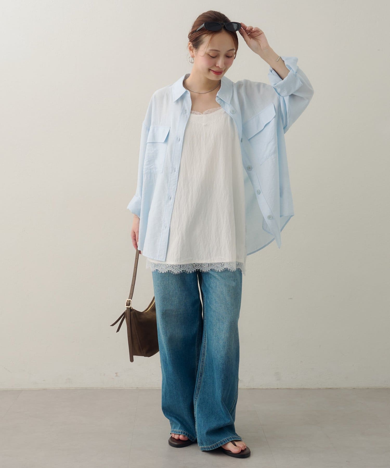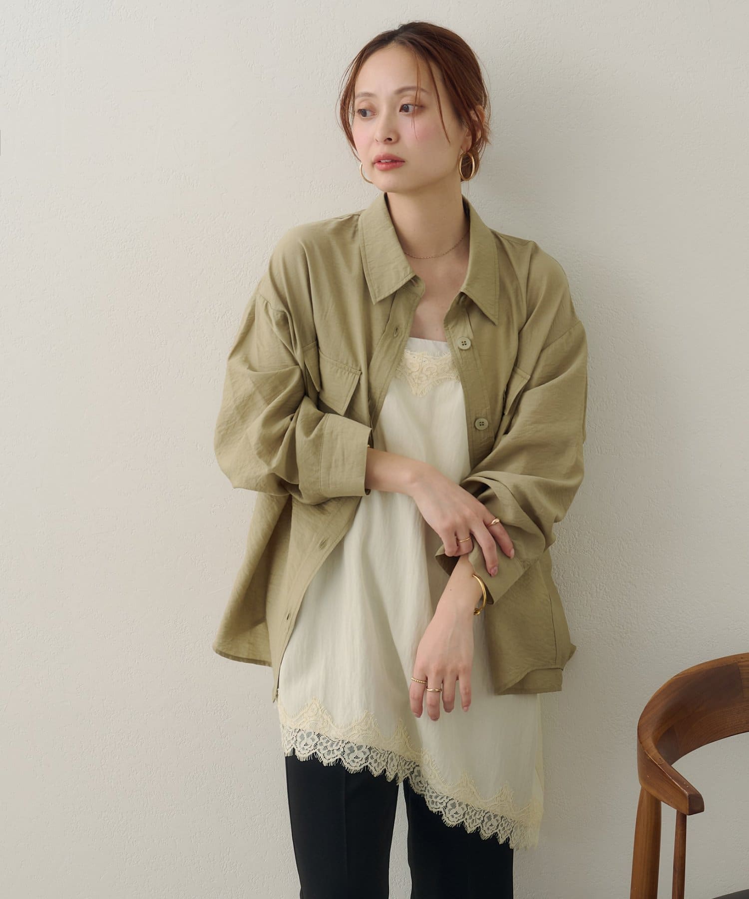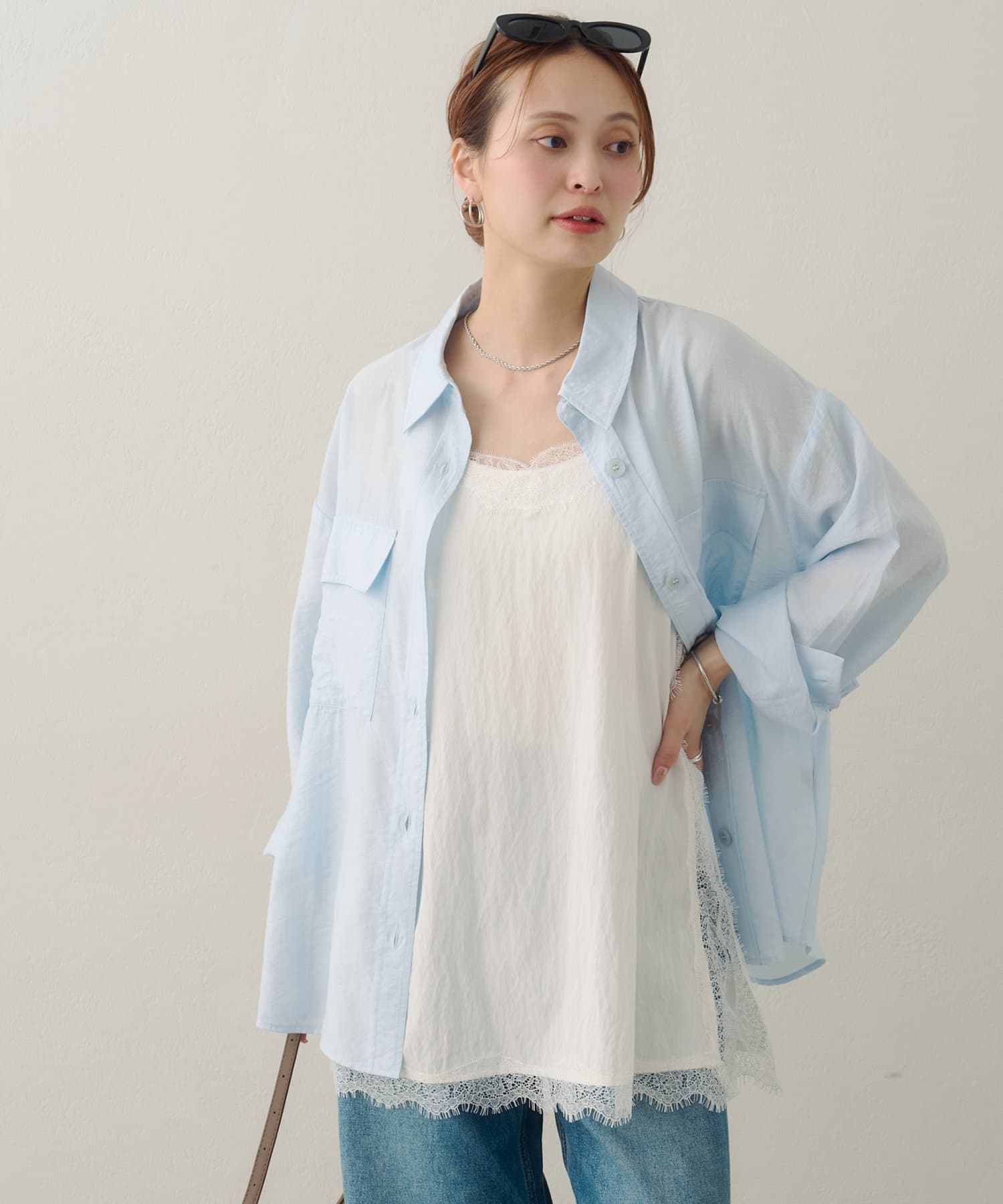 150cmスタッフ:太ももまわりまでカバーするロングな丈感で、細身のパンツとも安心して合わせられます。タンクトップの上からさらりと羽織ったサマースタイルをたくさん楽しみたいです♪袖をまくってラフに着こなすと、こなれ感が出るのでおすすめです◎