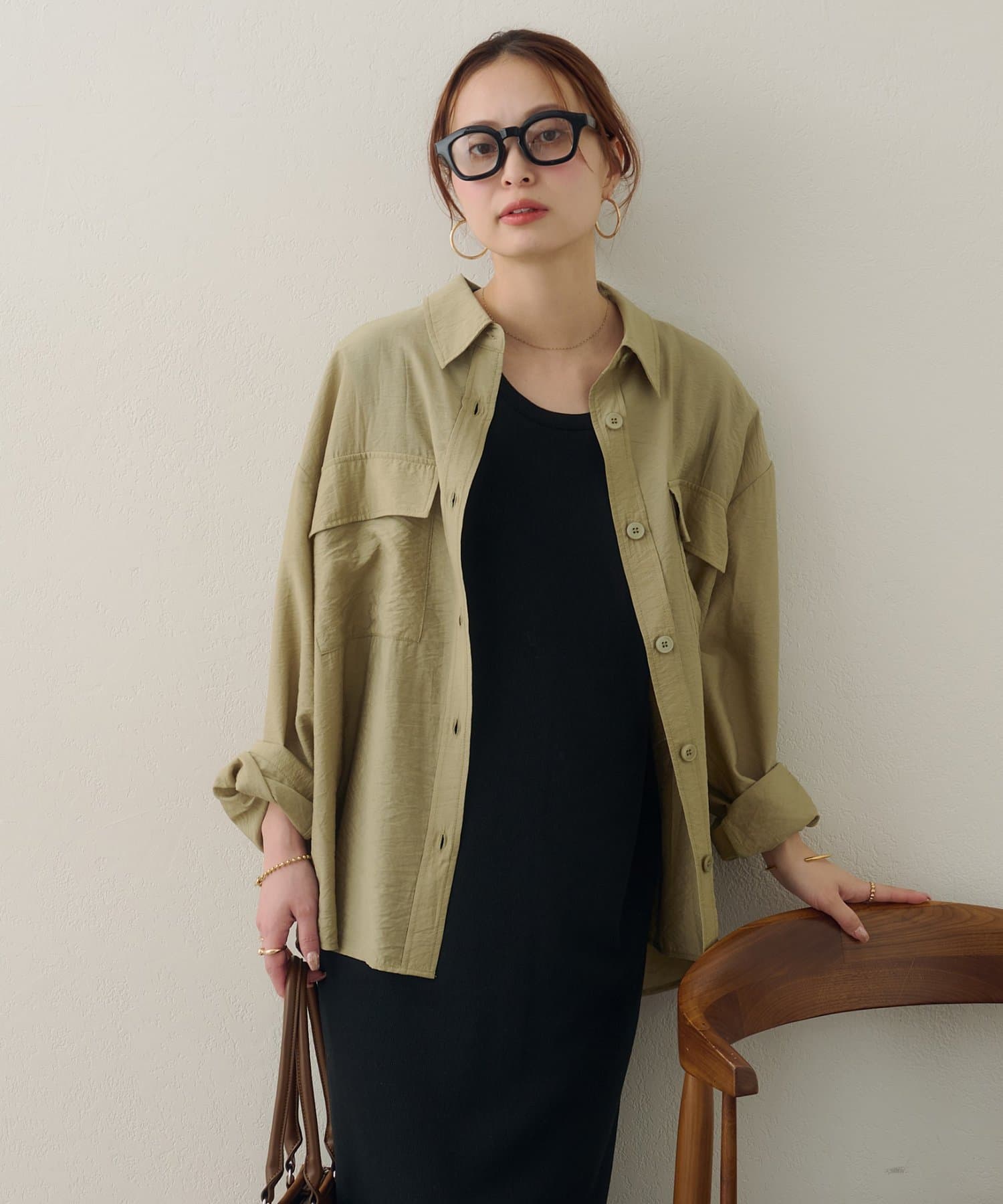 ・大きめのボタンとフロントポケットが着こなしのアクセントに