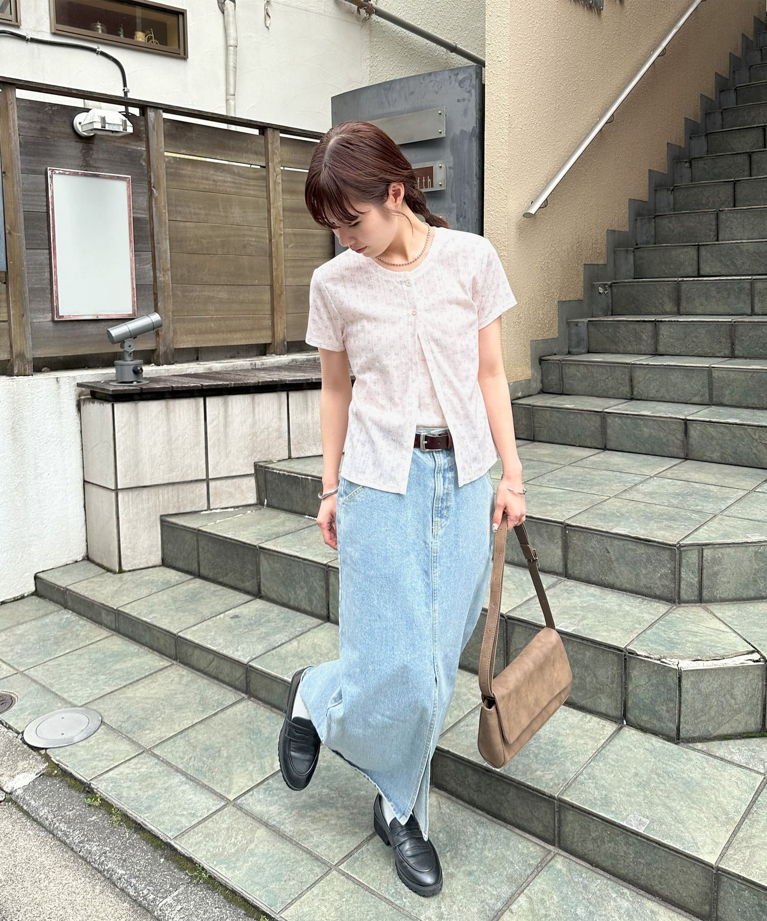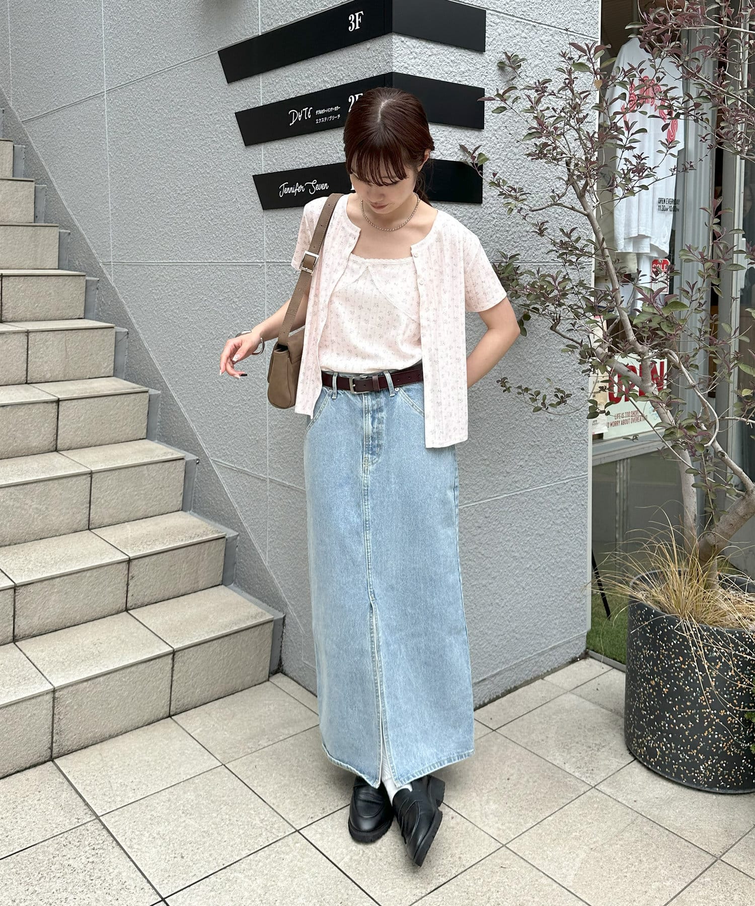 カーディガンはあえて2つボタンのデザインで、こなれた雰囲気をプラスしてくれます。