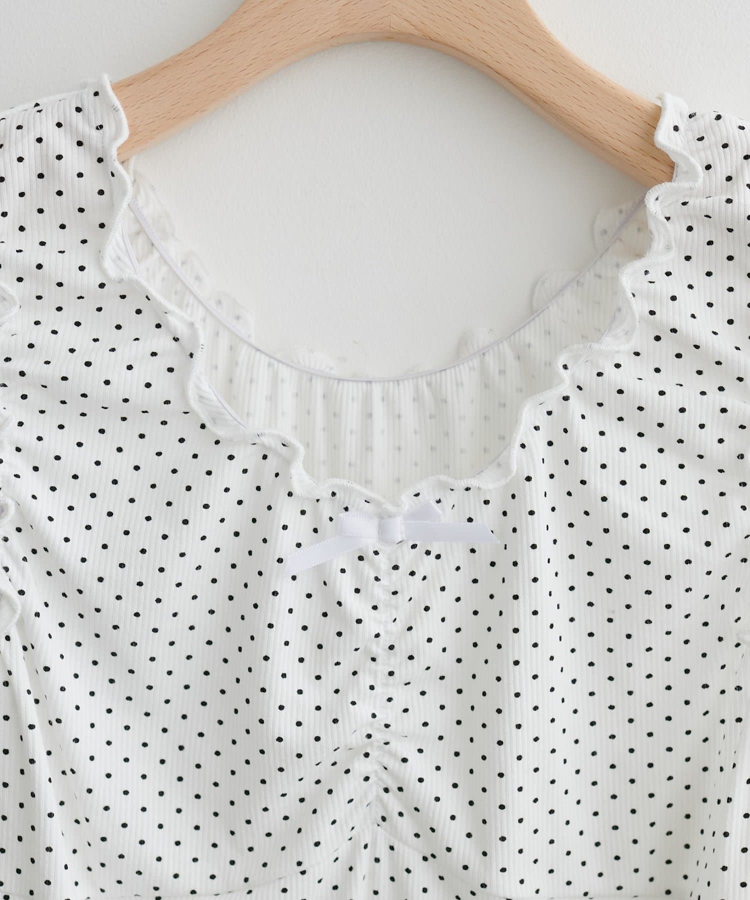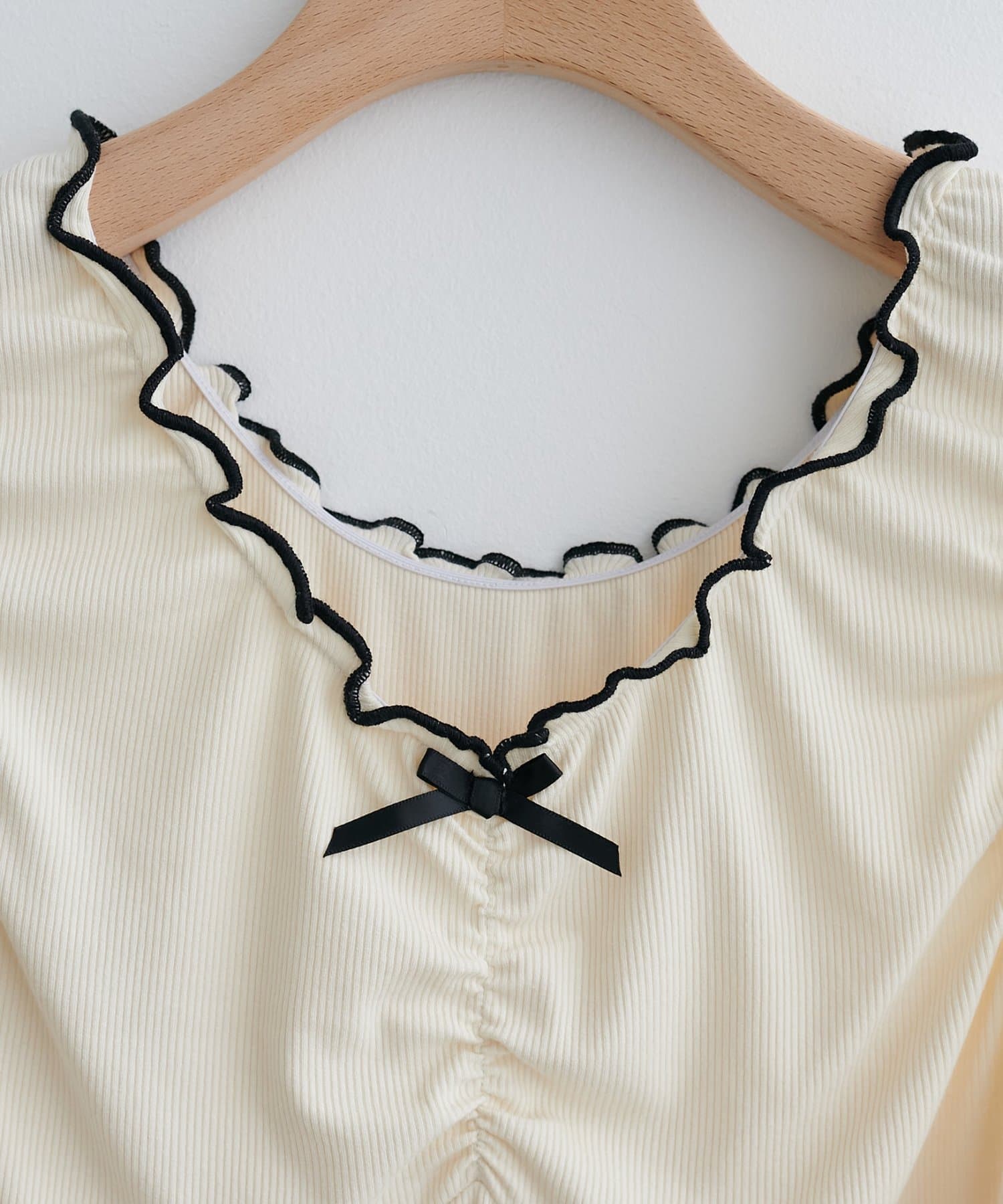 衿元・裾のメローや、胸元の小さなリボンなど、こだわりが詰まったアイテム。