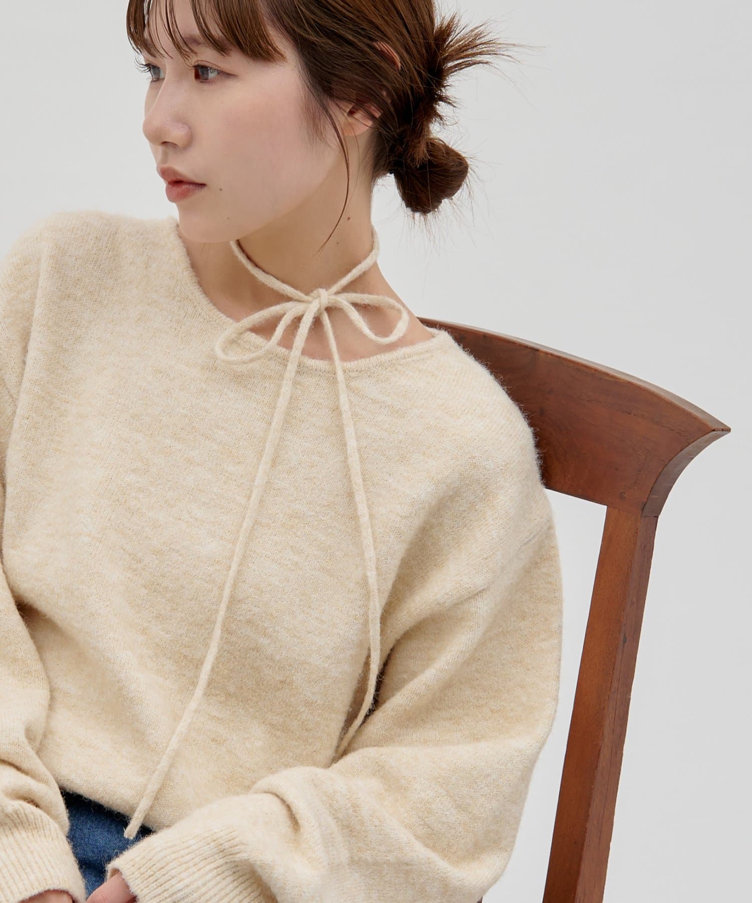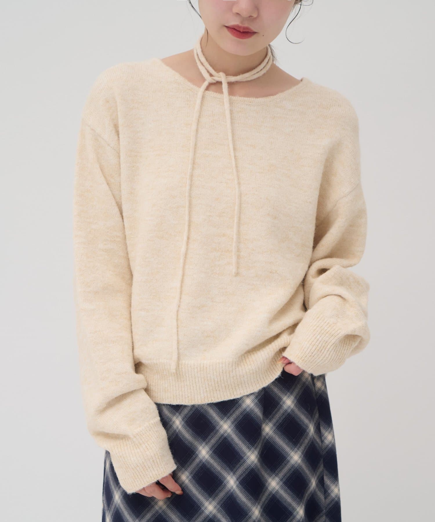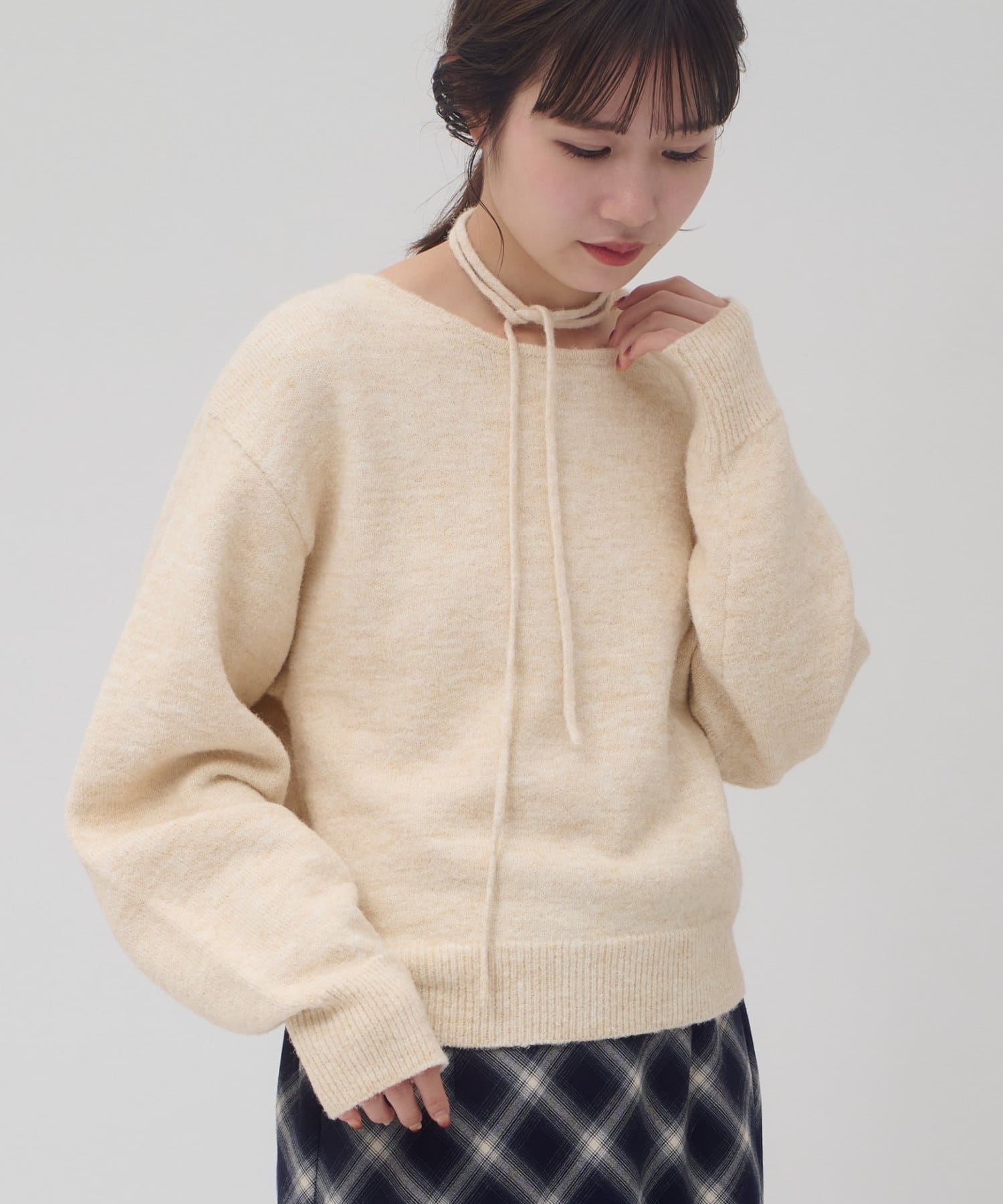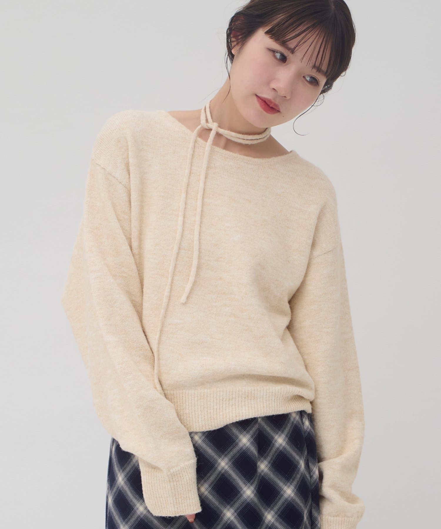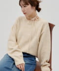 首元のリボンで今っぽさを取り入れたチョーカーニット。