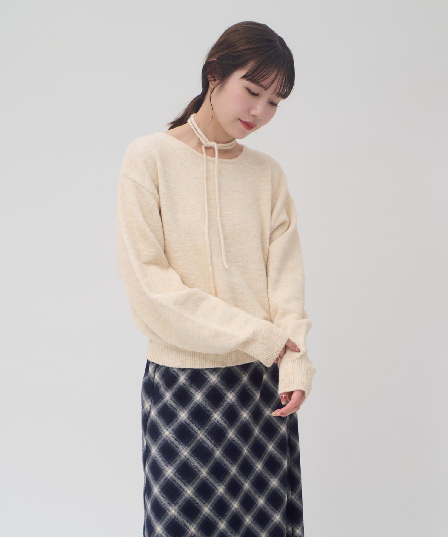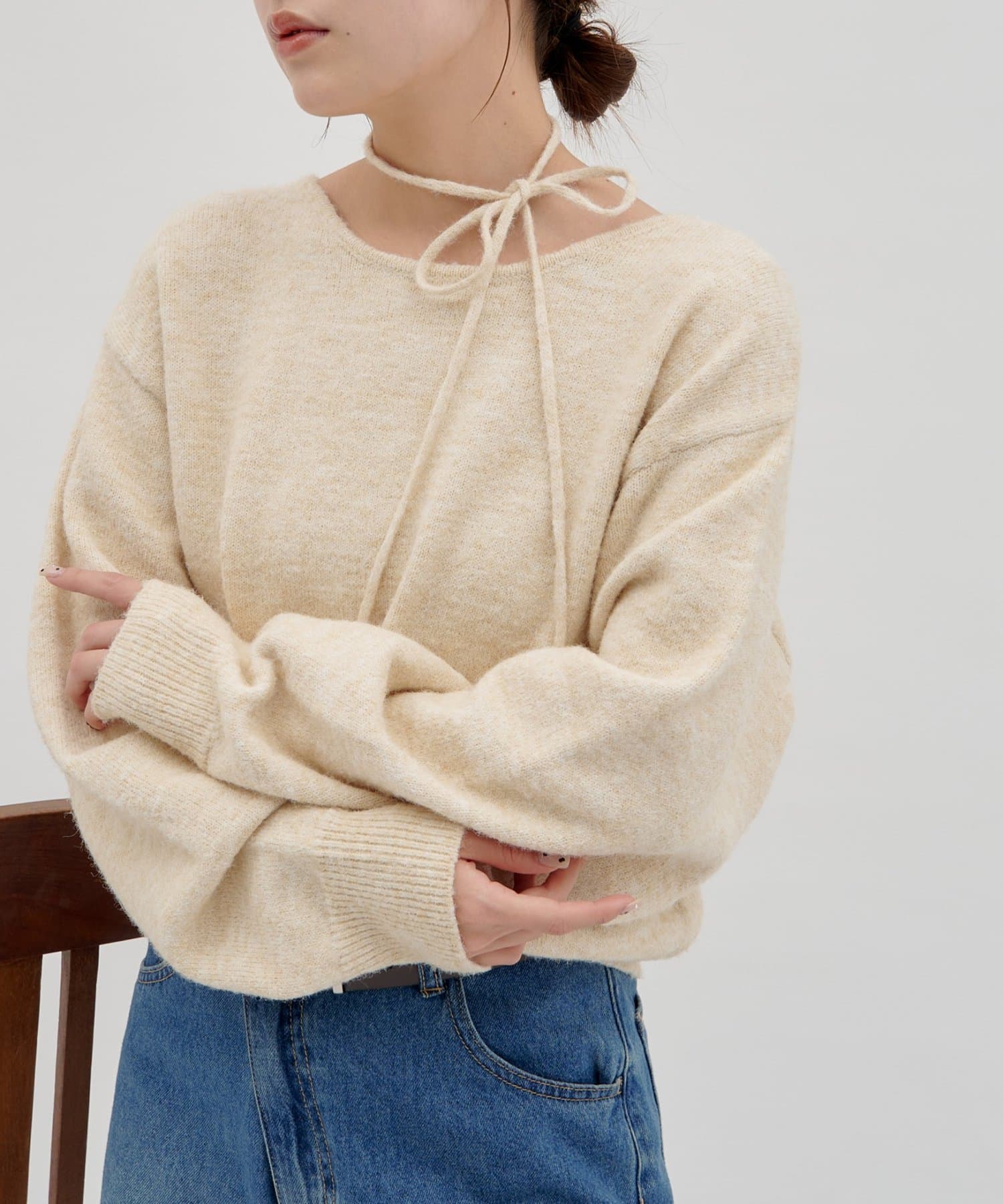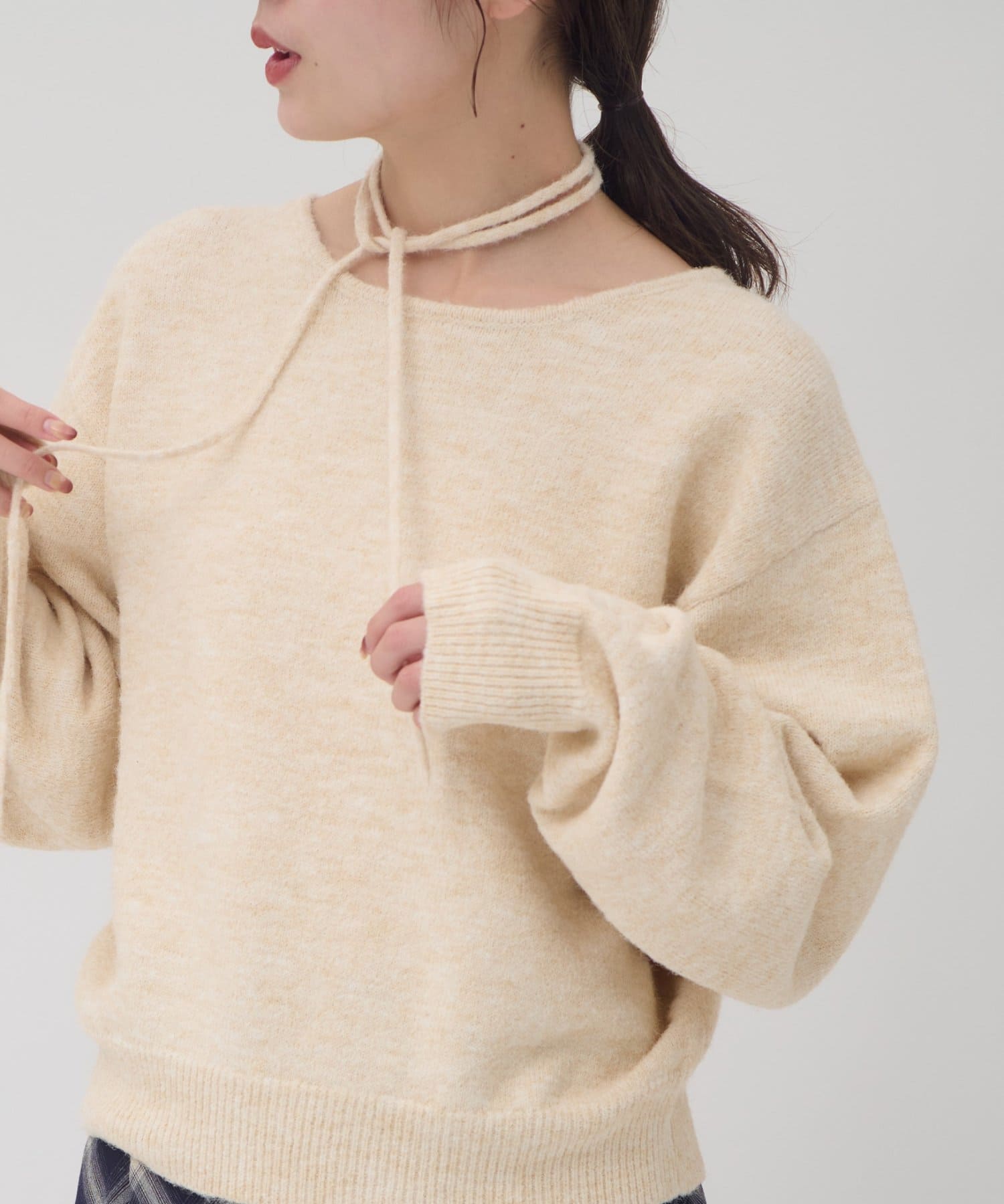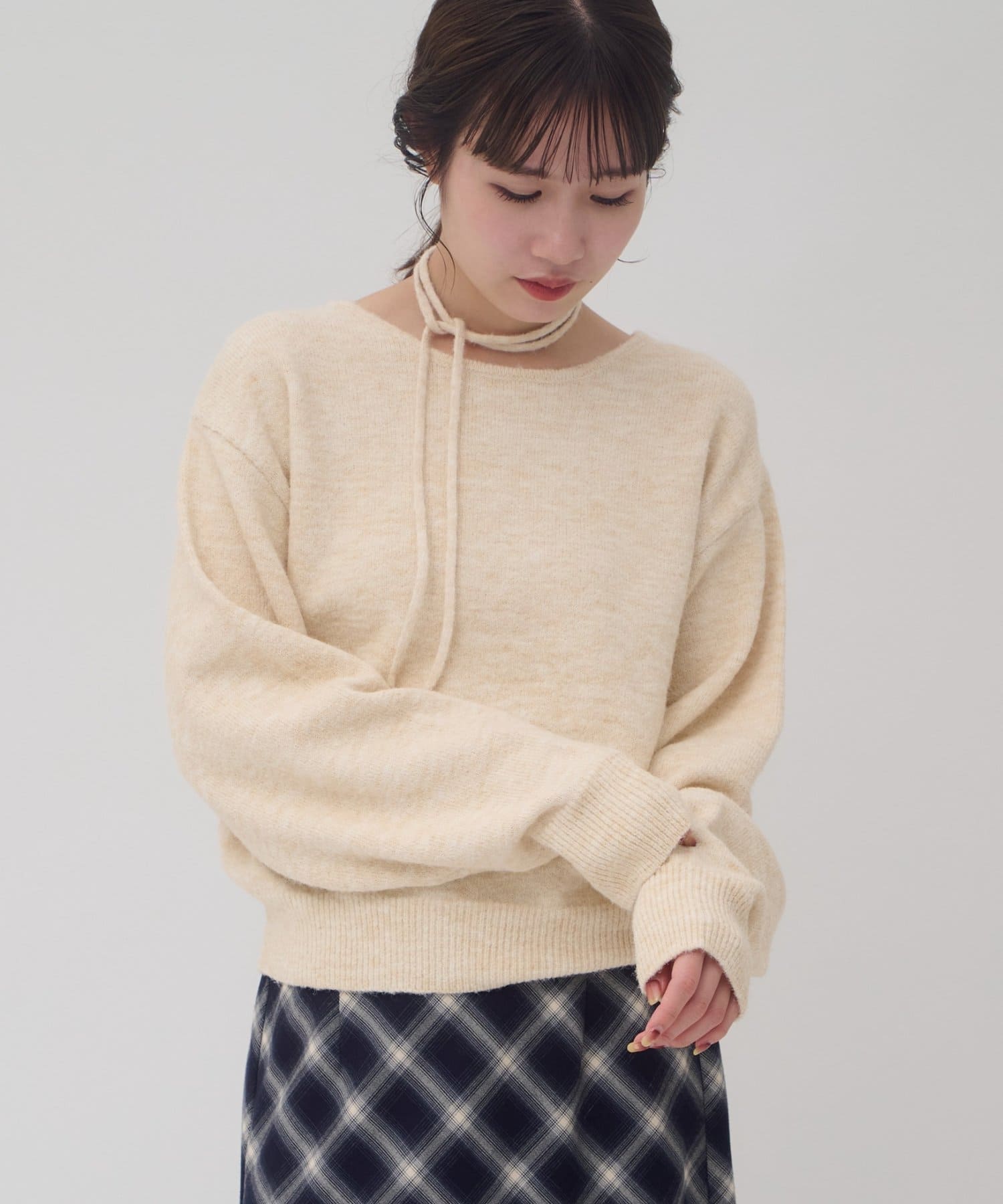 首元のリボンで今っぽさを取り入れたチョーカーニット。