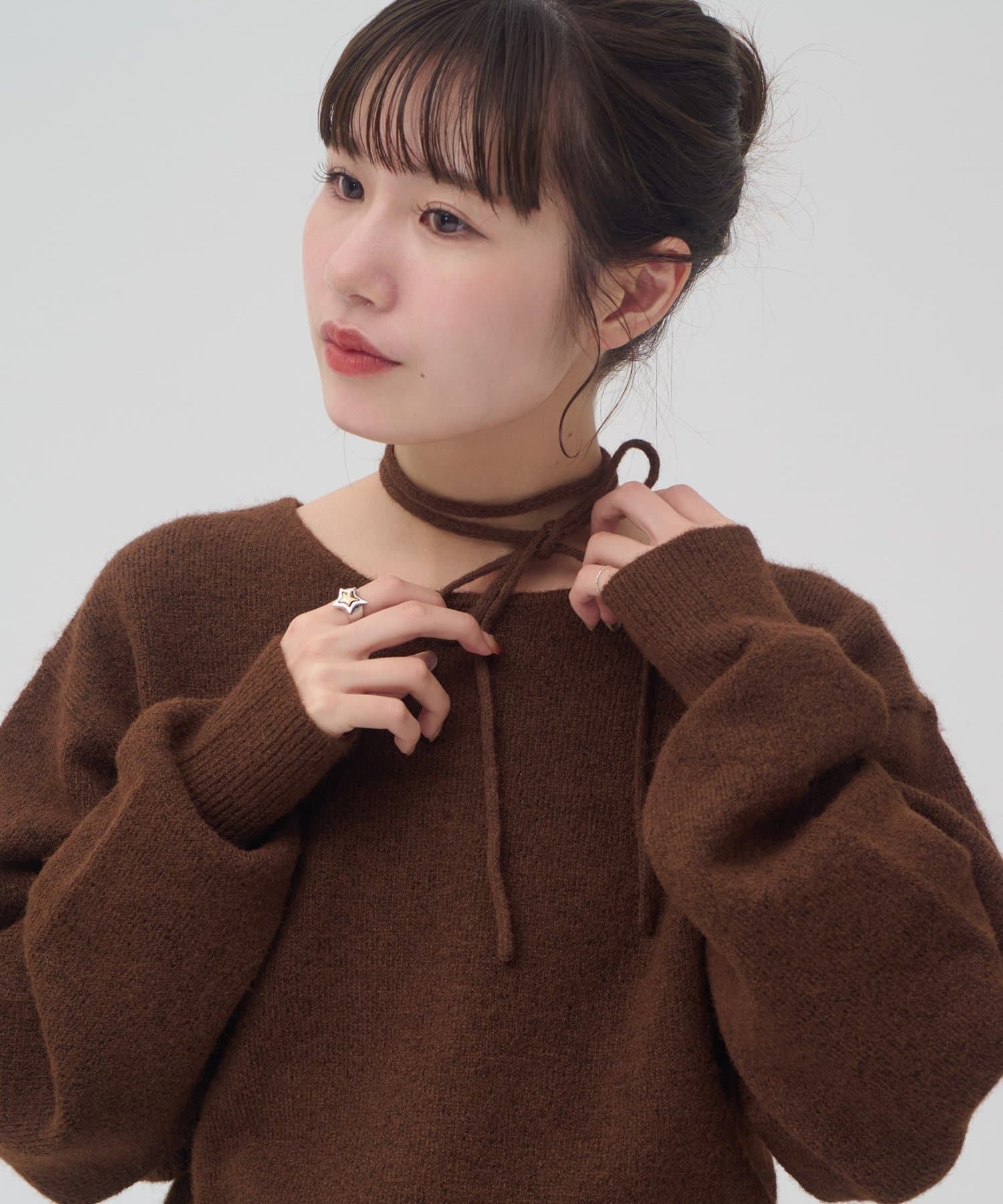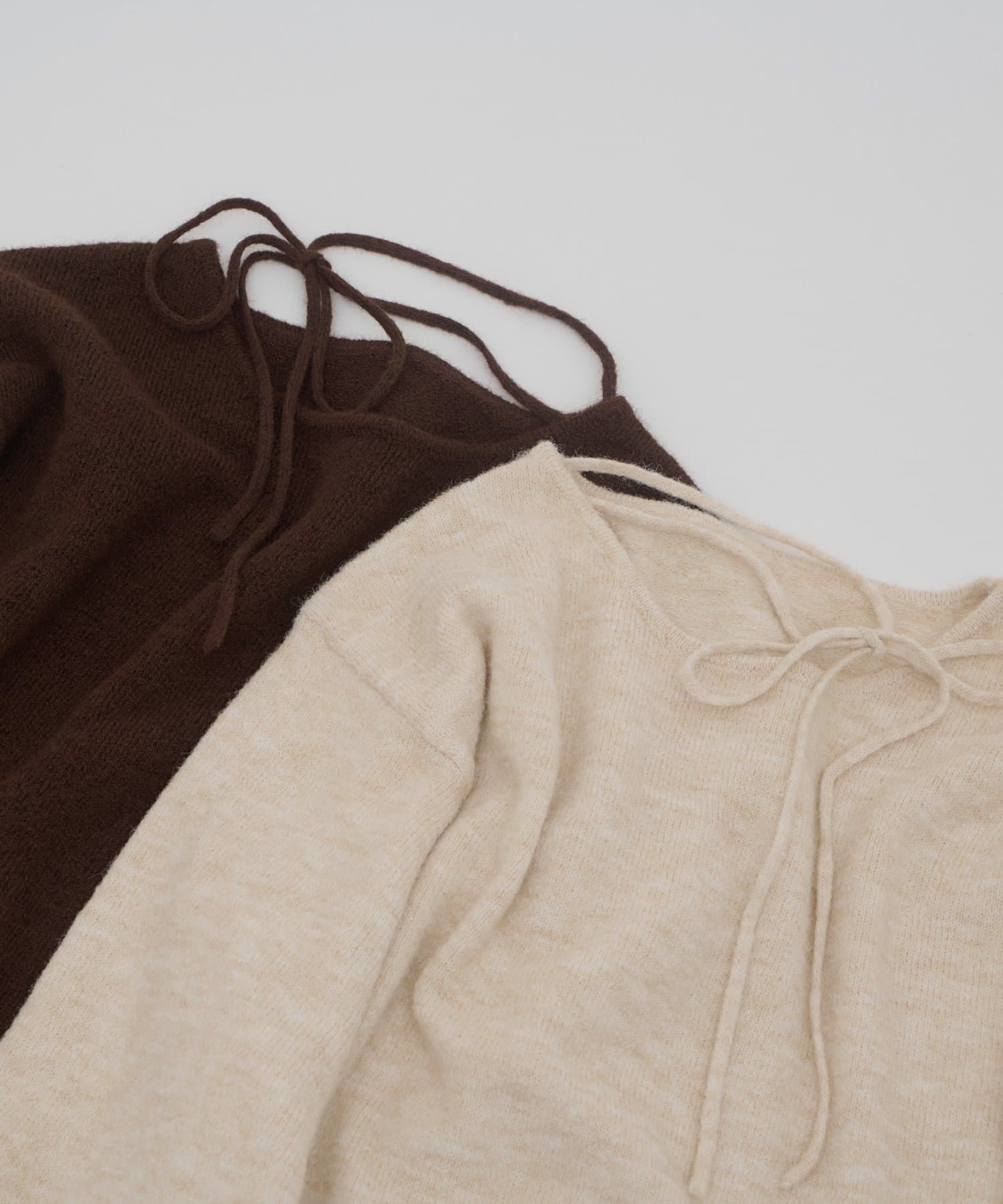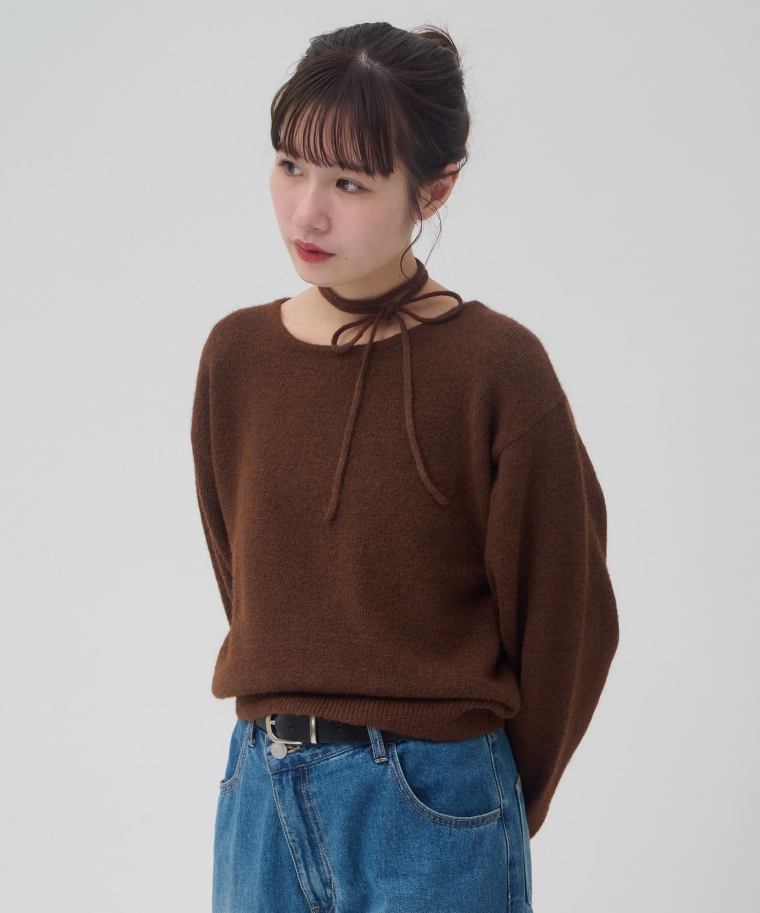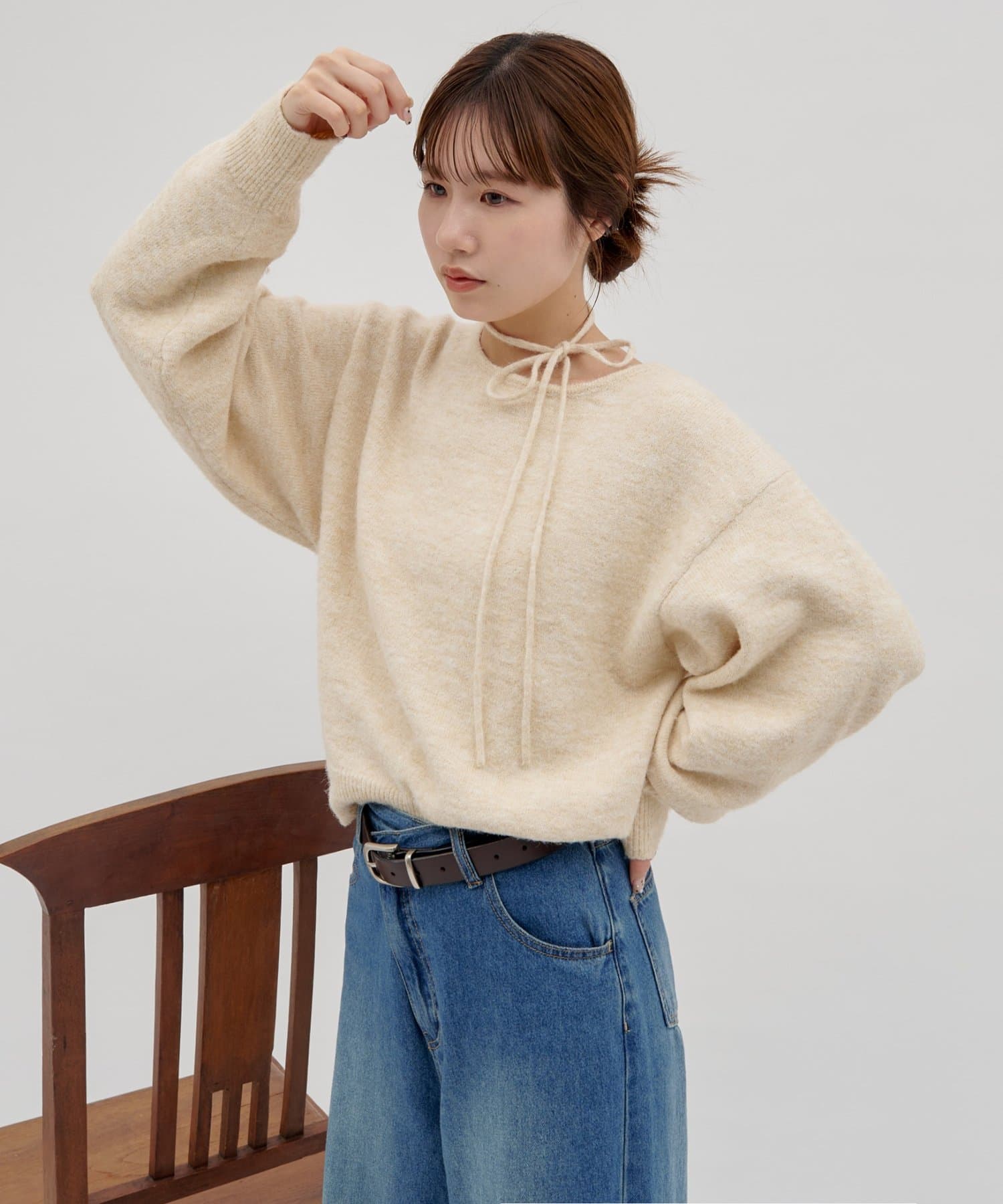 首元のリボンで今っぽさを取り入れたチョーカーニット。