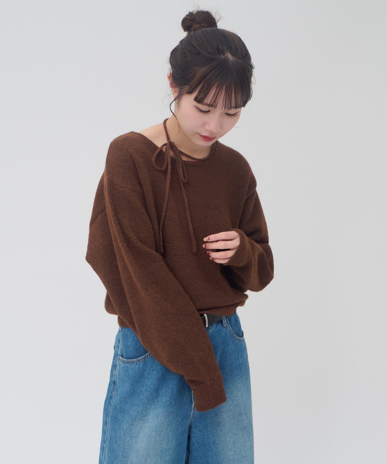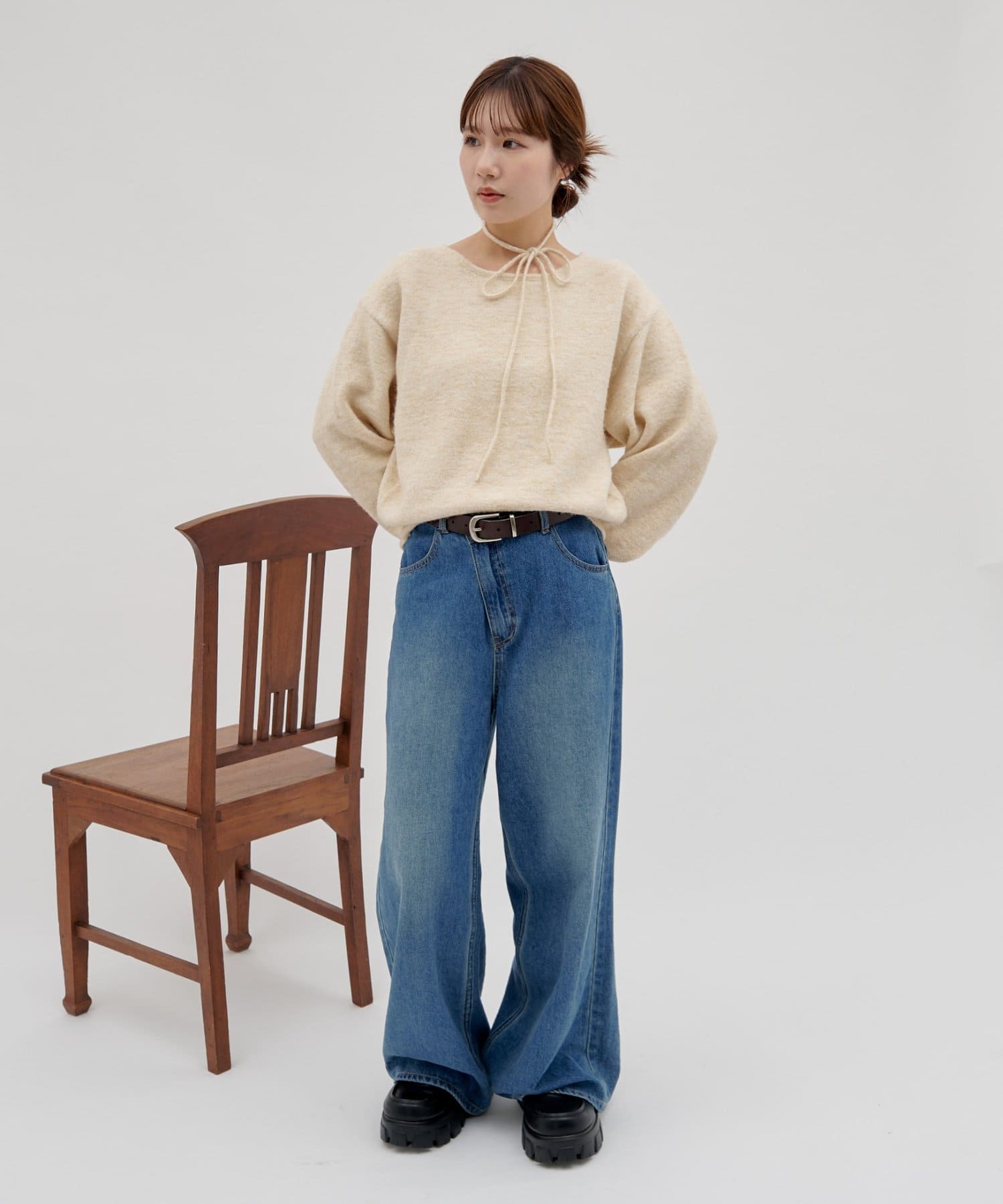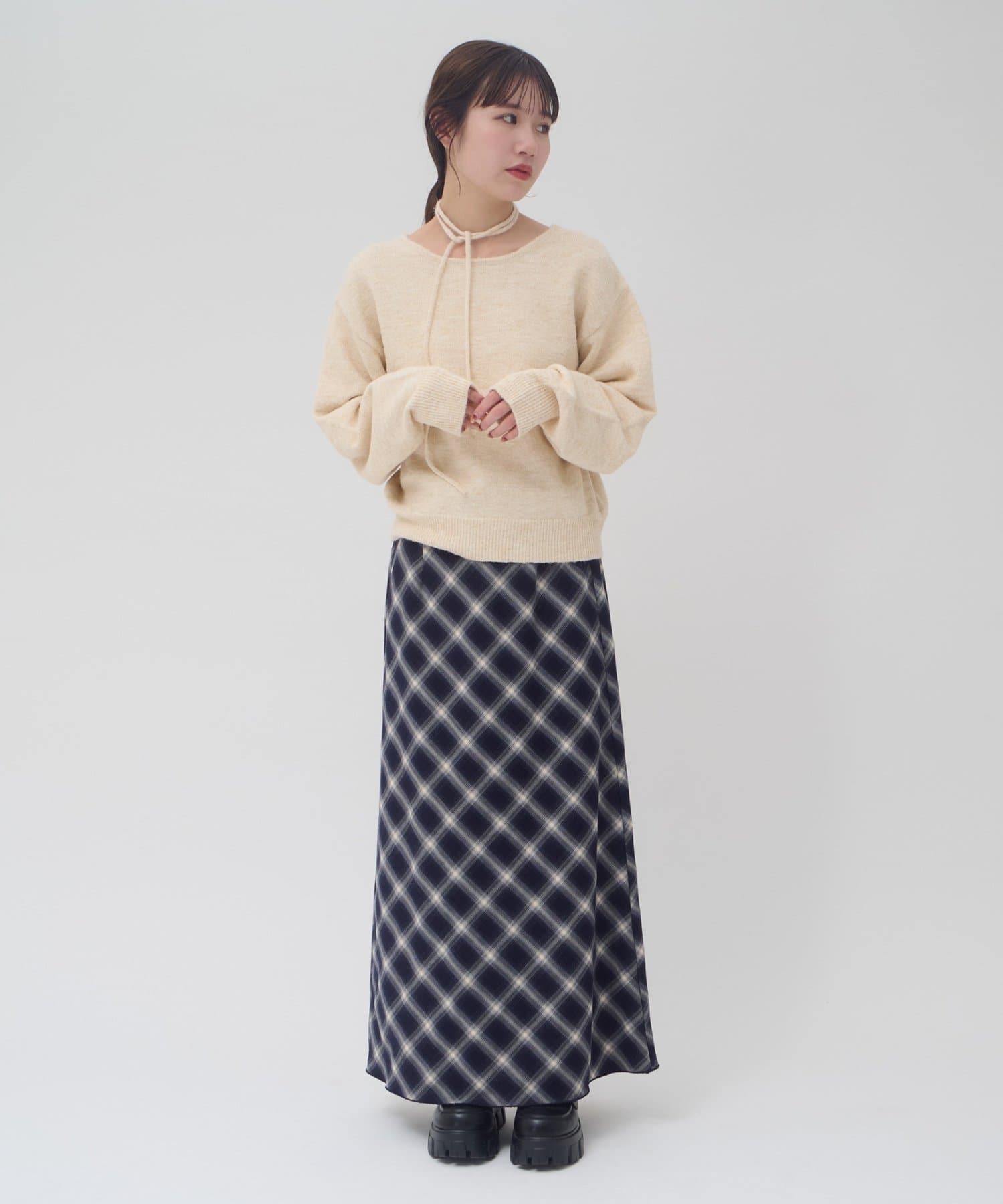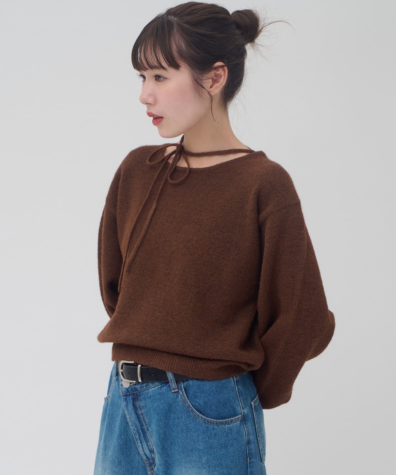 首元のリボンで今っぽさを取り入れたチョーカーニット。