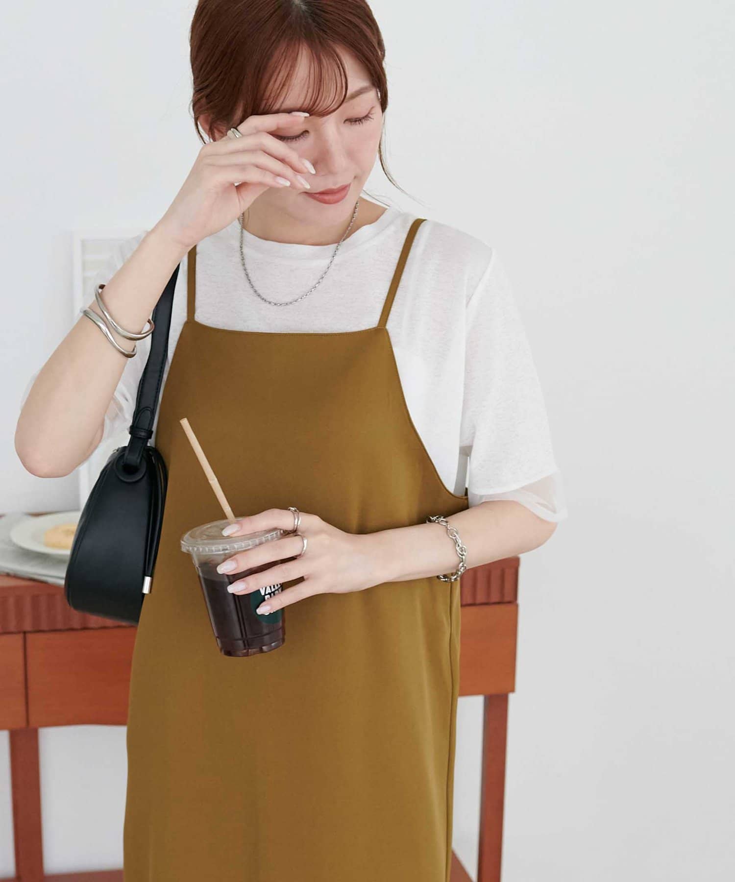 2人が参考になったと回答しています。買って大正解! のん 2025.06.09 グレー F 身長153cm 体重50kg~54kg 40歳~44歳 購入場所:パルクローゼット胸板厚め、胸大きめの骨格ストレート、身長低めなのでシルエットがどうなるか不安でしたが、ラインを拾いすぎることもなく、胸周りも少し余裕がある感じで着られました。やはり丈は長めで厚底必須でした。肩紐調整できますが、その分胸部分の布が上がってしまい窮屈に見えてしまうので変にならないギリギリまで短くして着ています。