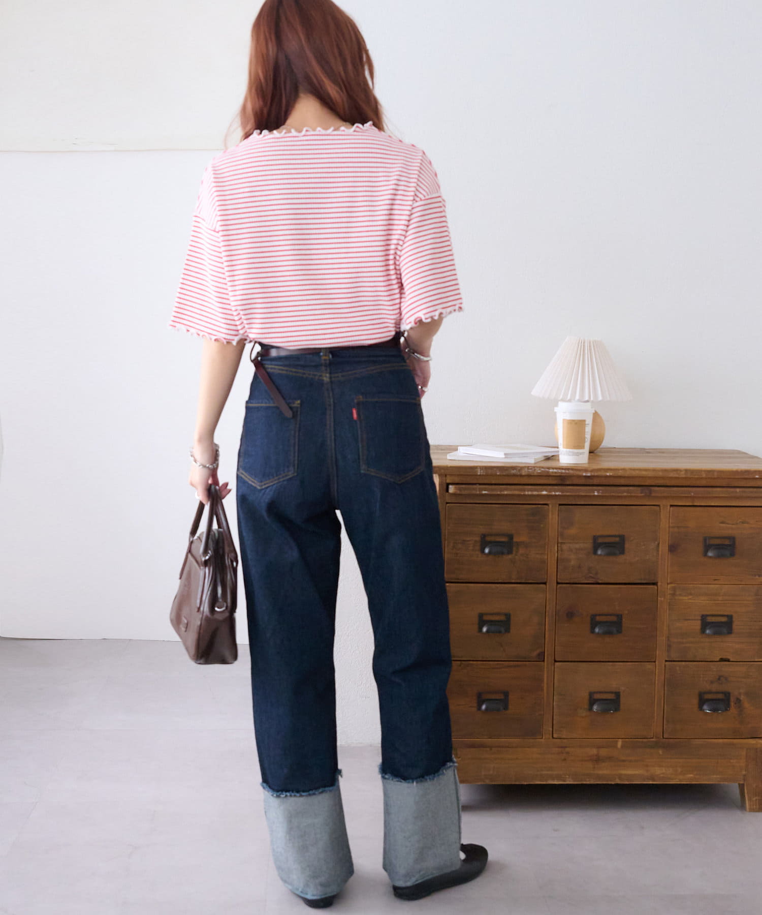 メローのデザインが引き立つアイテムなので、デニムやチノパンなどのベーシックに着まわせるボトムスと相性抜群◎