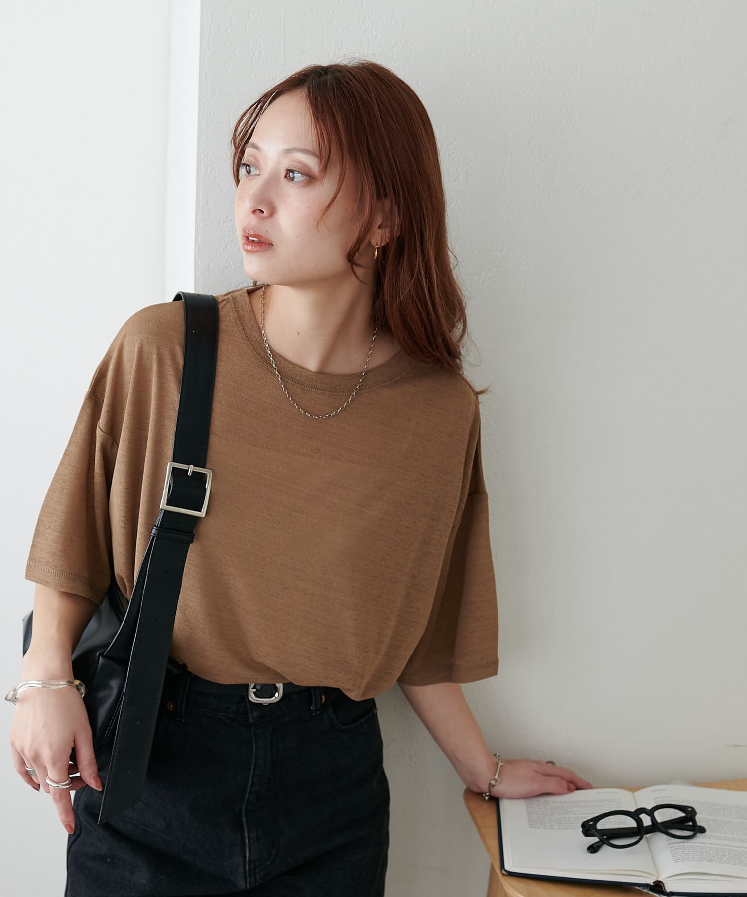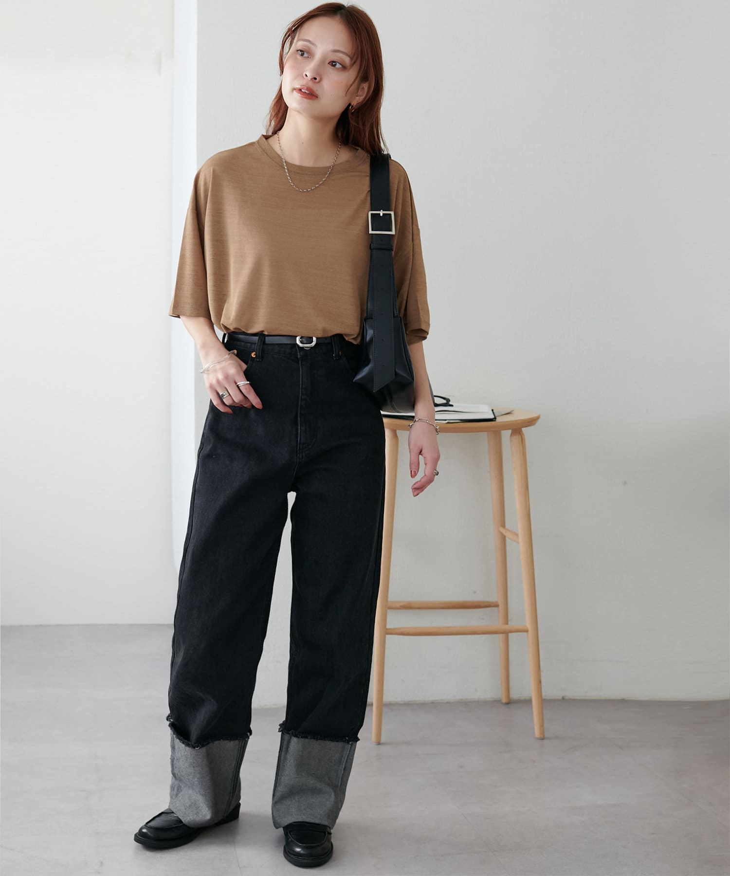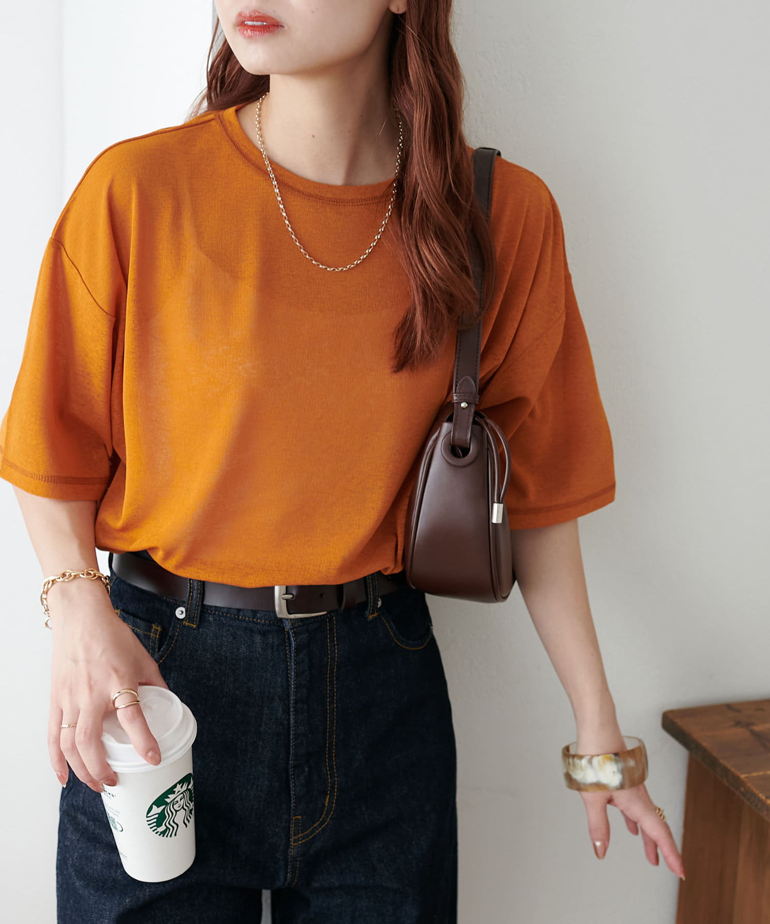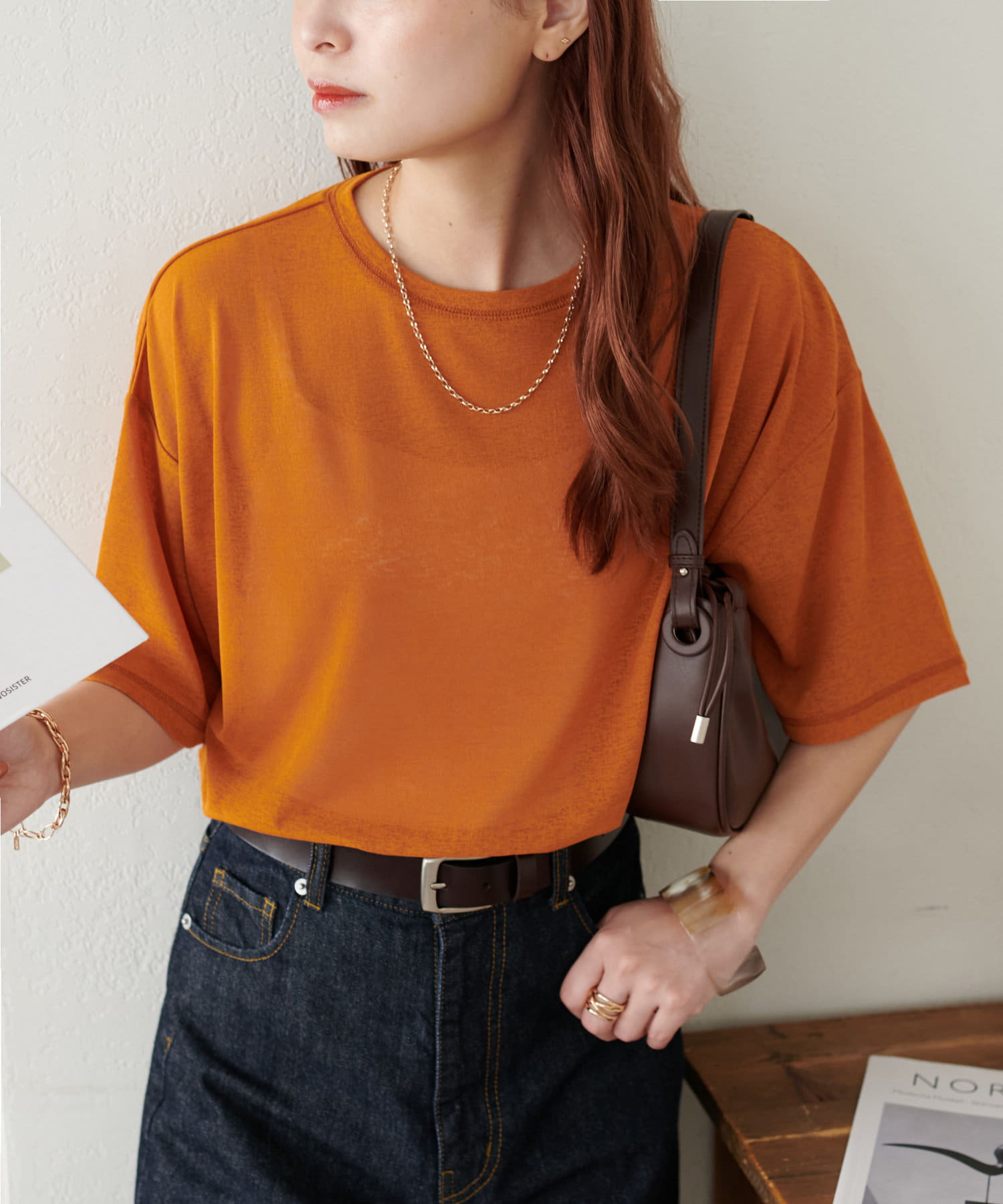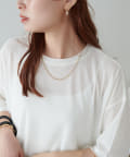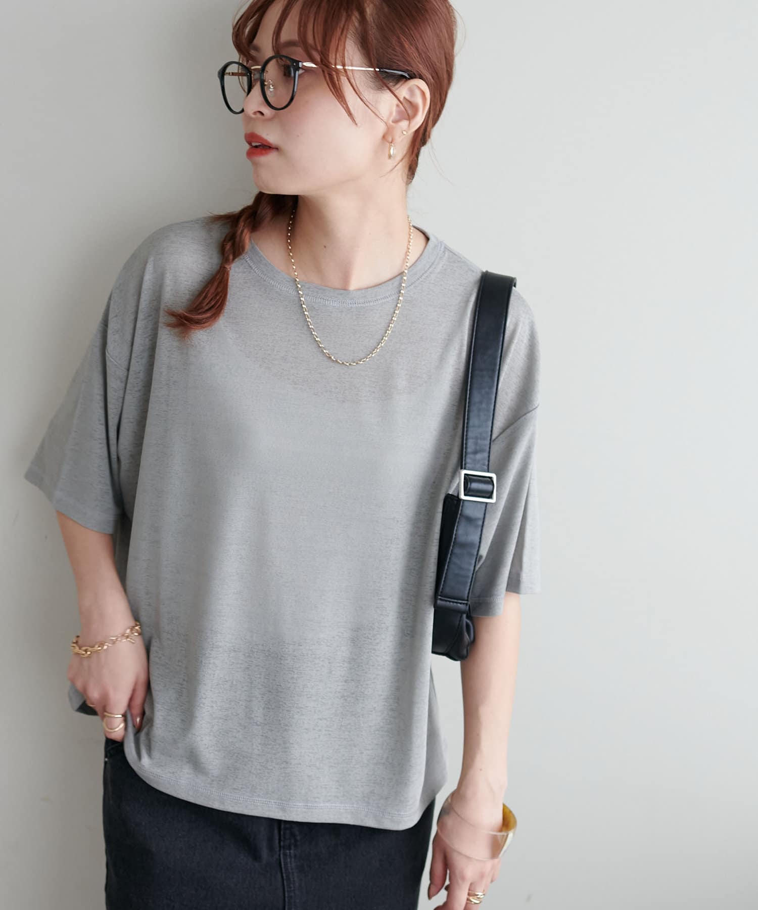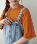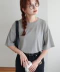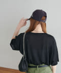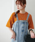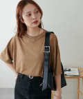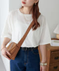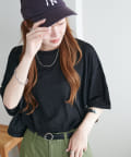 155㎝スタッフ(Mサイズ着用):さらっとした生地感で着心地が良いです◎シンプルな一枚なので小物で遊べるのが嬉しいポイント!