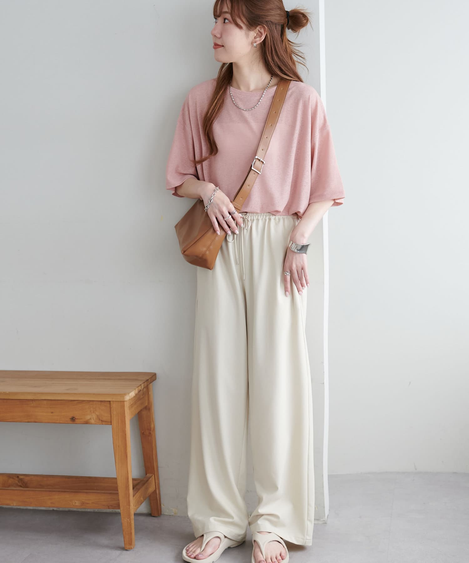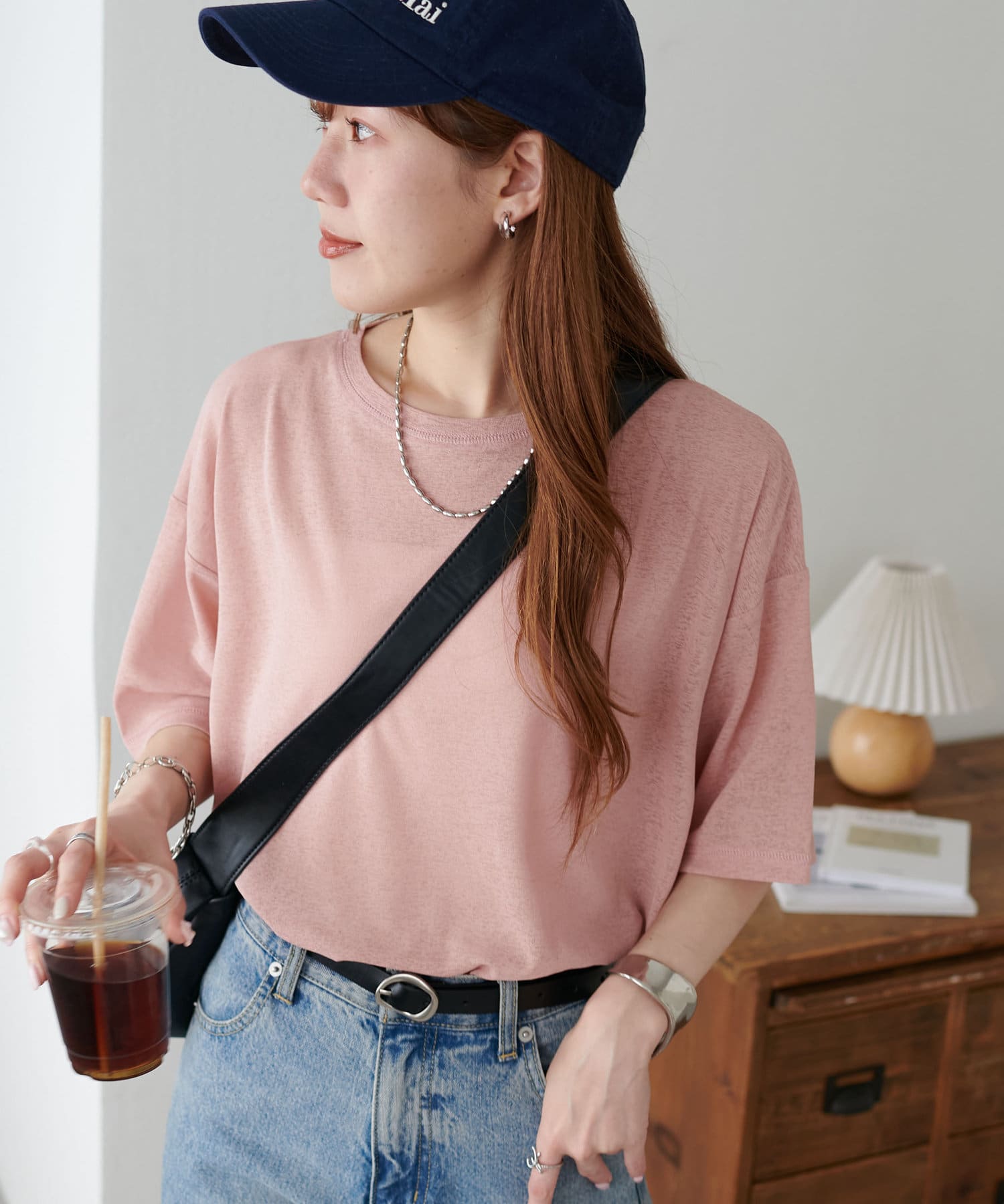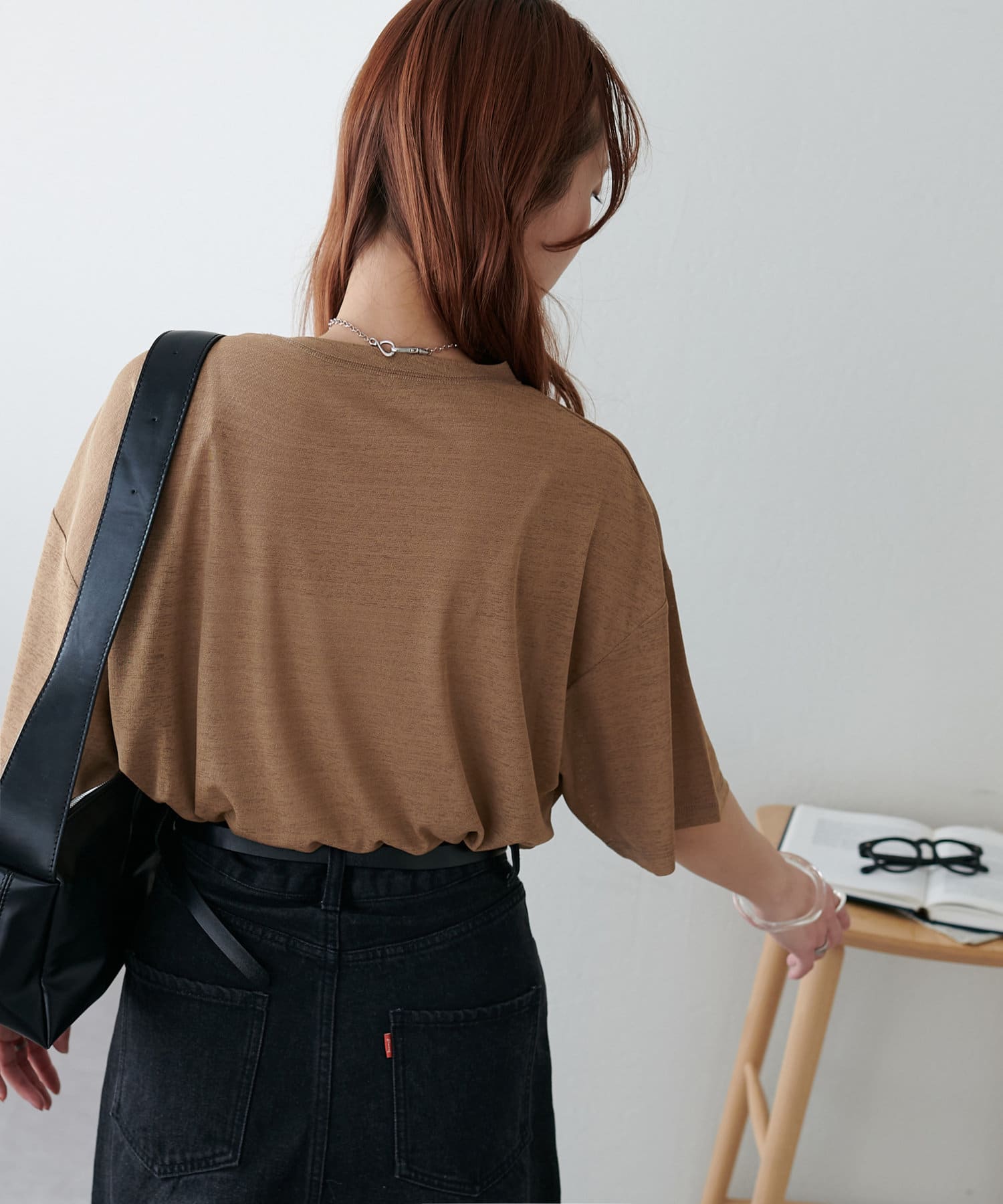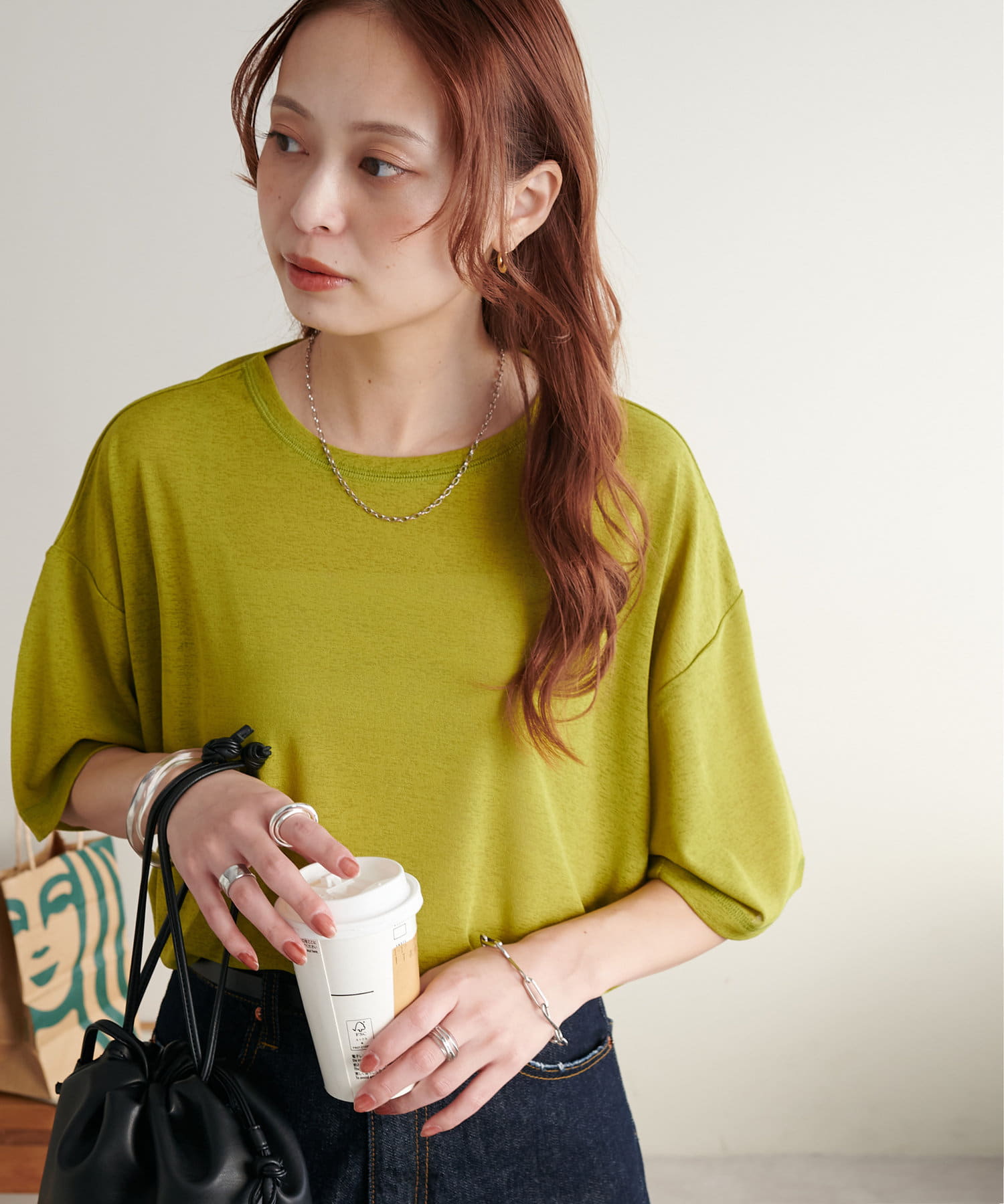 155㎝スタッフ(Mサイズ着用):さらっとした生地感で着心地が良いです◎シンプルな一枚なので小物で遊べるのが嬉しいポイント!
