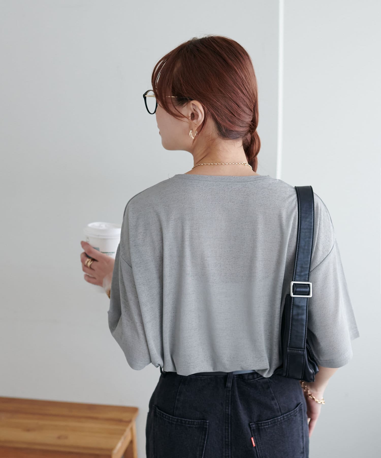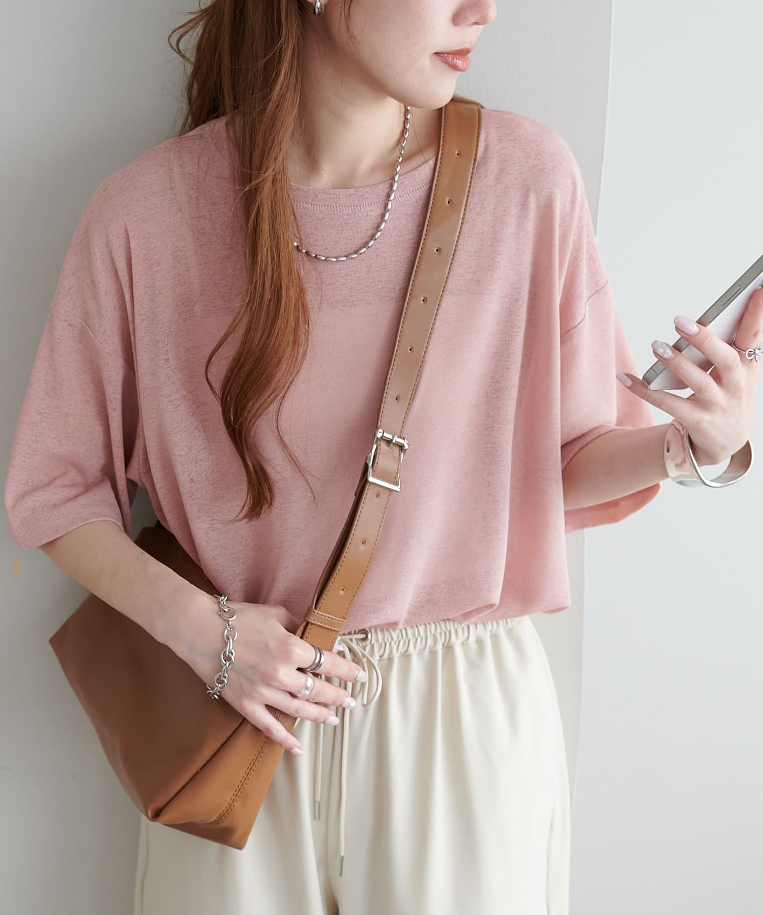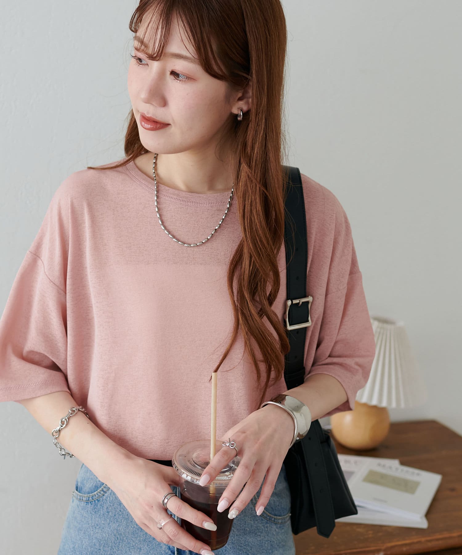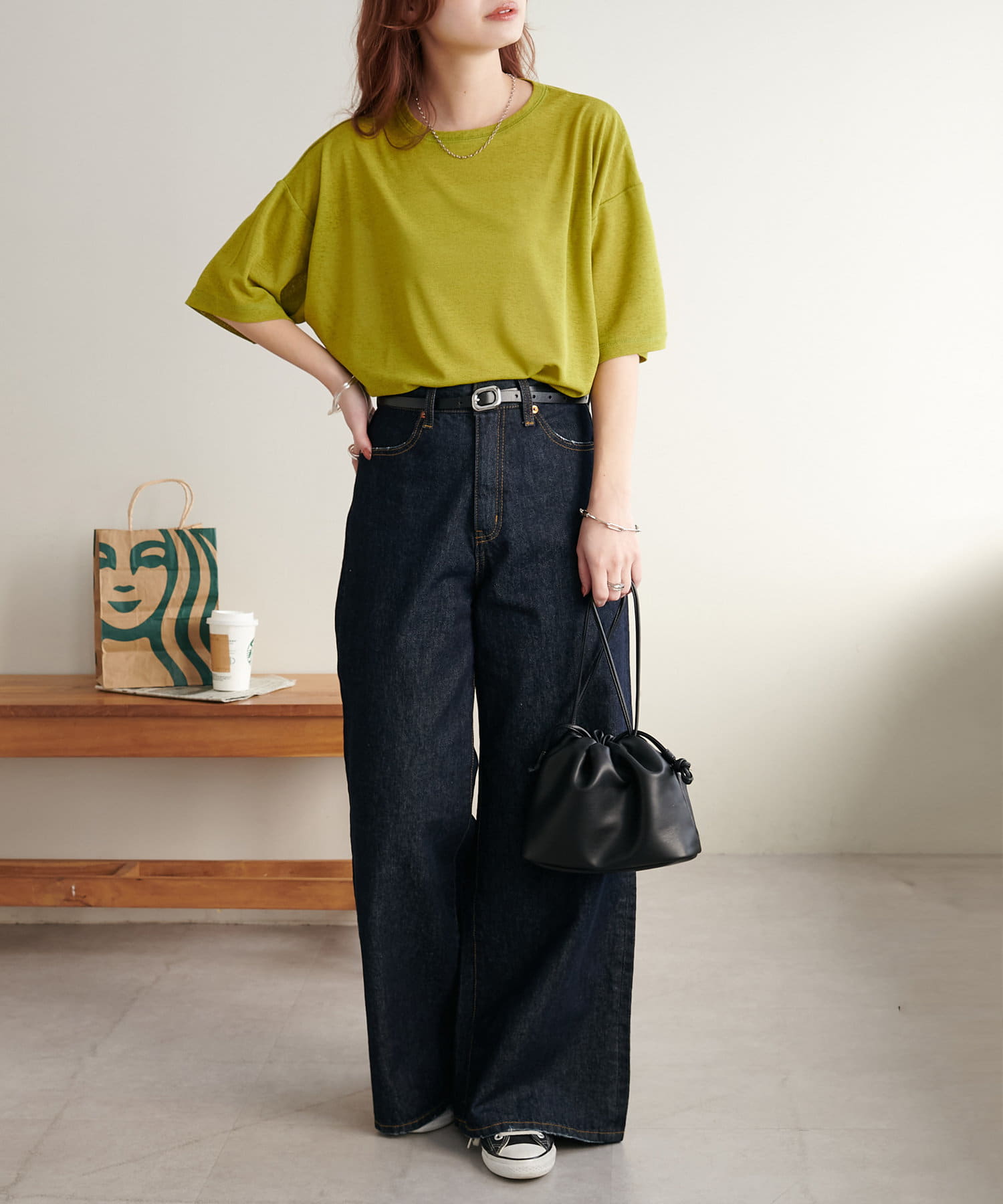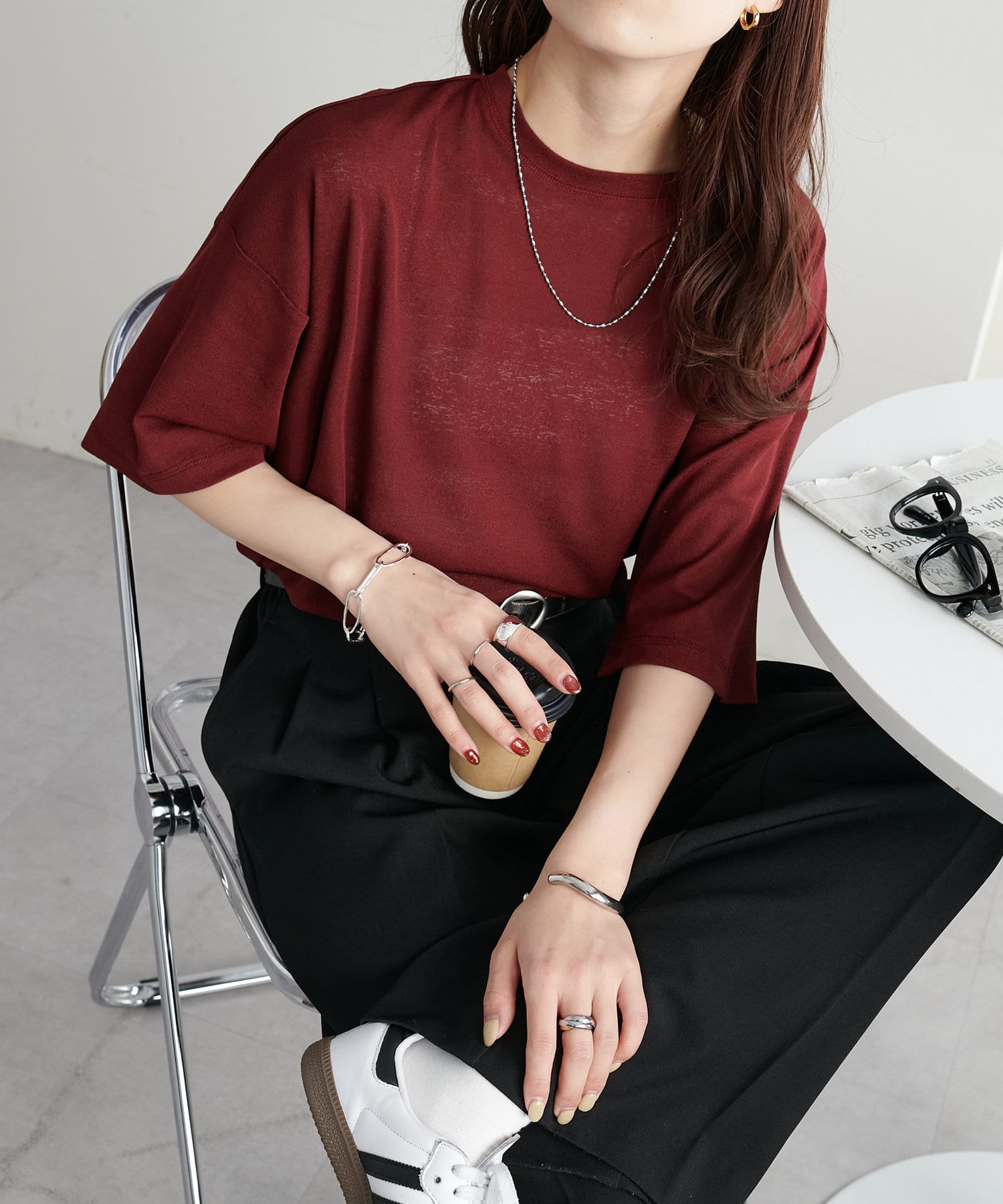 155㎝スタッフ(Mサイズ着用):さらっとした生地感で着心地が良いです◎シンプルな一枚なので小物で遊べるのが嬉しいポイント!