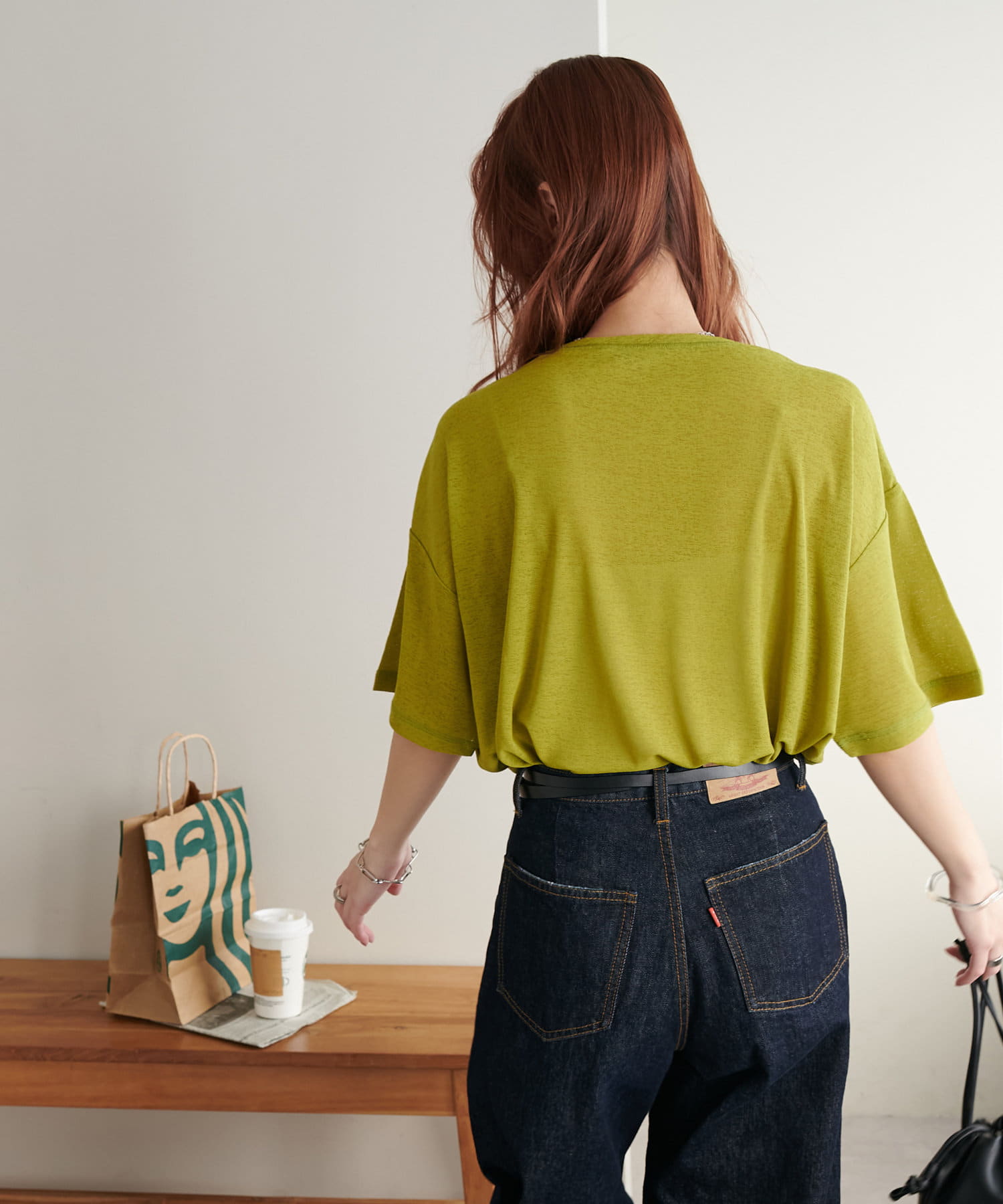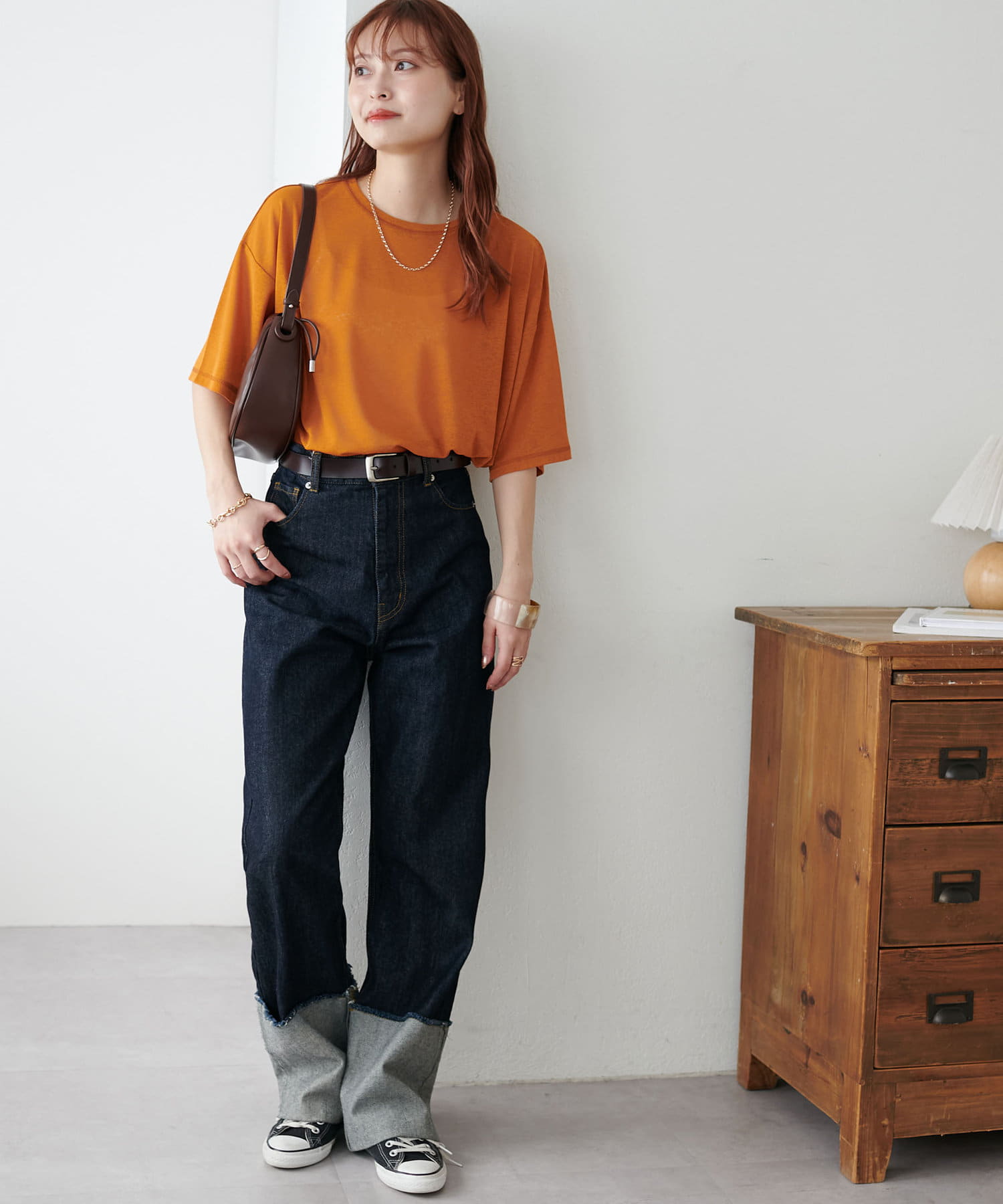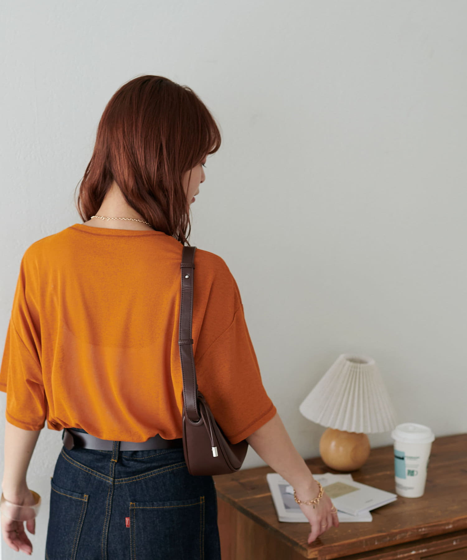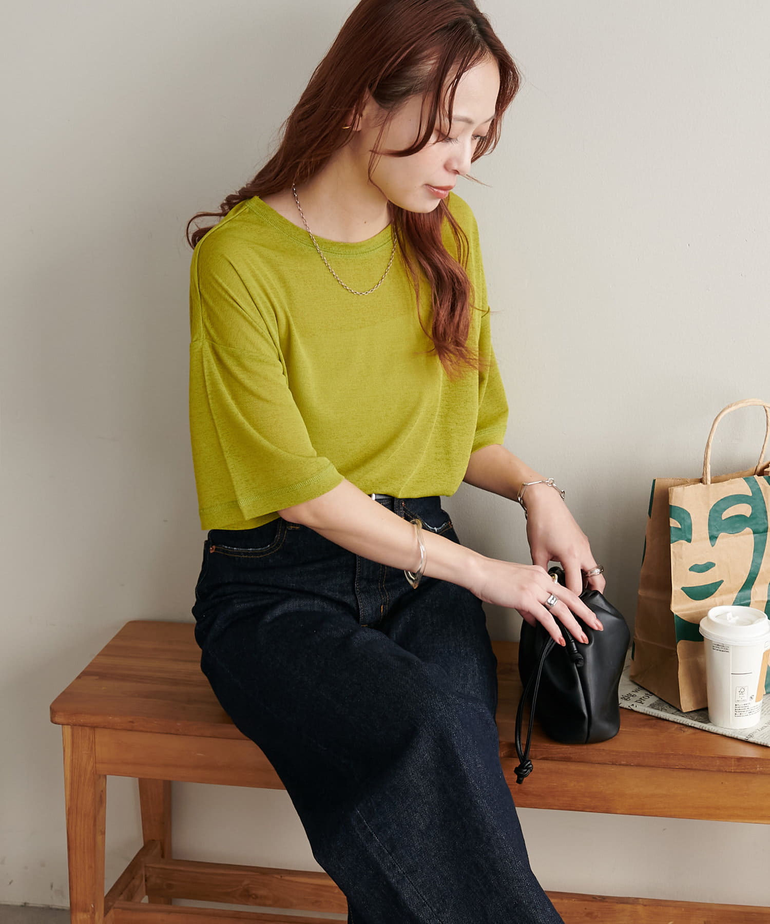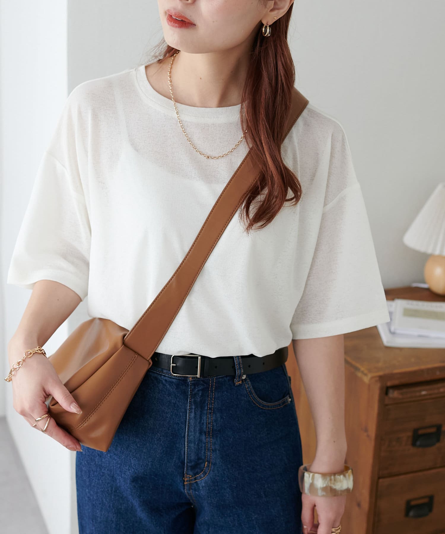 155㎝スタッフ(Mサイズ着用):さらっとした生地感で着心地が良いです◎シンプルな一枚なので小物で遊べるのが嬉しいポイント!