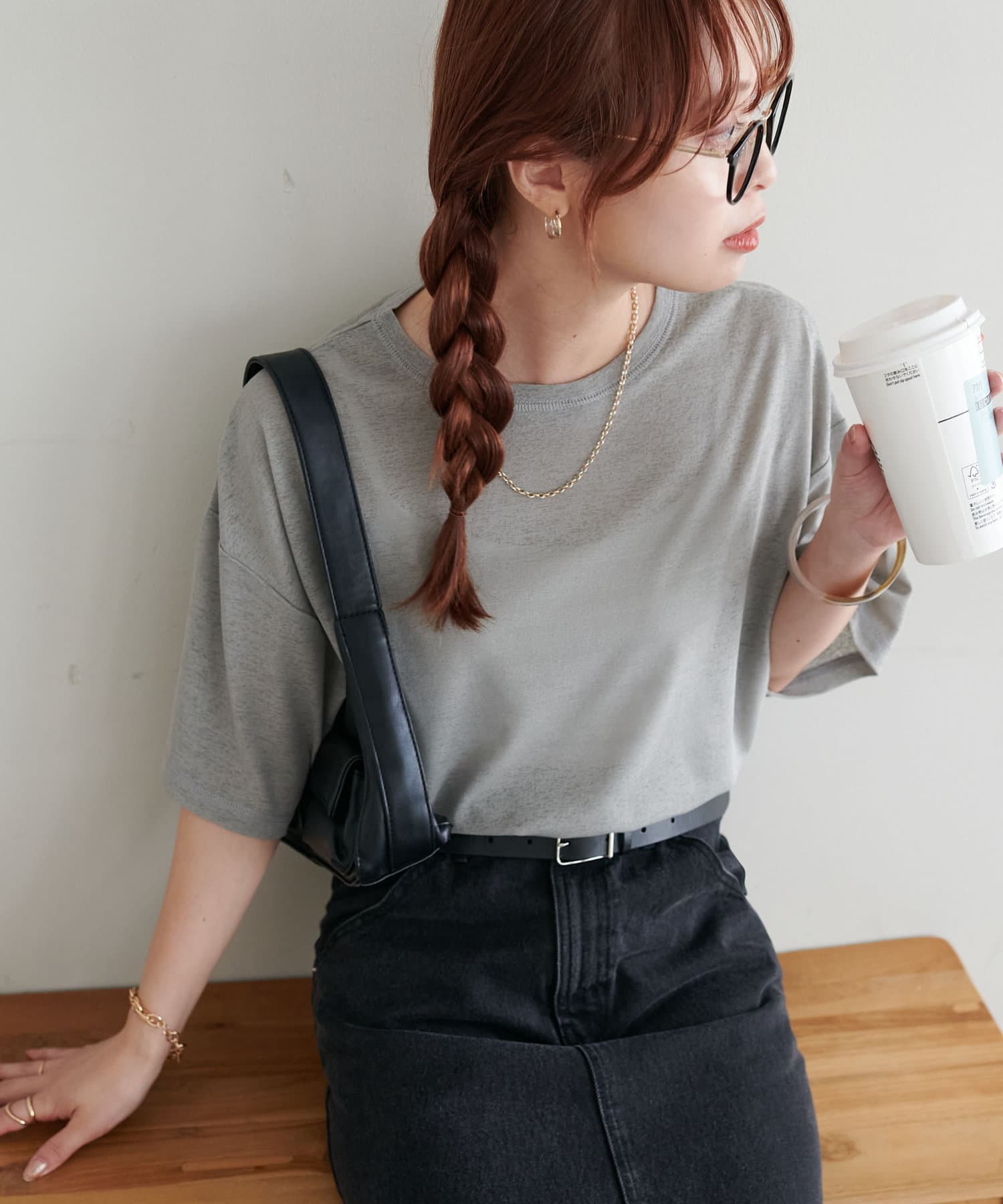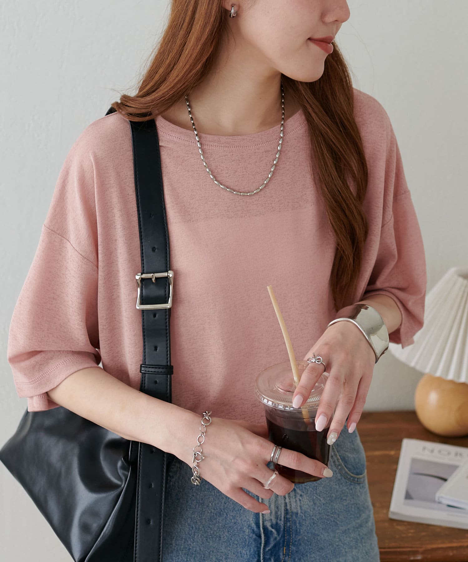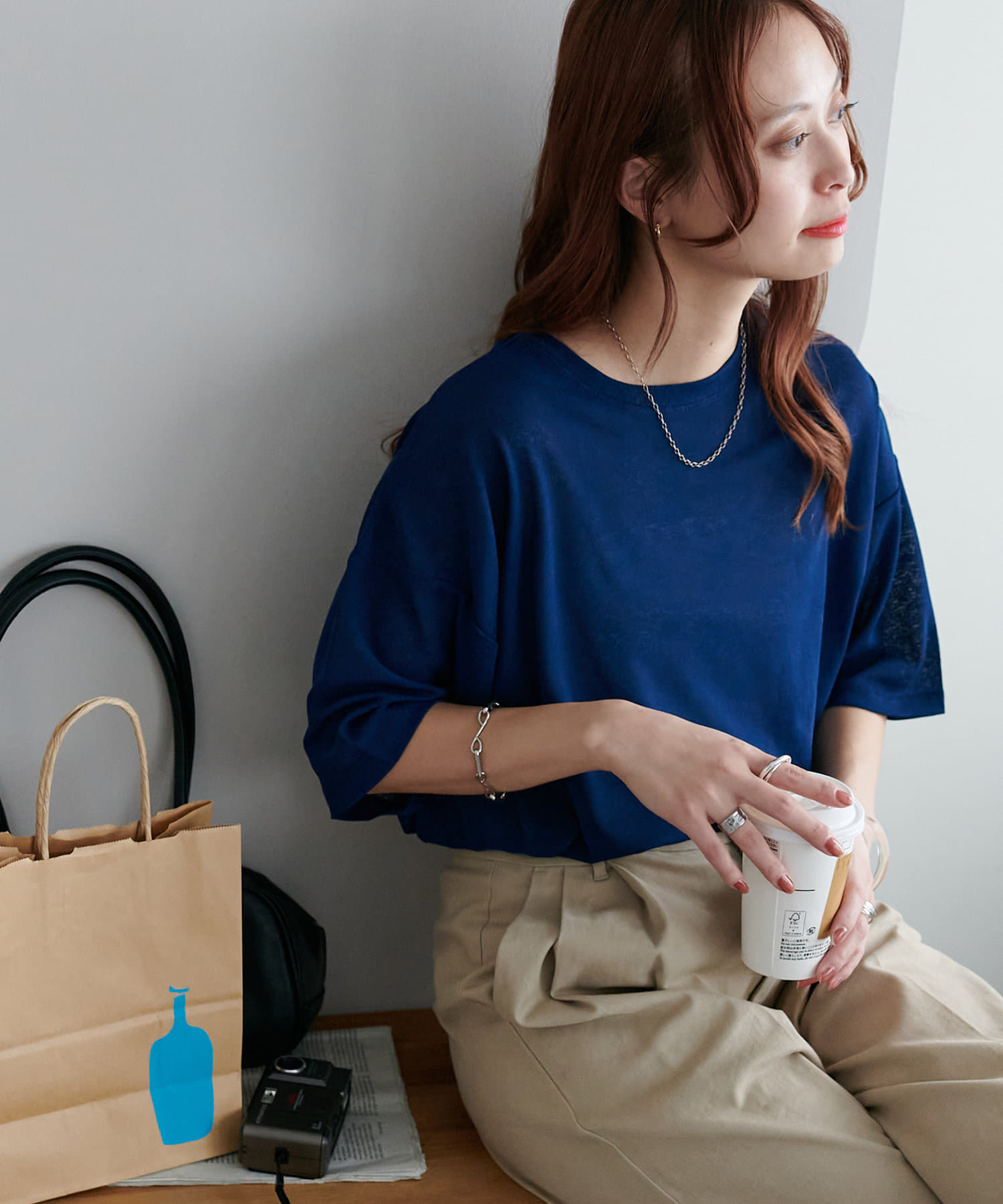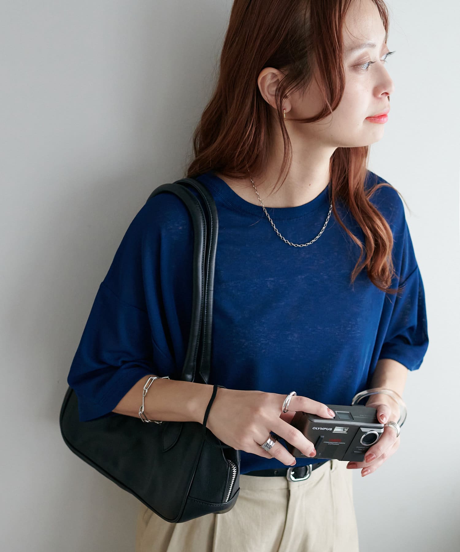 155㎝スタッフ(Mサイズ着用):さらっとした生地感で着心地が良いです◎シンプルな一枚なので小物で遊べるのが嬉しいポイント!