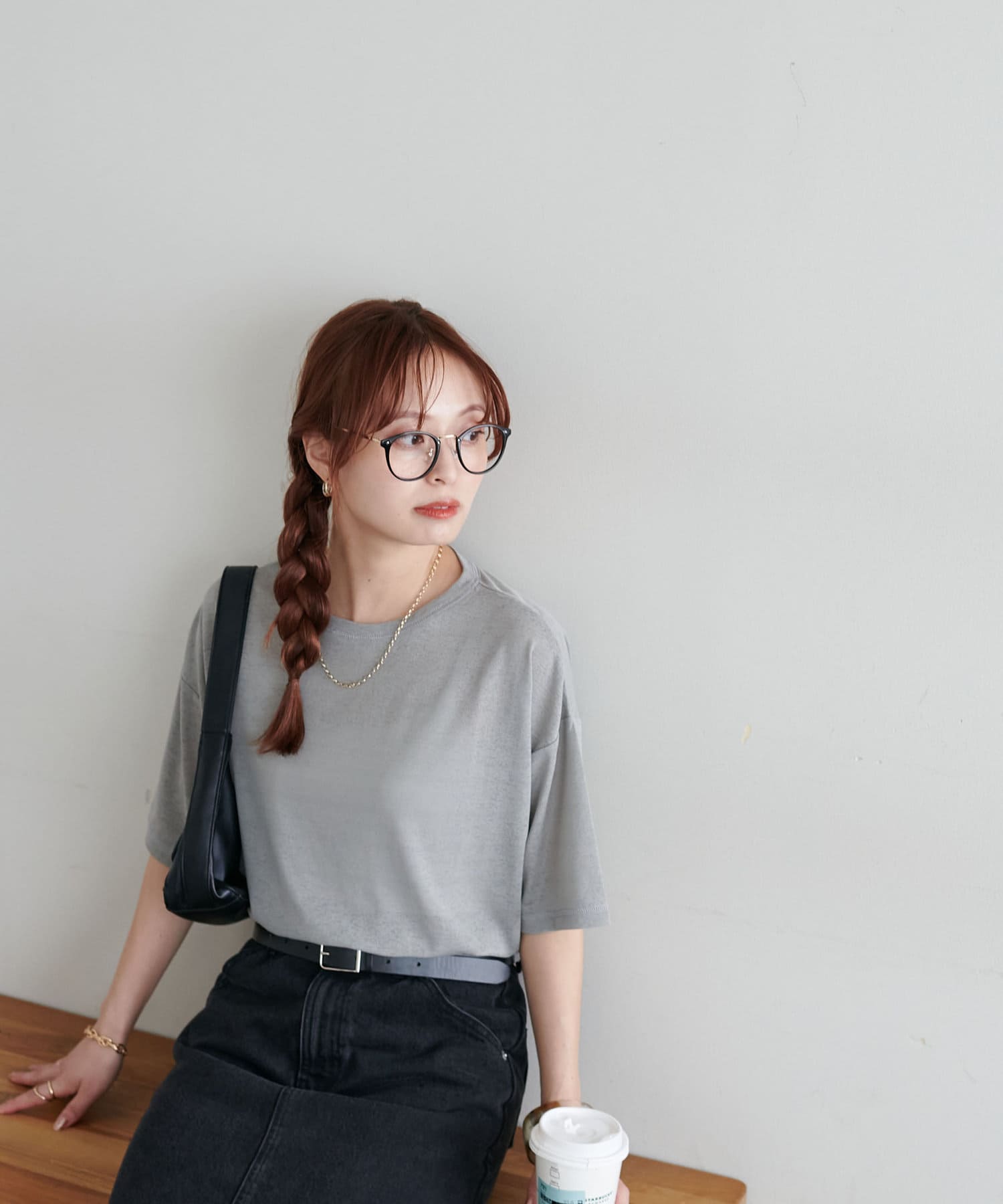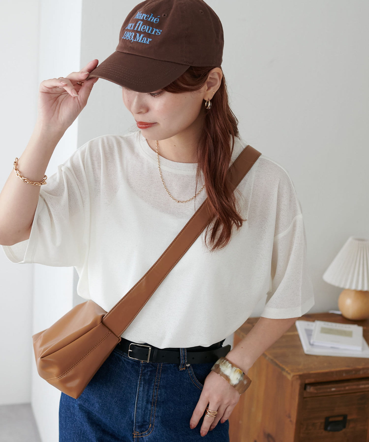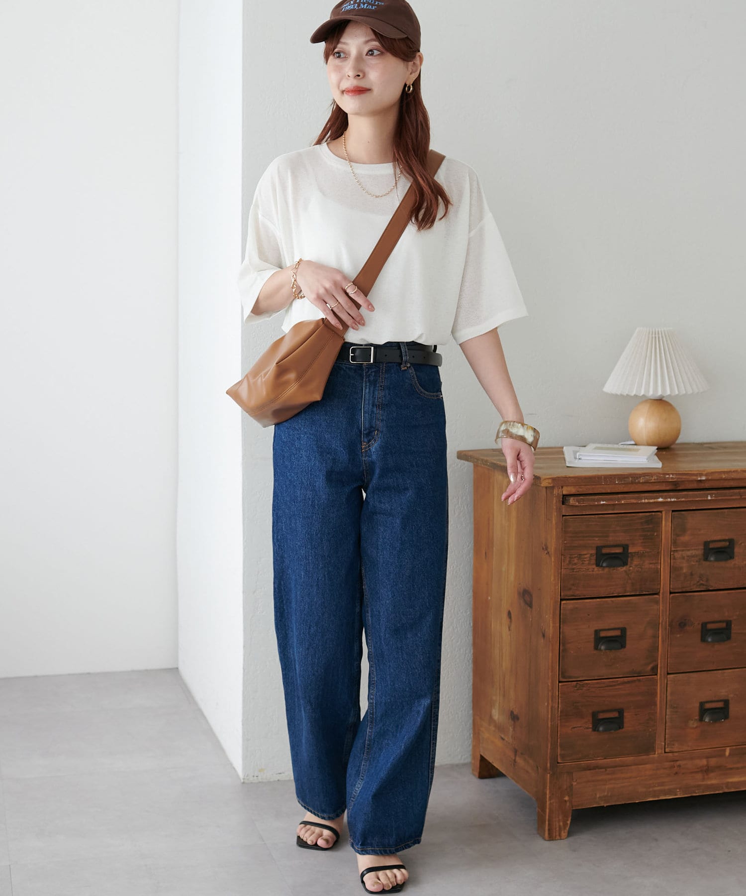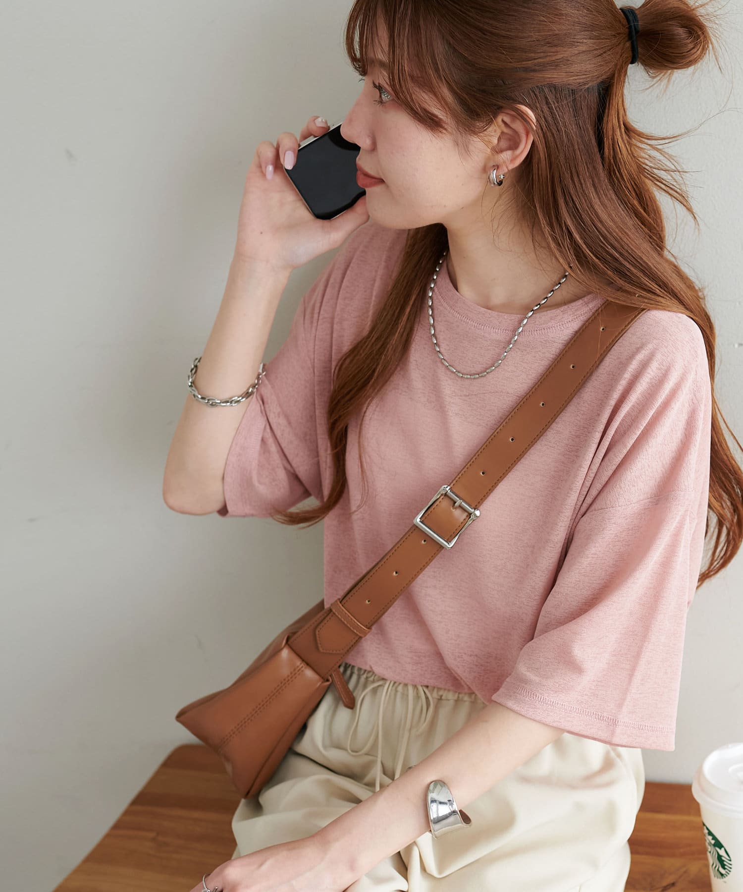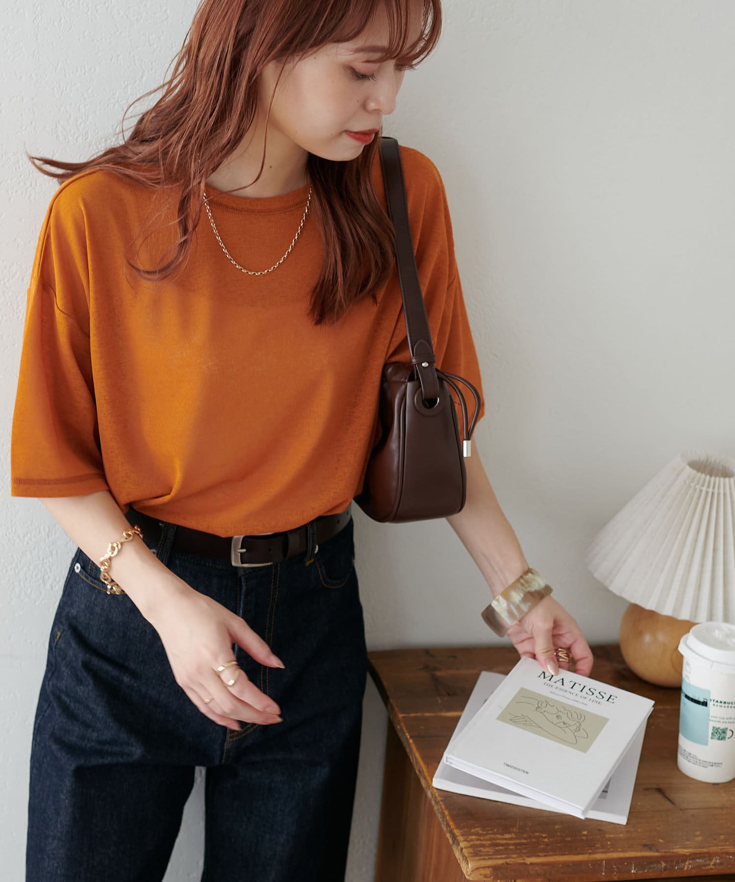 155㎝スタッフ(Mサイズ着用):さらっとした生地感で着心地が良いです◎シンプルな一枚なので小物で遊べるのが嬉しいポイント!