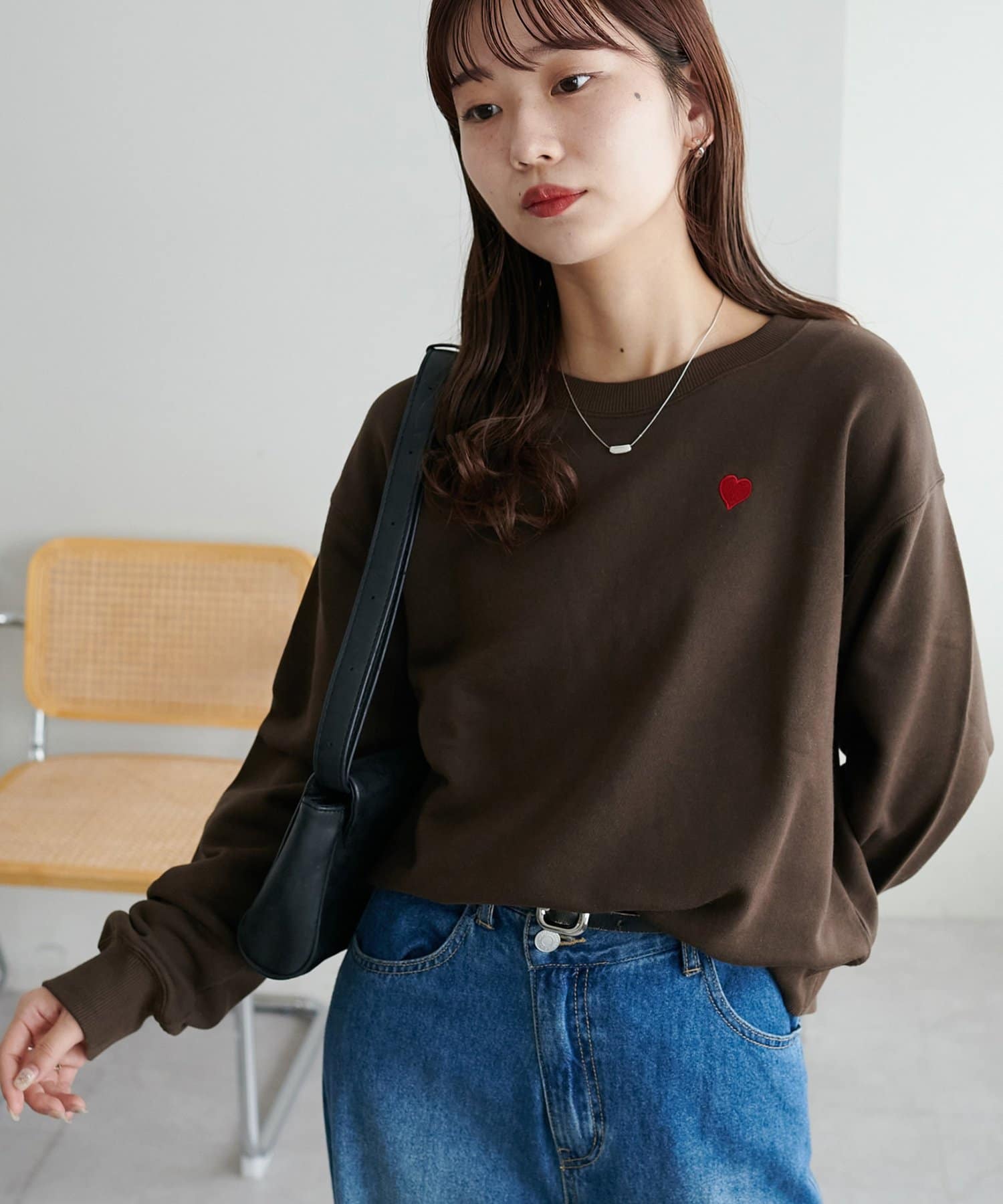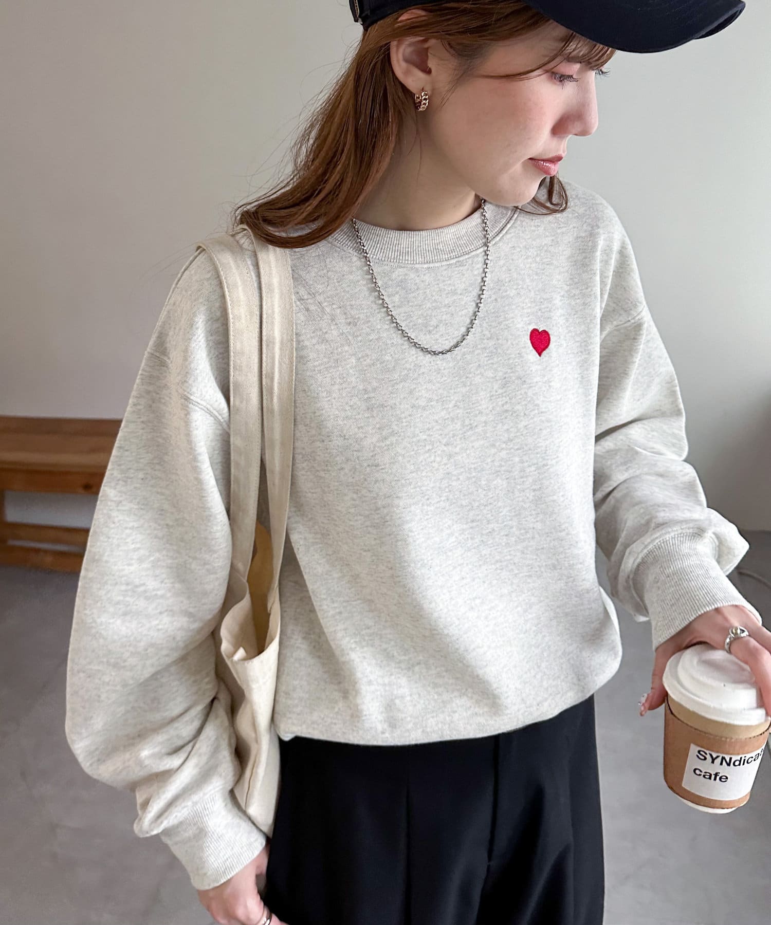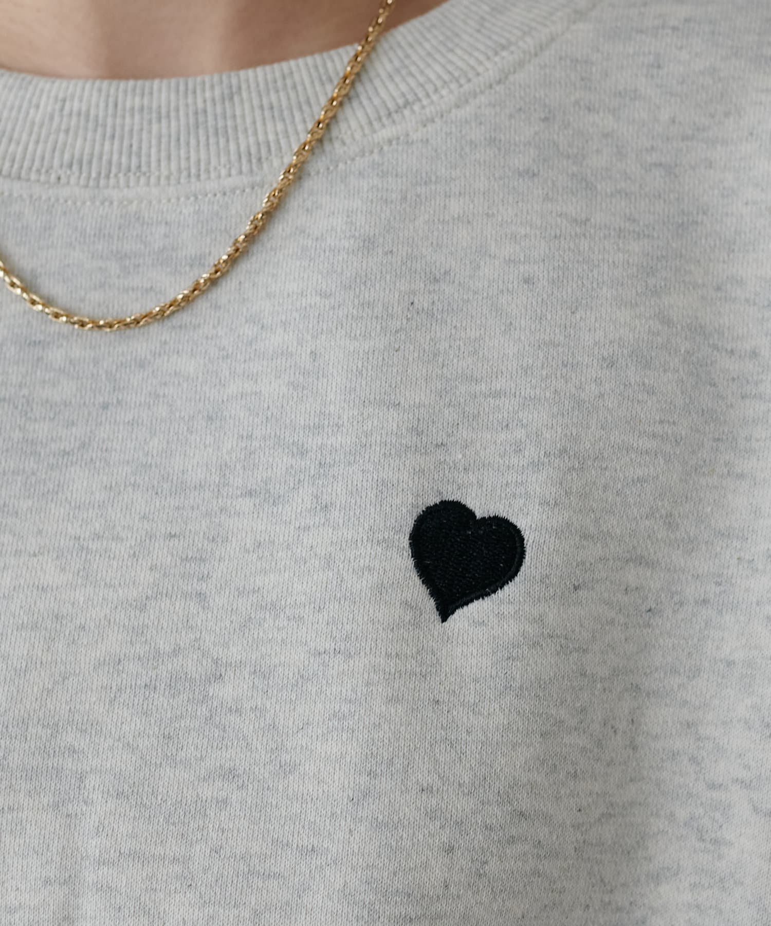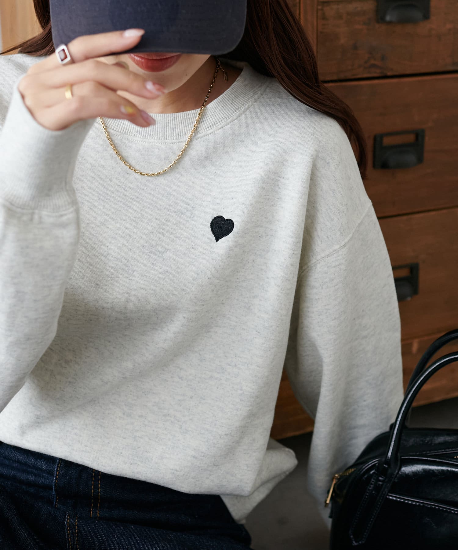 シンプルなデザインだからこそ、ハートのワンポイント刺繍が目を惹くスウェット。