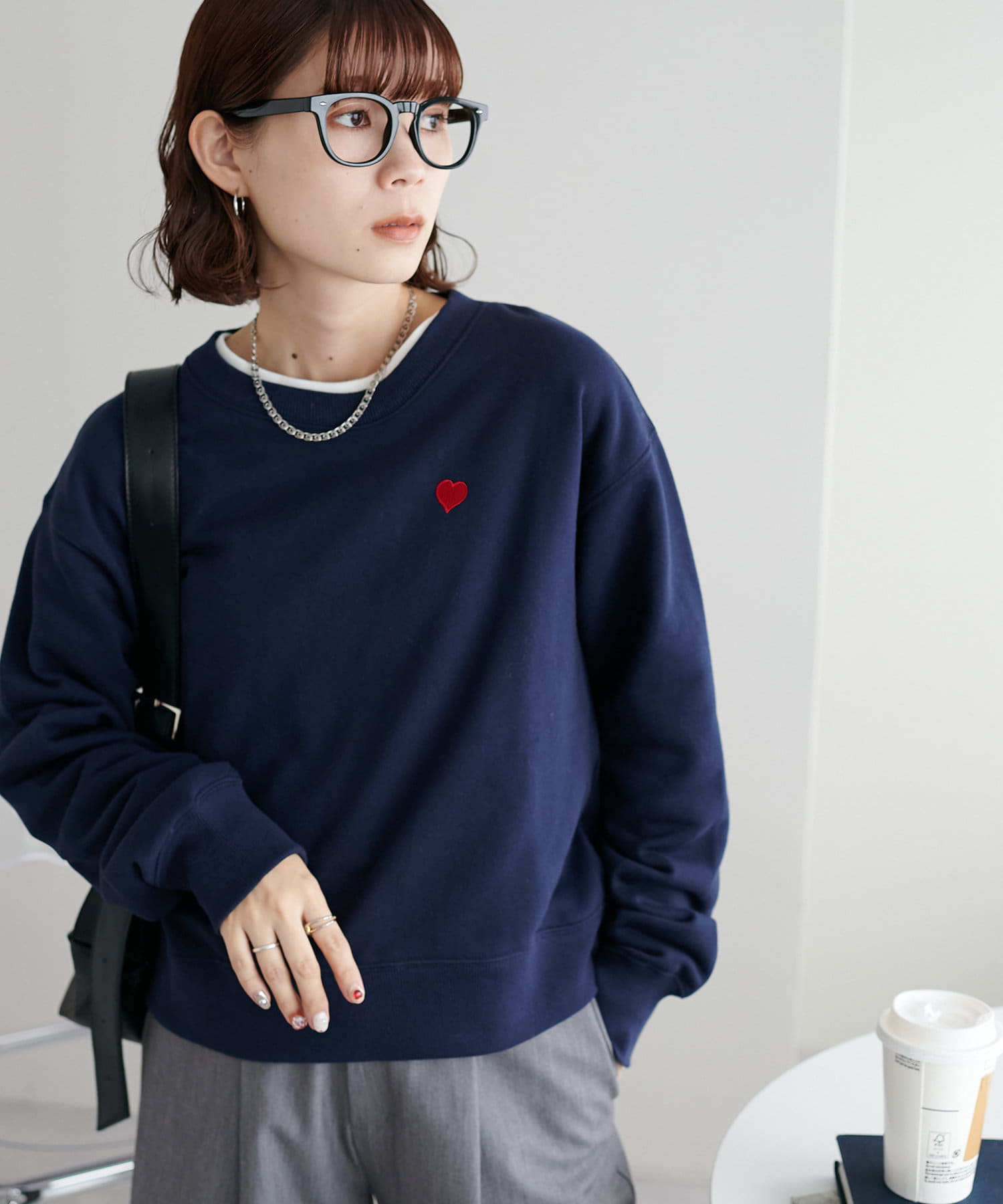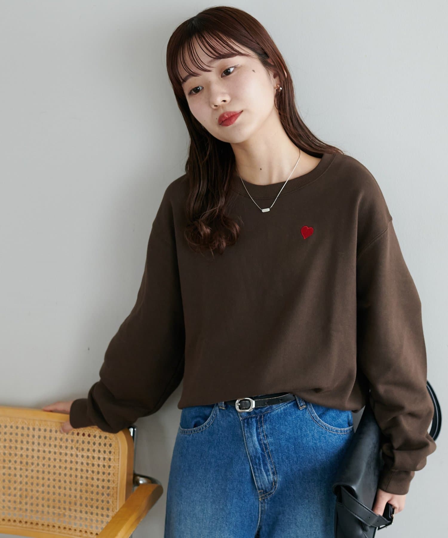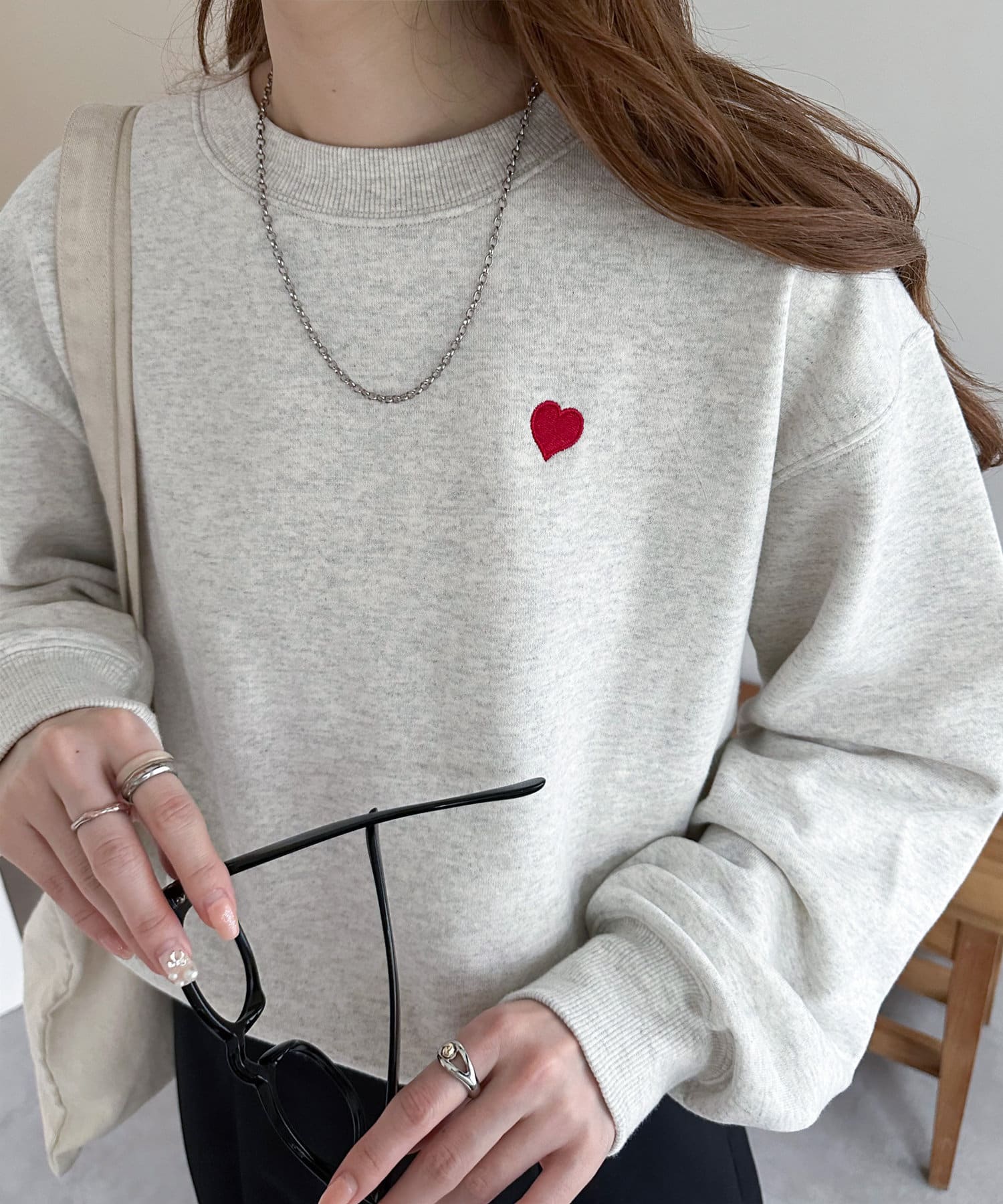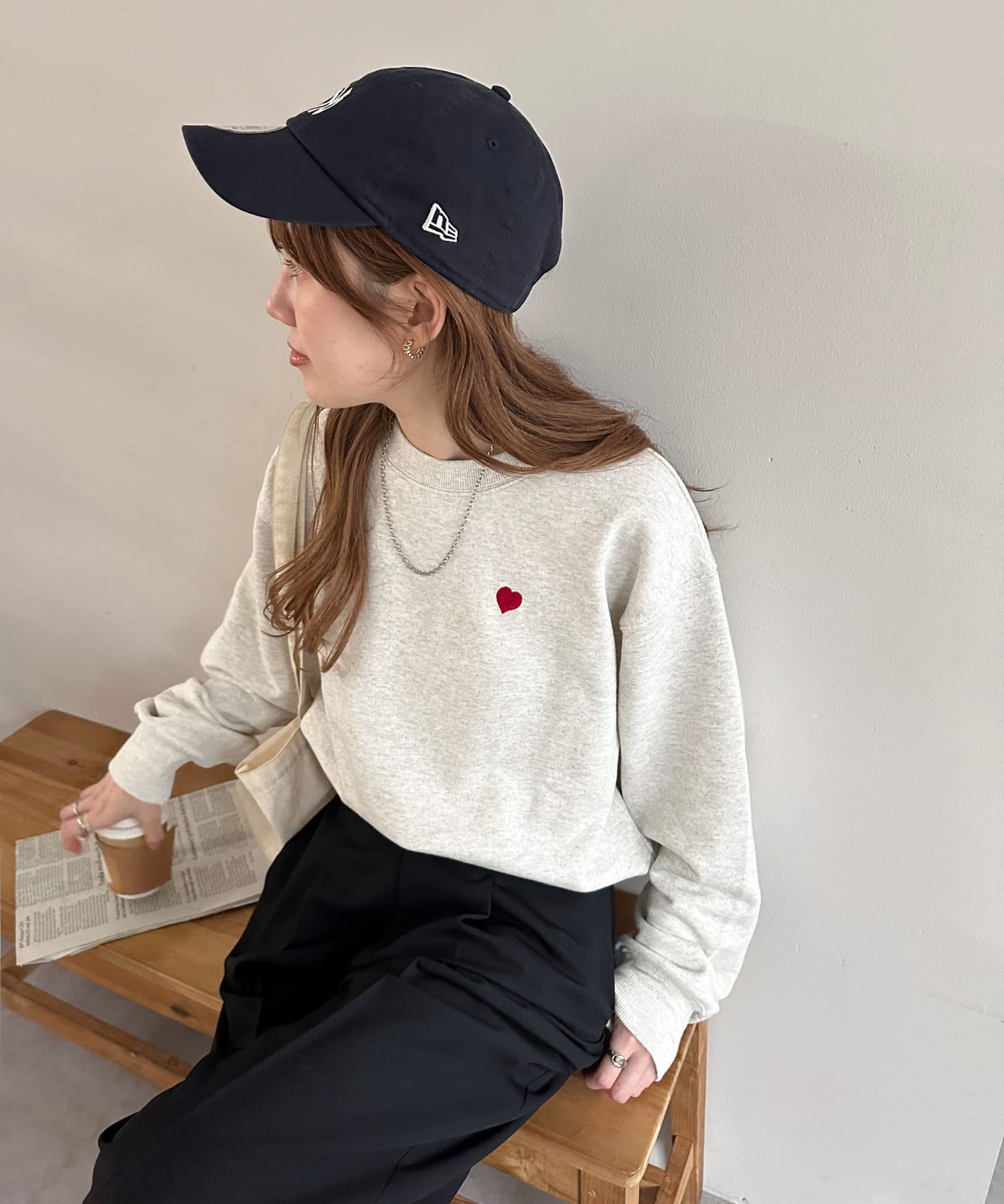 シンプルなデザインだからこそ、ハートのワンポイント刺繍が目を惹くスウェット。