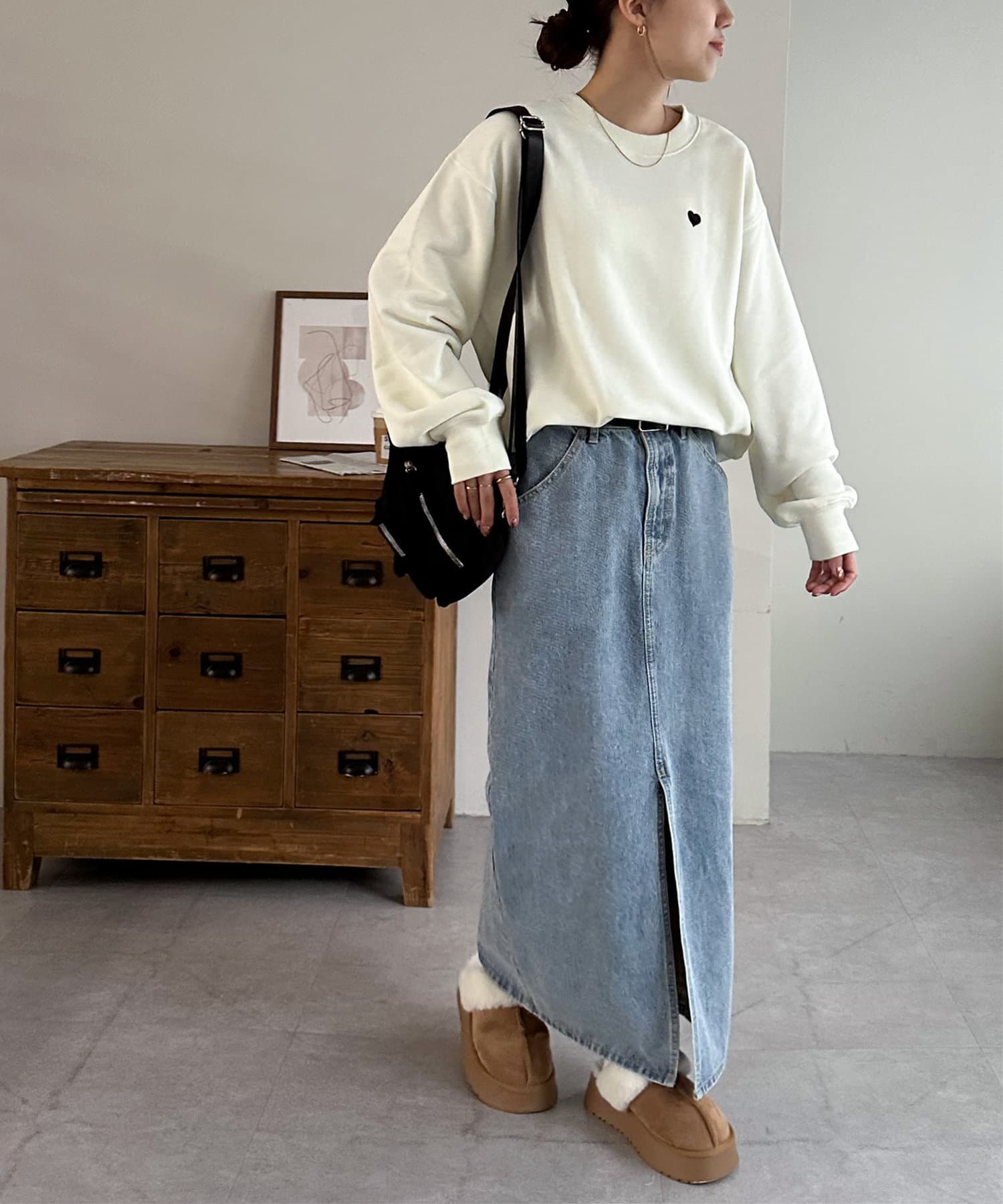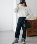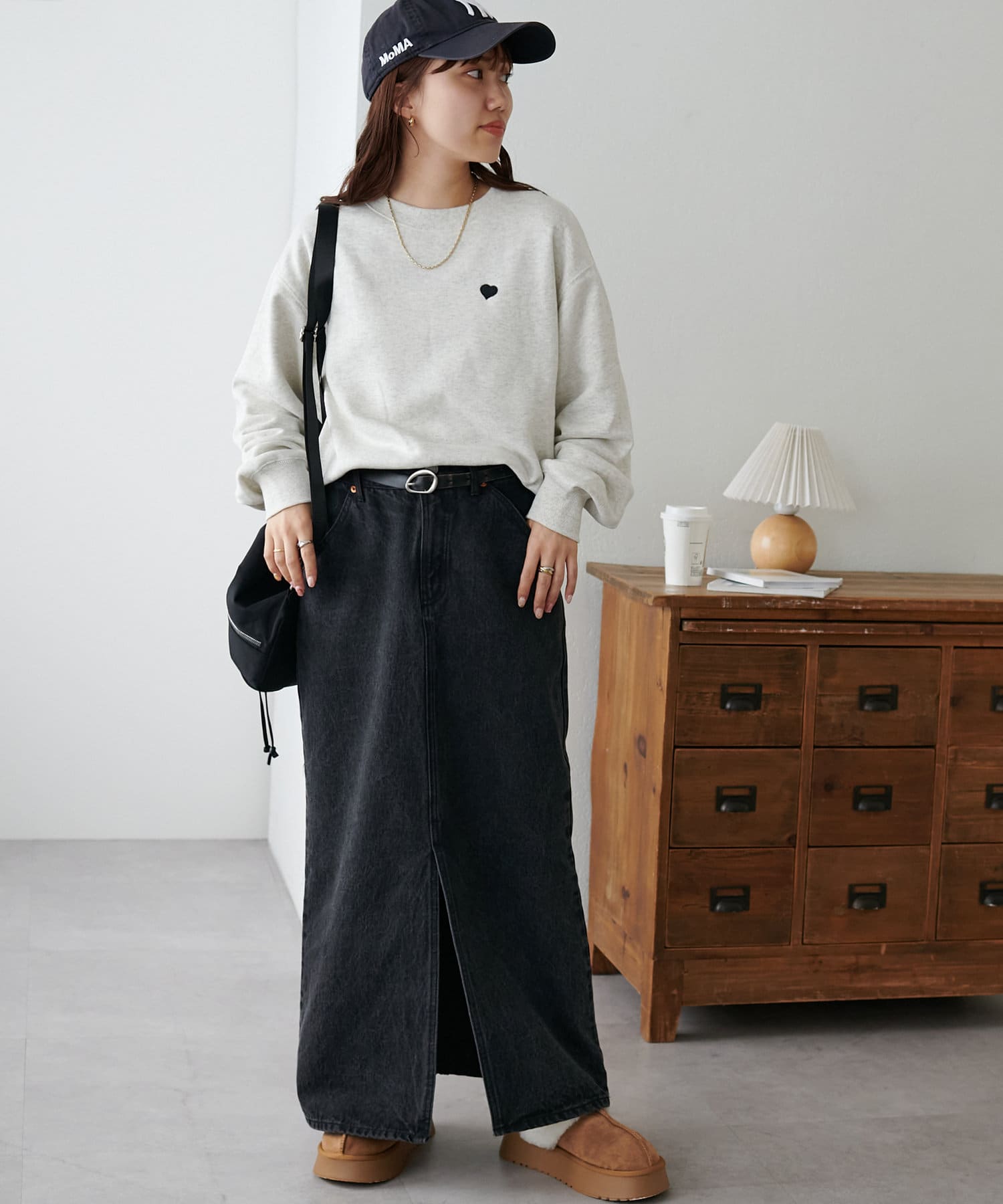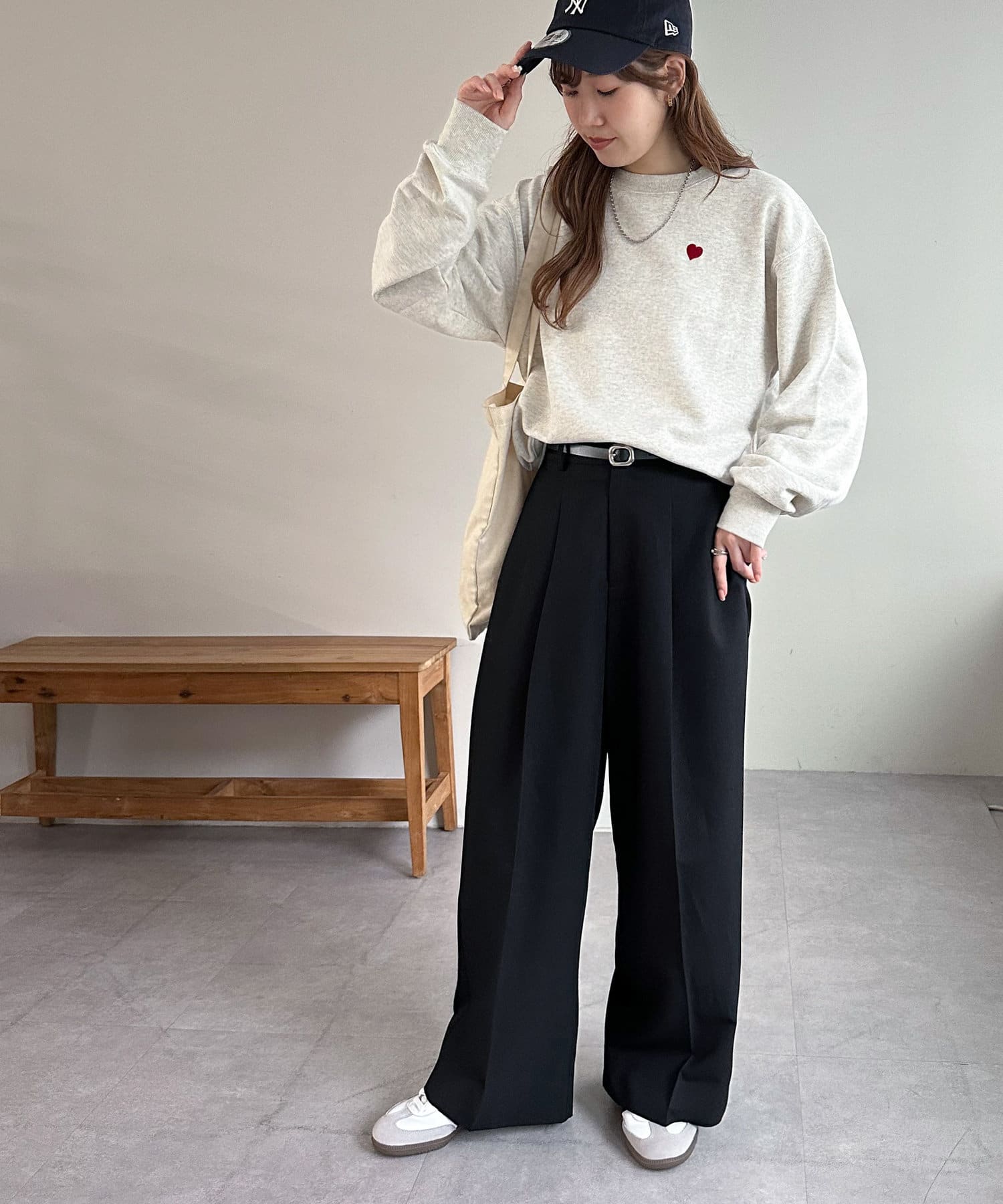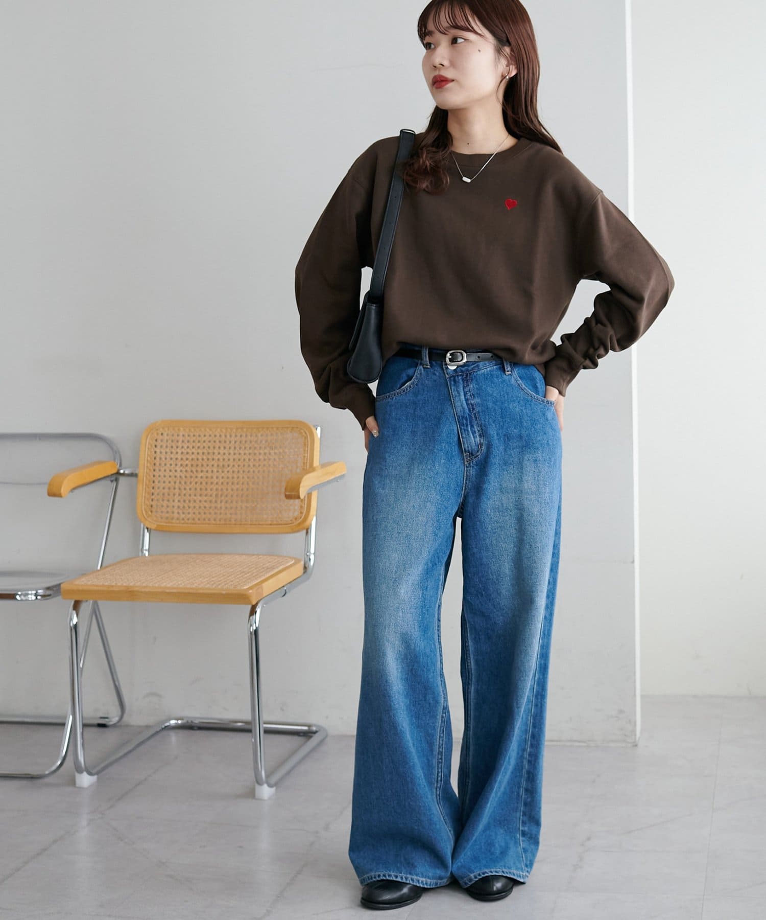 155㎝スタッフ:ベーシックなスウェットなのに、ハート刺繍のデザインがあることで特別感のある一枚!デニム合わせでもカジュアルになりすぎずに合わせていただけますよ◎