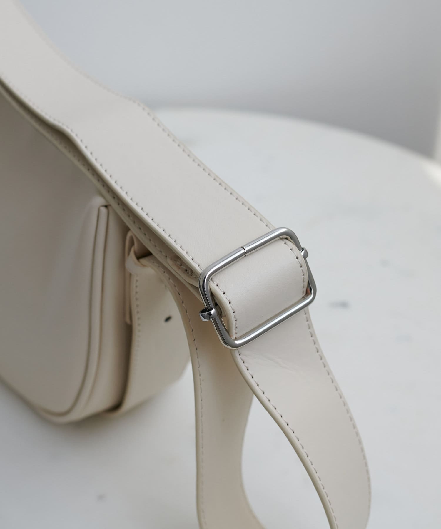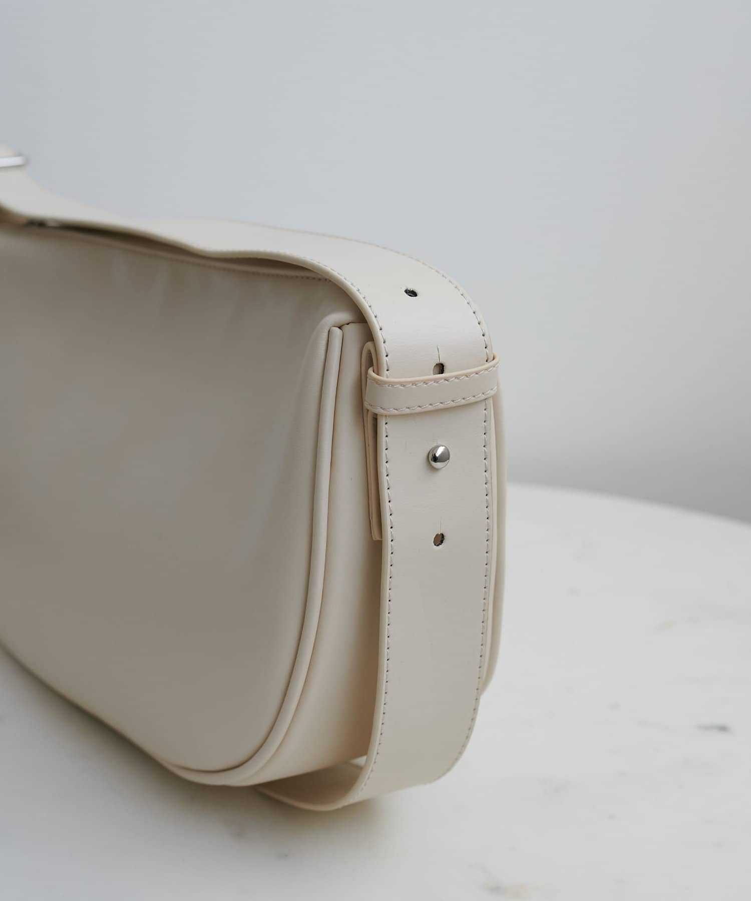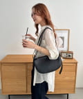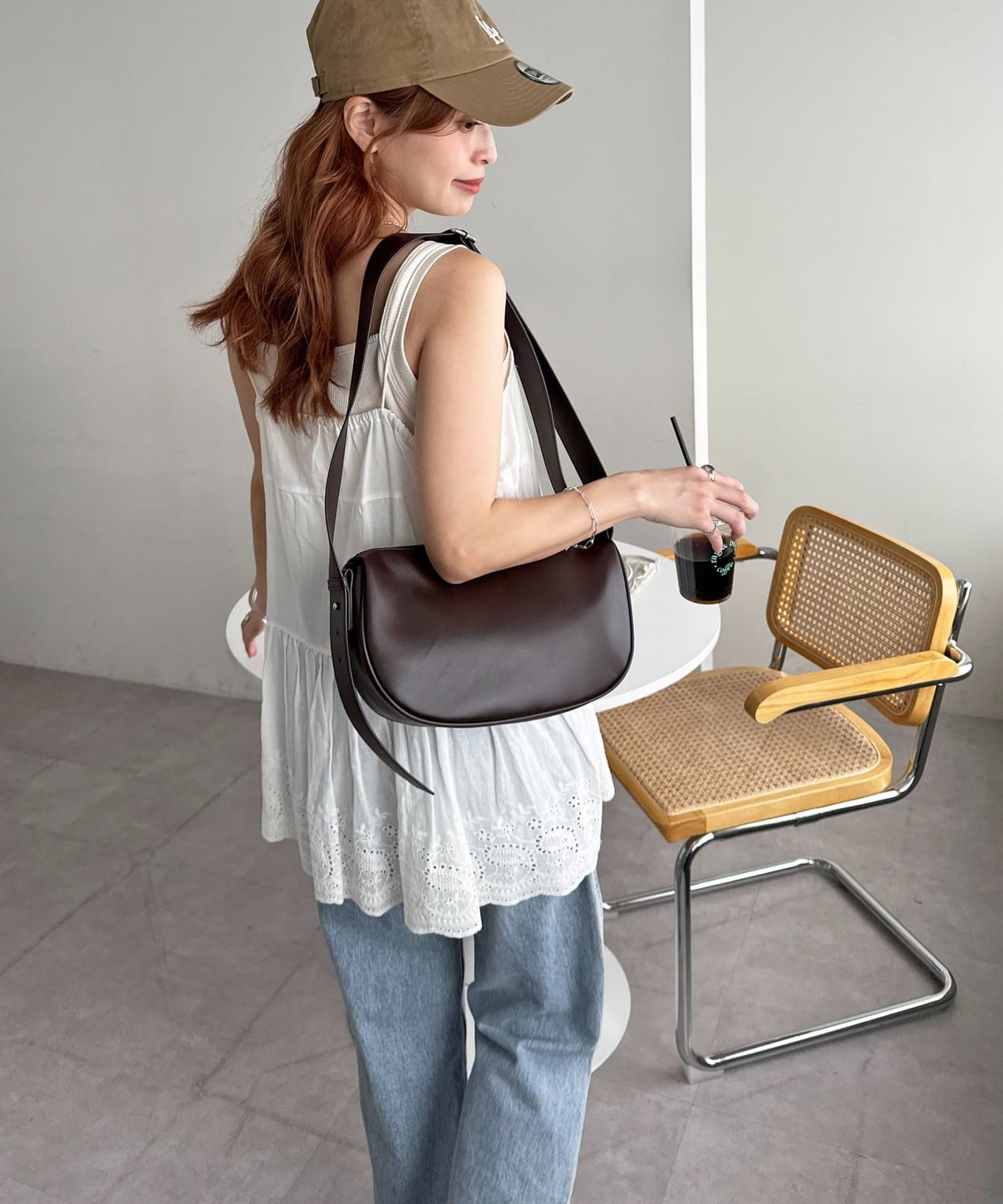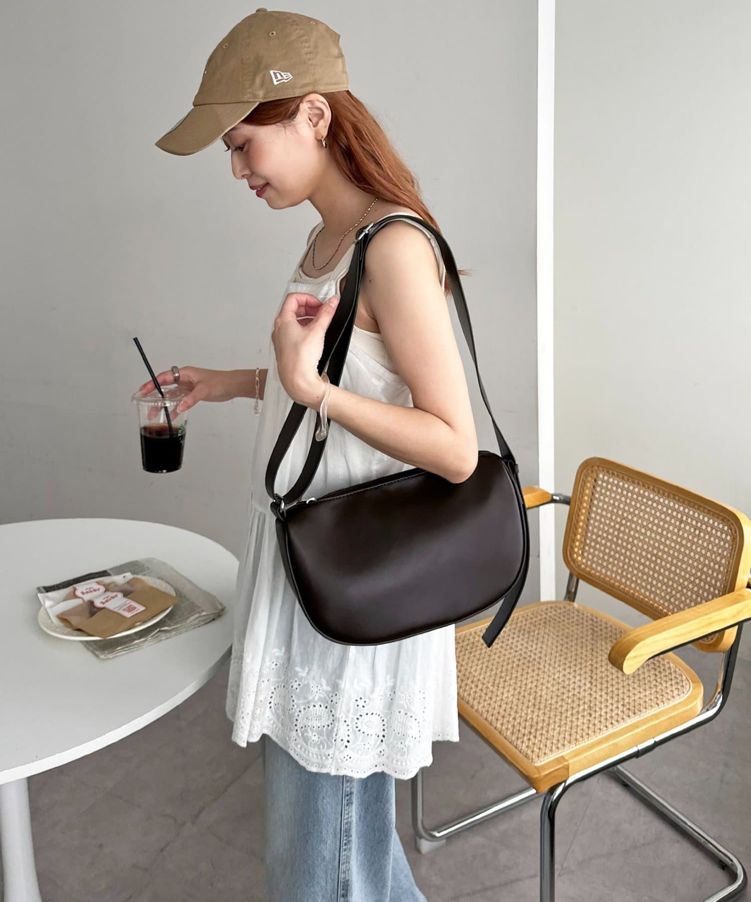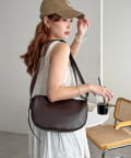 どんなテイストのコーデにも合うシンプルなデザインの半円ショルダーバッグ。マチが8.5㎝としっかりあるので自立するだけでなく、荷物を収納しやすいなど機能性にも優れています。また、ショルダー紐は太めのベルトデザインで肩が疲れにくく、さらに長さ調節可能なので様々な持ち方でお使いいただけます!さらに、開口部が大きく開く為、荷物の出し入れもしやすく、内側には小物を収納できるポケットもあり整理しながら収納できます。カラー展開はブラック・アイボリー・ダークブラウン・キャメルのベーシックな4色展開です♪