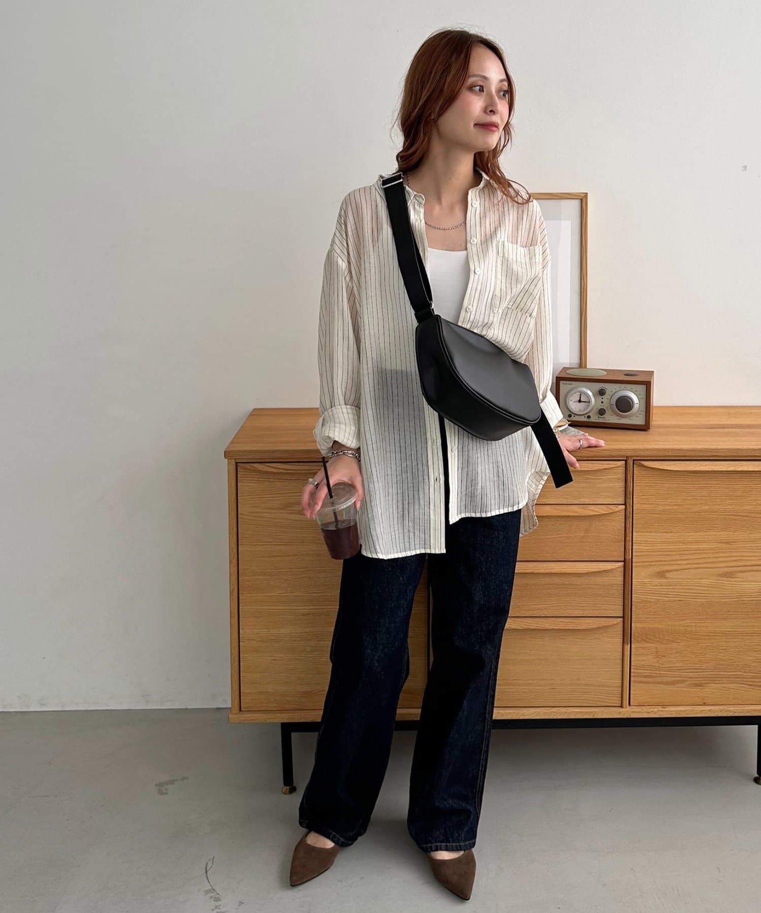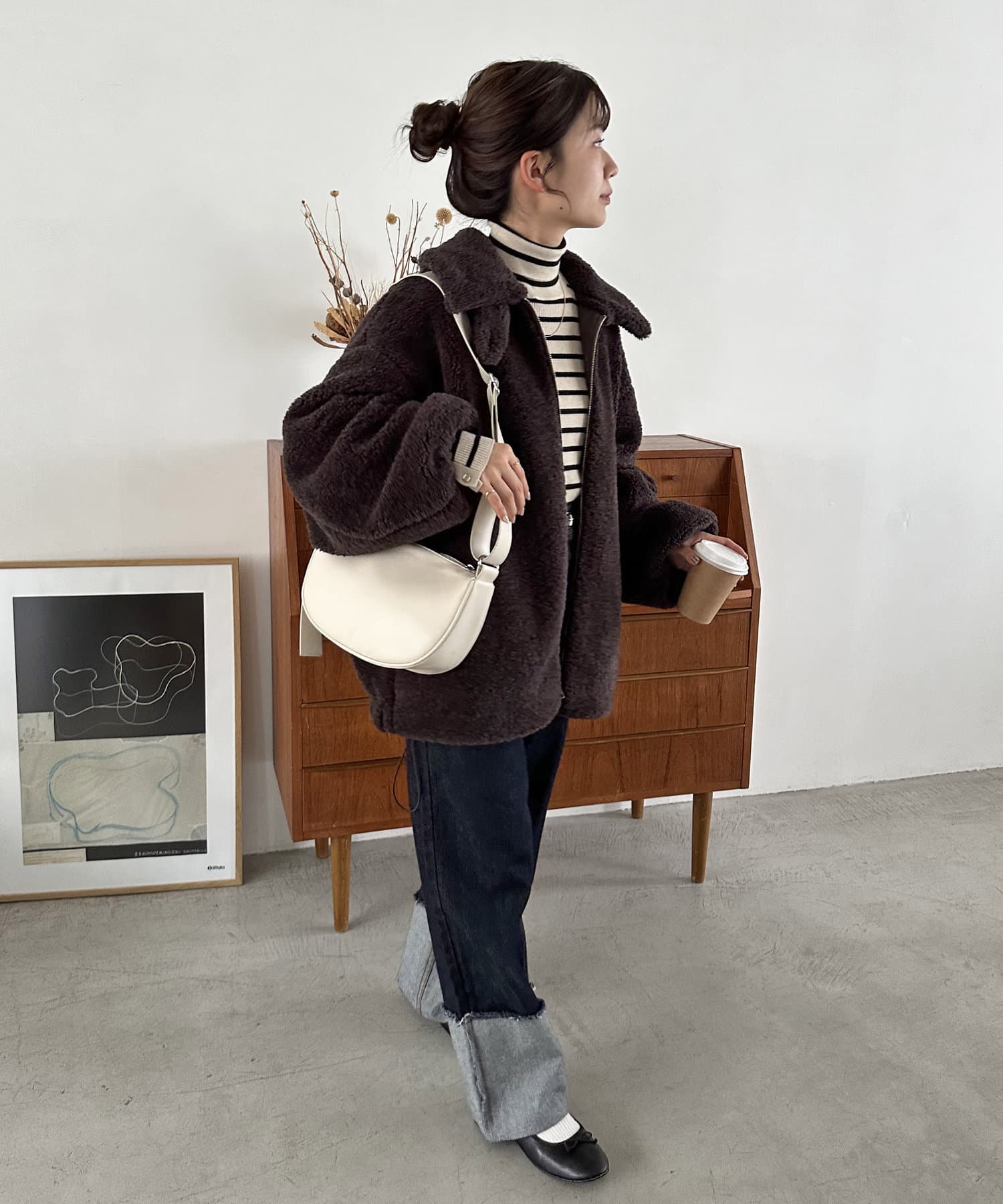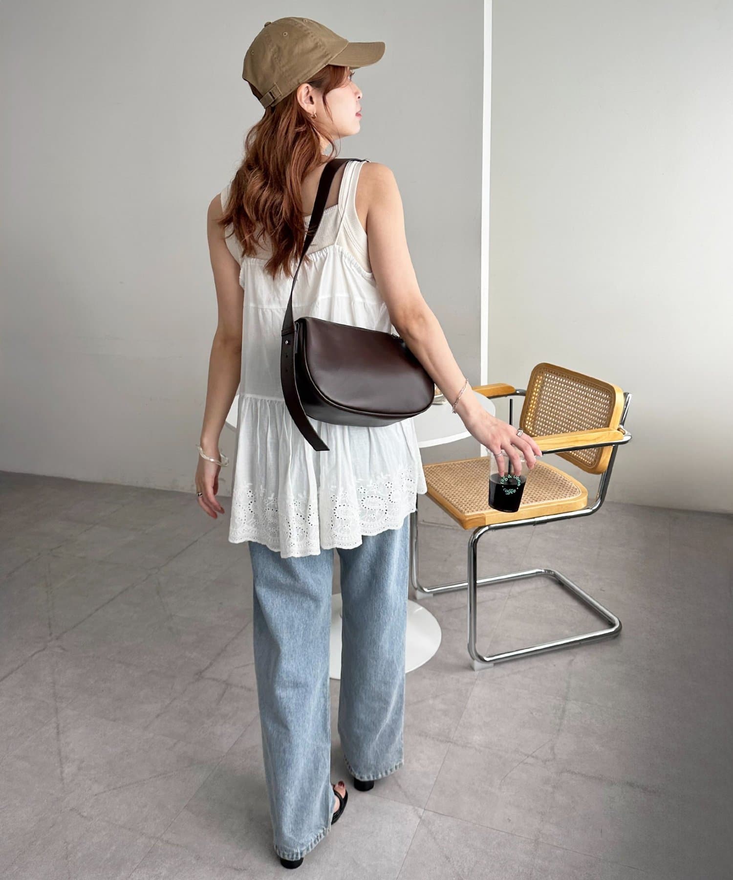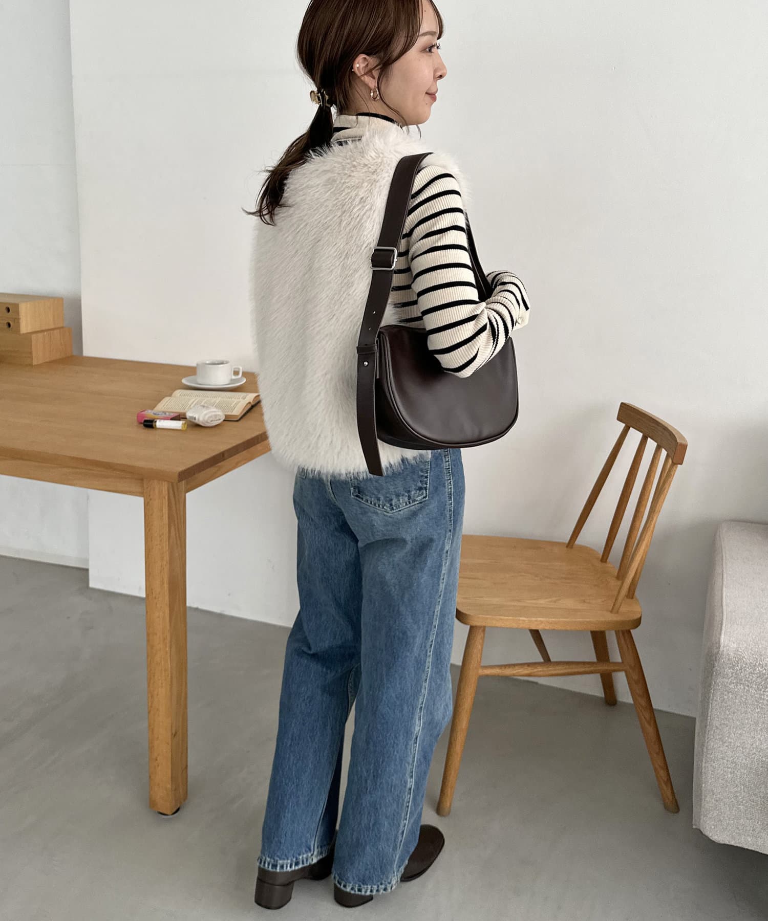 どんなテイストのコーデにも合うシンプルなデザインの半円ショルダーバッグ。マチが8.5㎝としっかりあるので自立するだけでなく、荷物を収納しやすいなど機能性にも優れています。また、ショルダー紐は太めのベルトデザインで肩が疲れにくく、さらに長さ調節可能なので様々な持ち方でお使いいただけます!さらに、開口部が大きく開く為、荷物の出し入れもしやすく、内側には小物を収納できるポケットもあり整理しながら収納できます。カラー展開はブラック・アイボリー・ダークブラウン・キャメルのベーシックな4色展開です♪