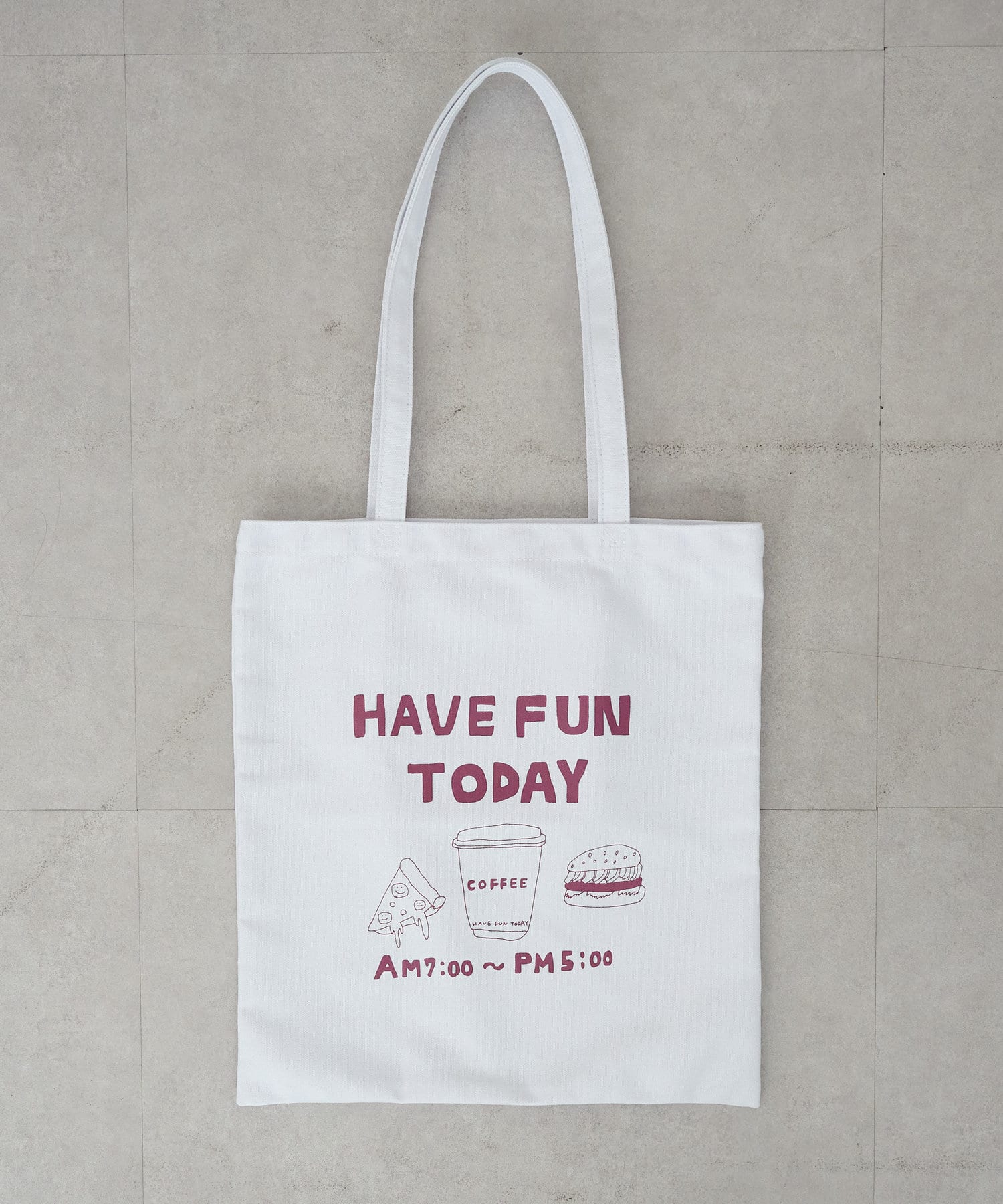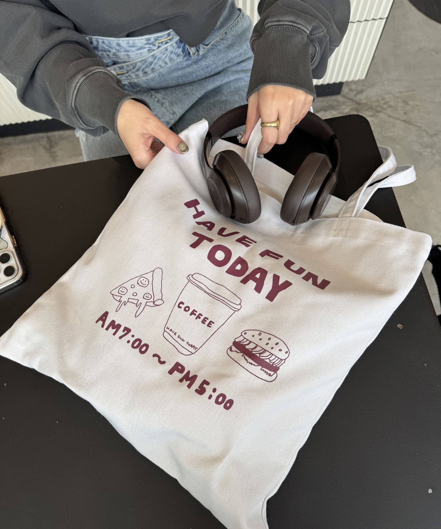 また、英語の文字にはインスタによく投稿している“バッグの中身”を参考に、このトートバッグに入れて持ち歩きそうなものを並べました♩