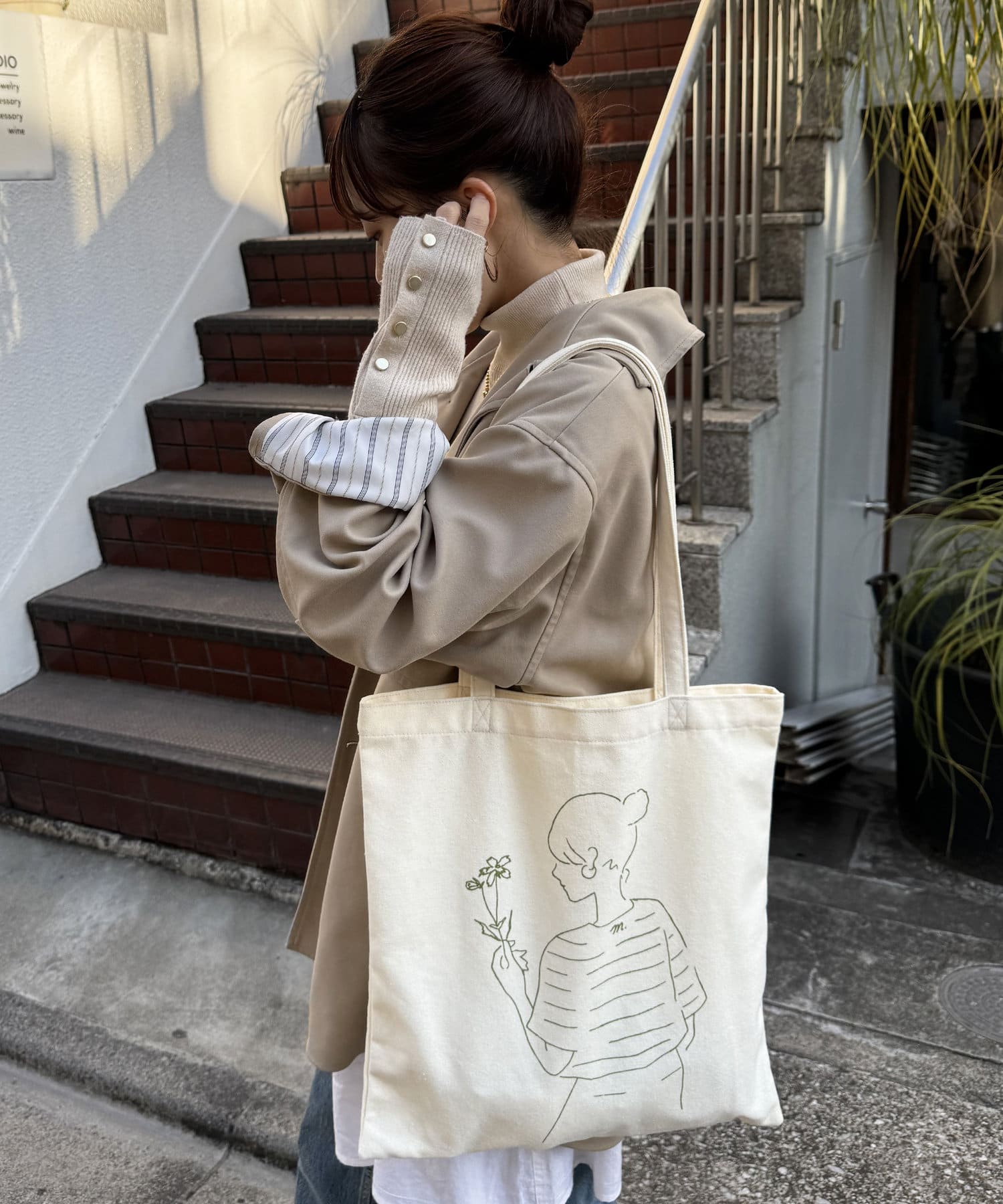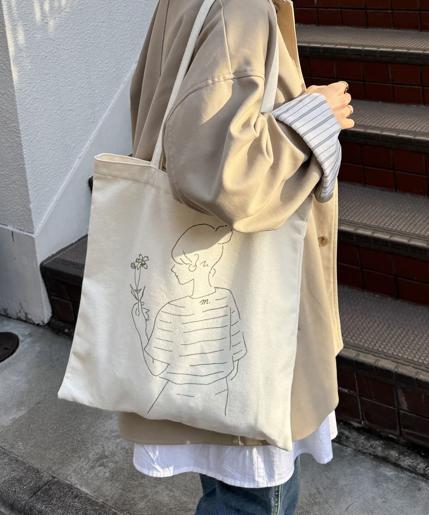 どんなお洋服にも合わせやすいベージュのトートに、ニュアンスっぽいタッチで柄を入れました!