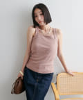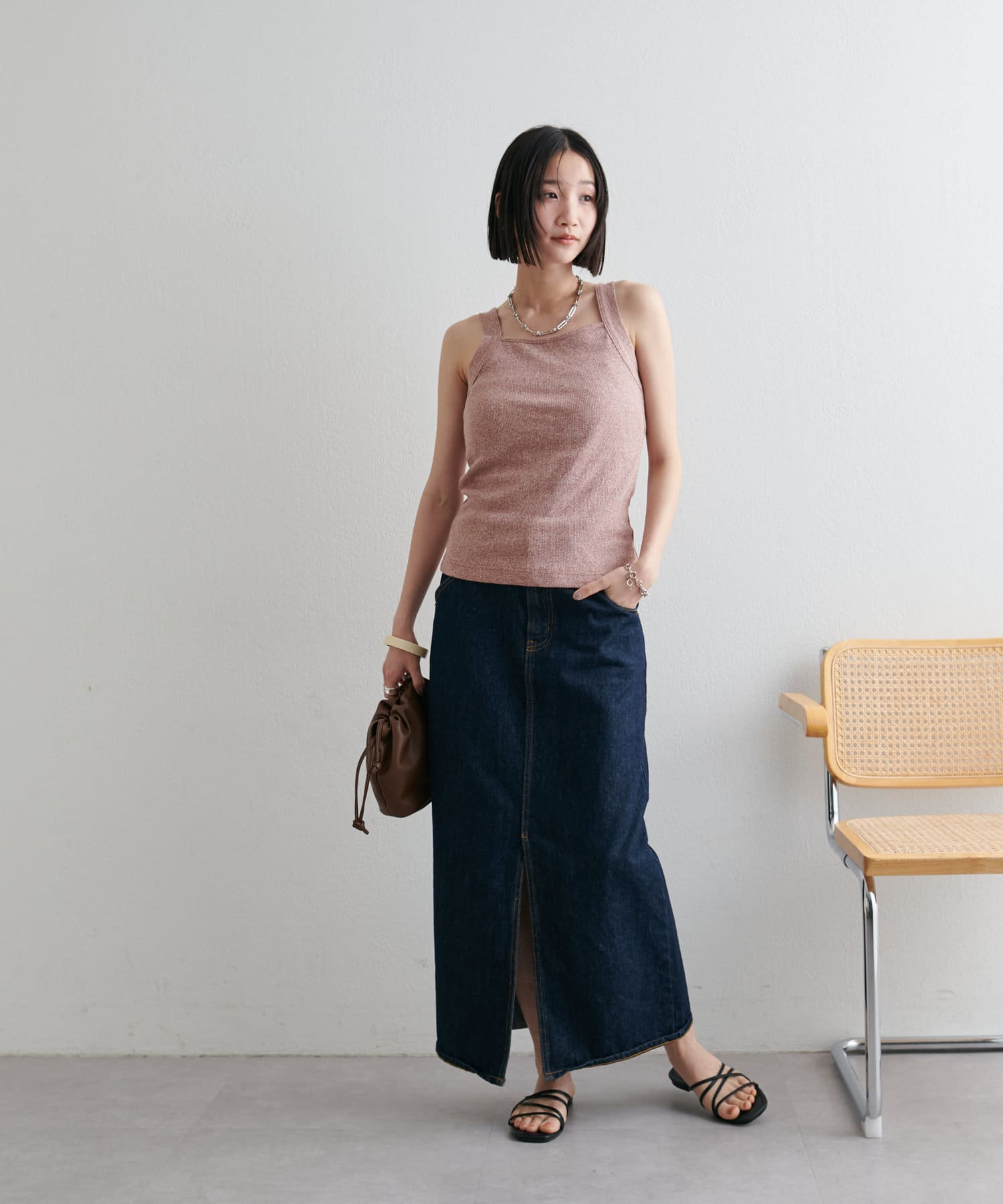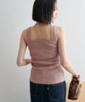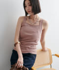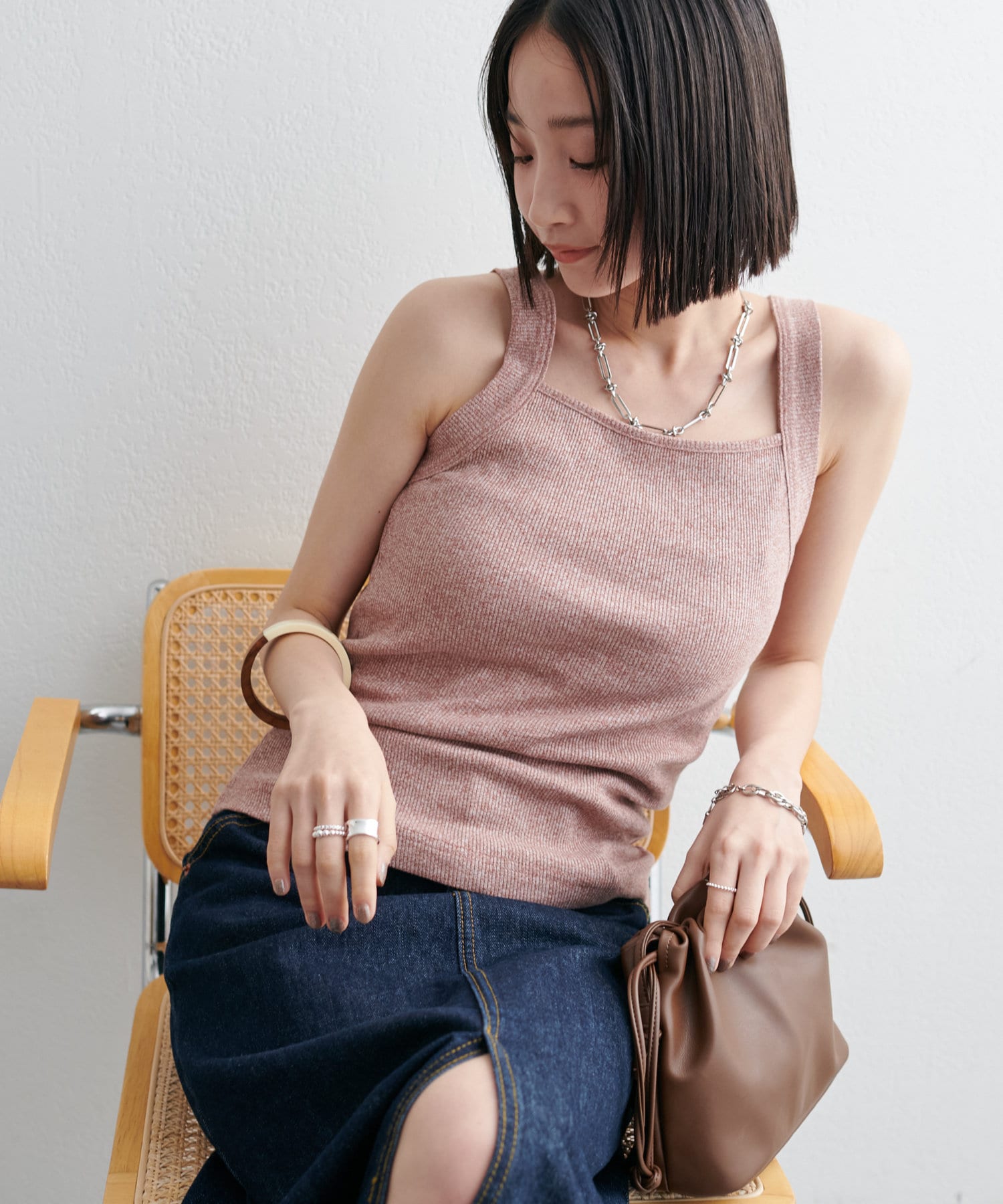 デコルテをきれいに見せてくれるスクエアネックが印象的な、シンプルながらも女性らしさを引き立てるタンクトップ。