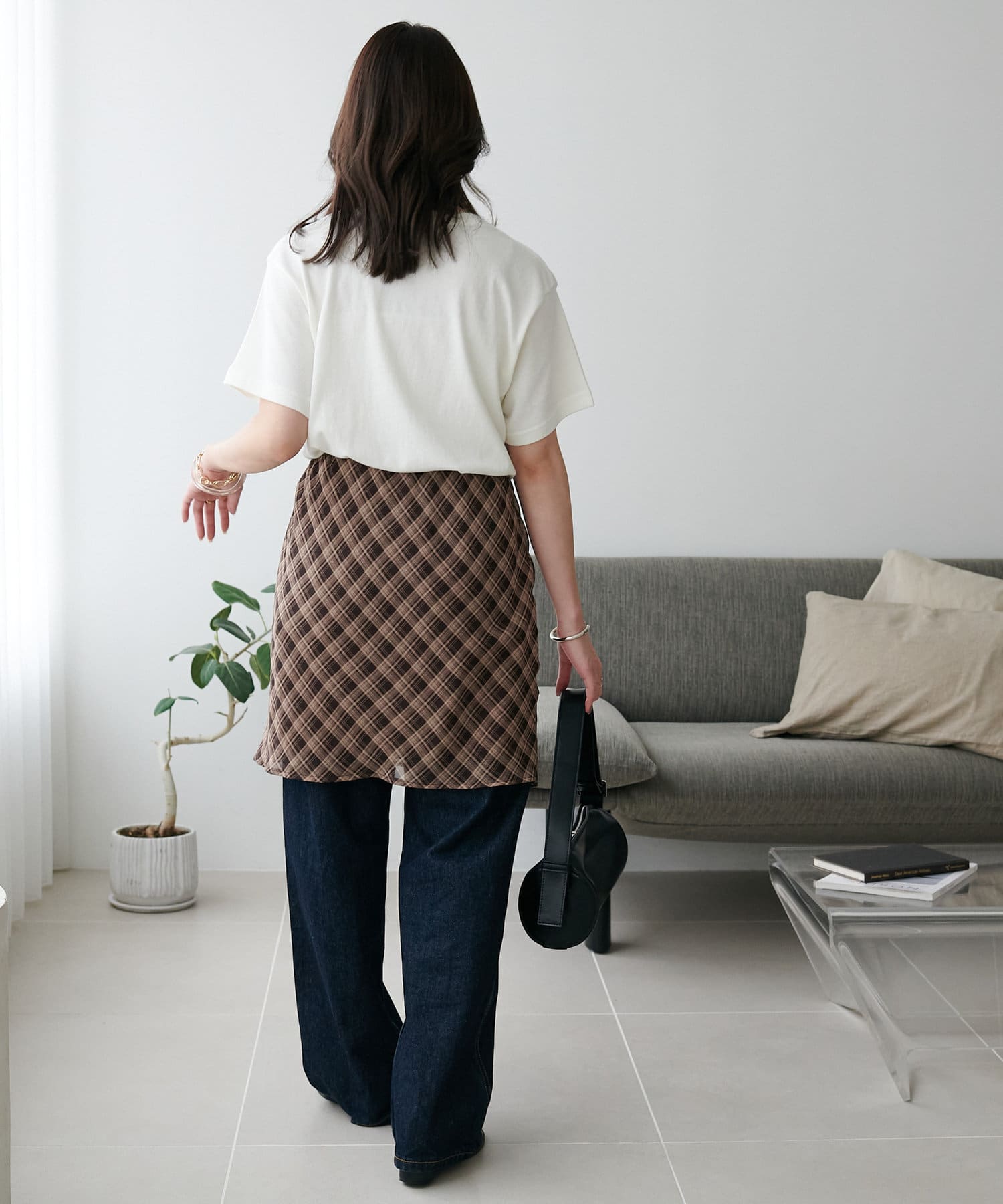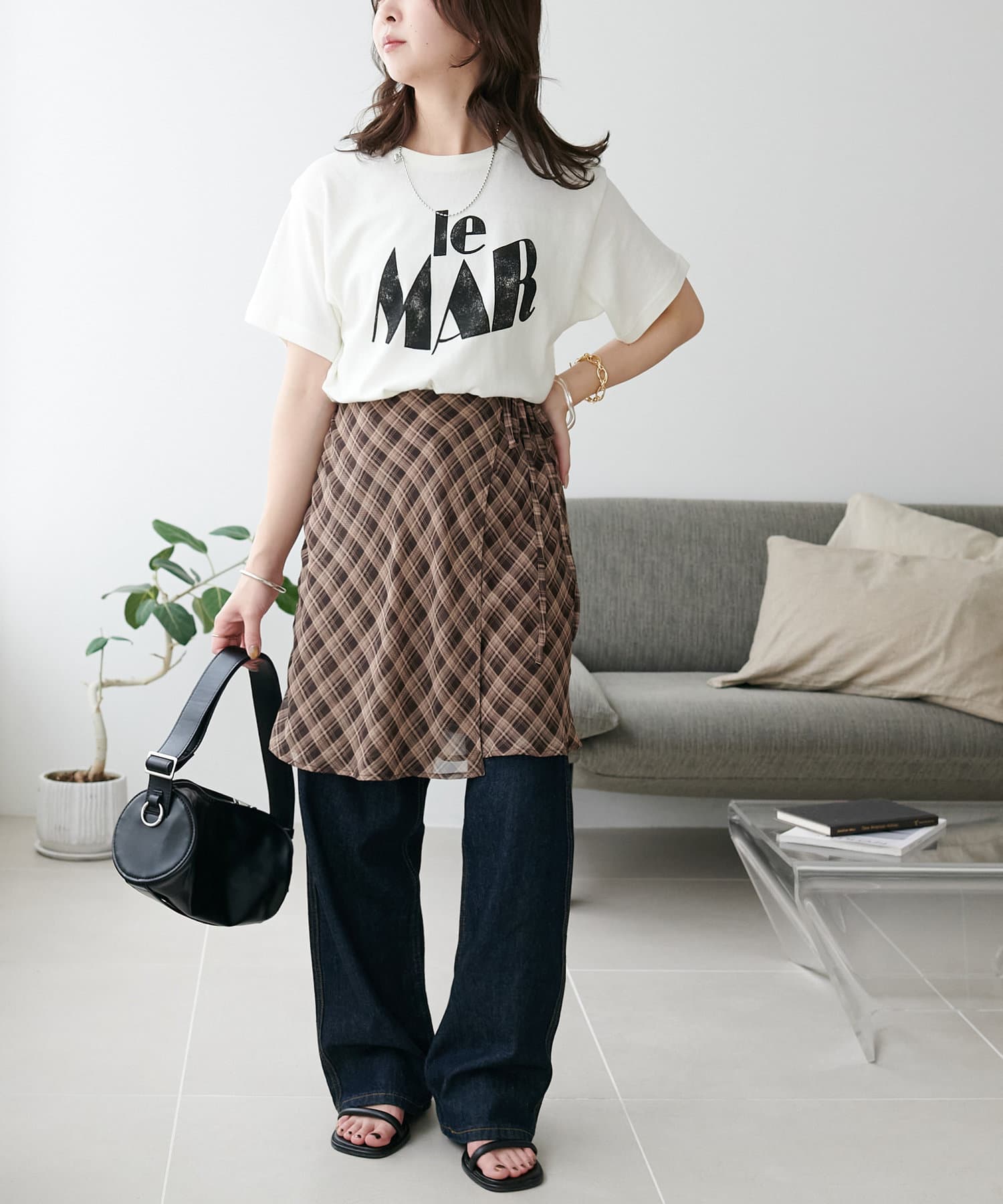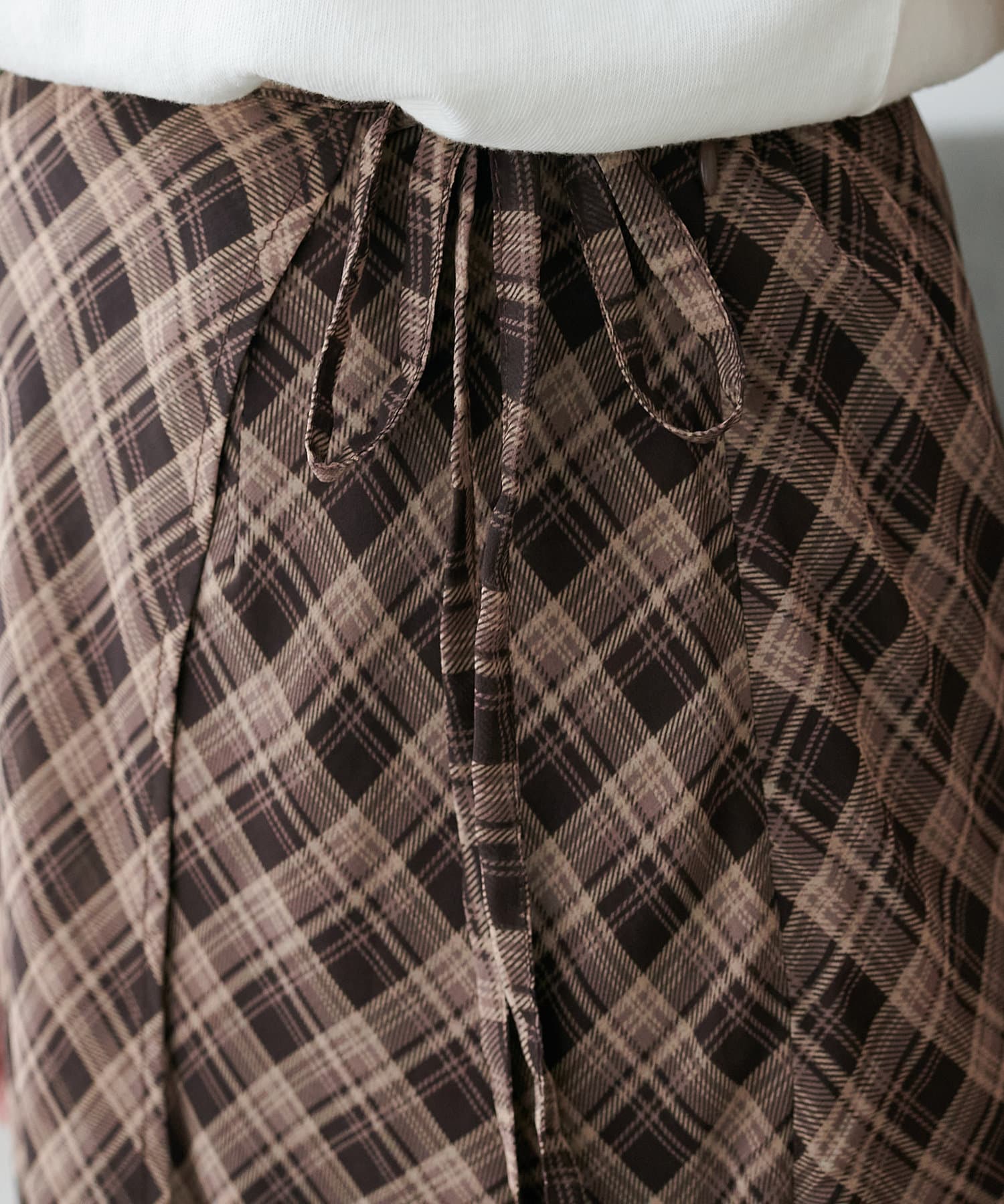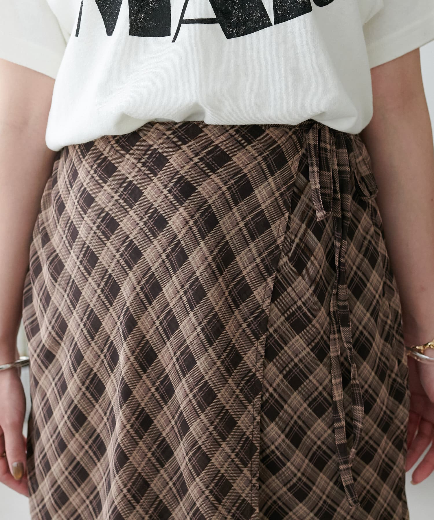チェック柄のクラシカルな雰囲気に、ラップデザインならではの抜け感が加わることで、ほどよくカジュアルダウンされ、日常に取り入れやすい仕上がりに。