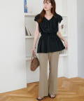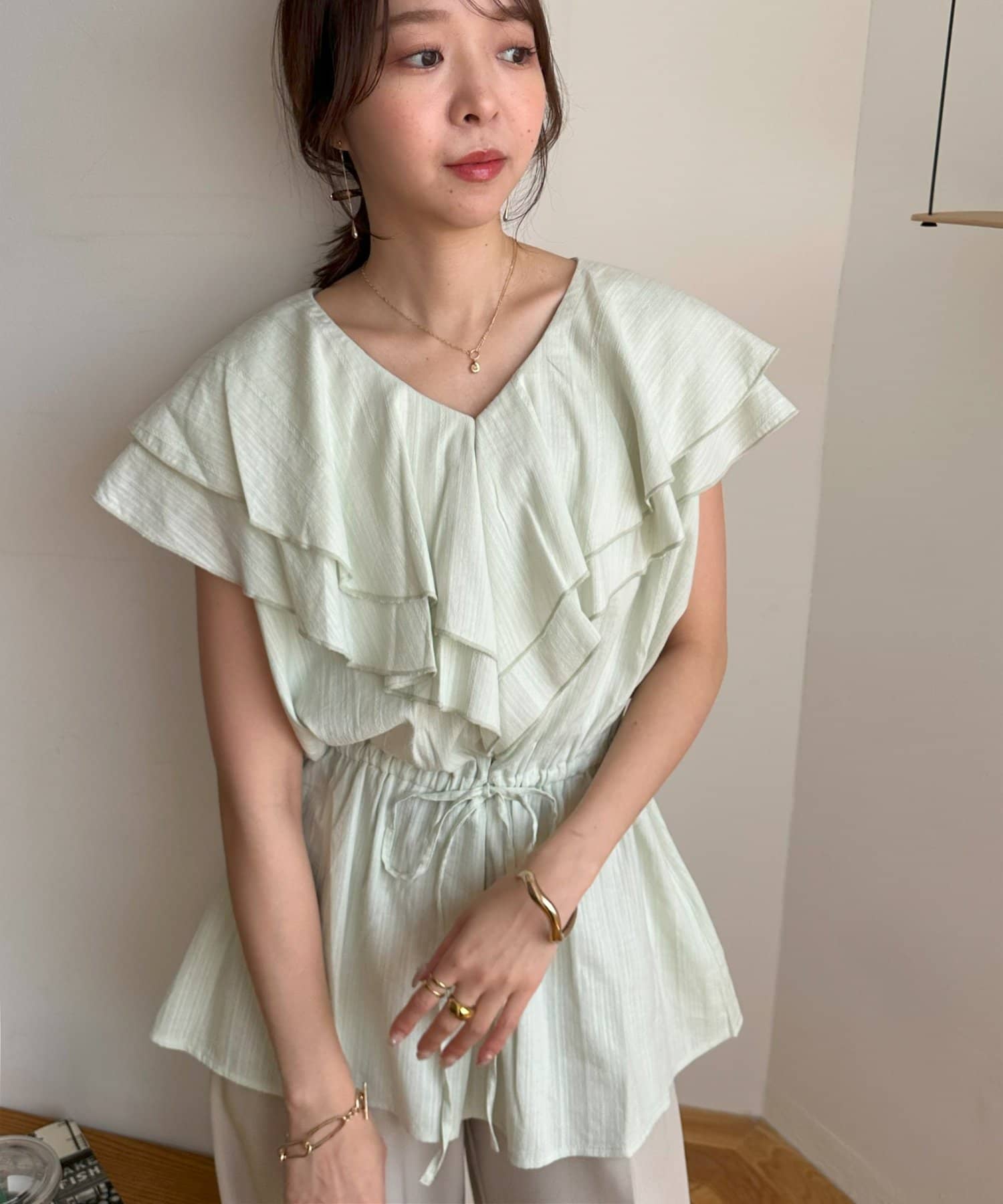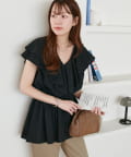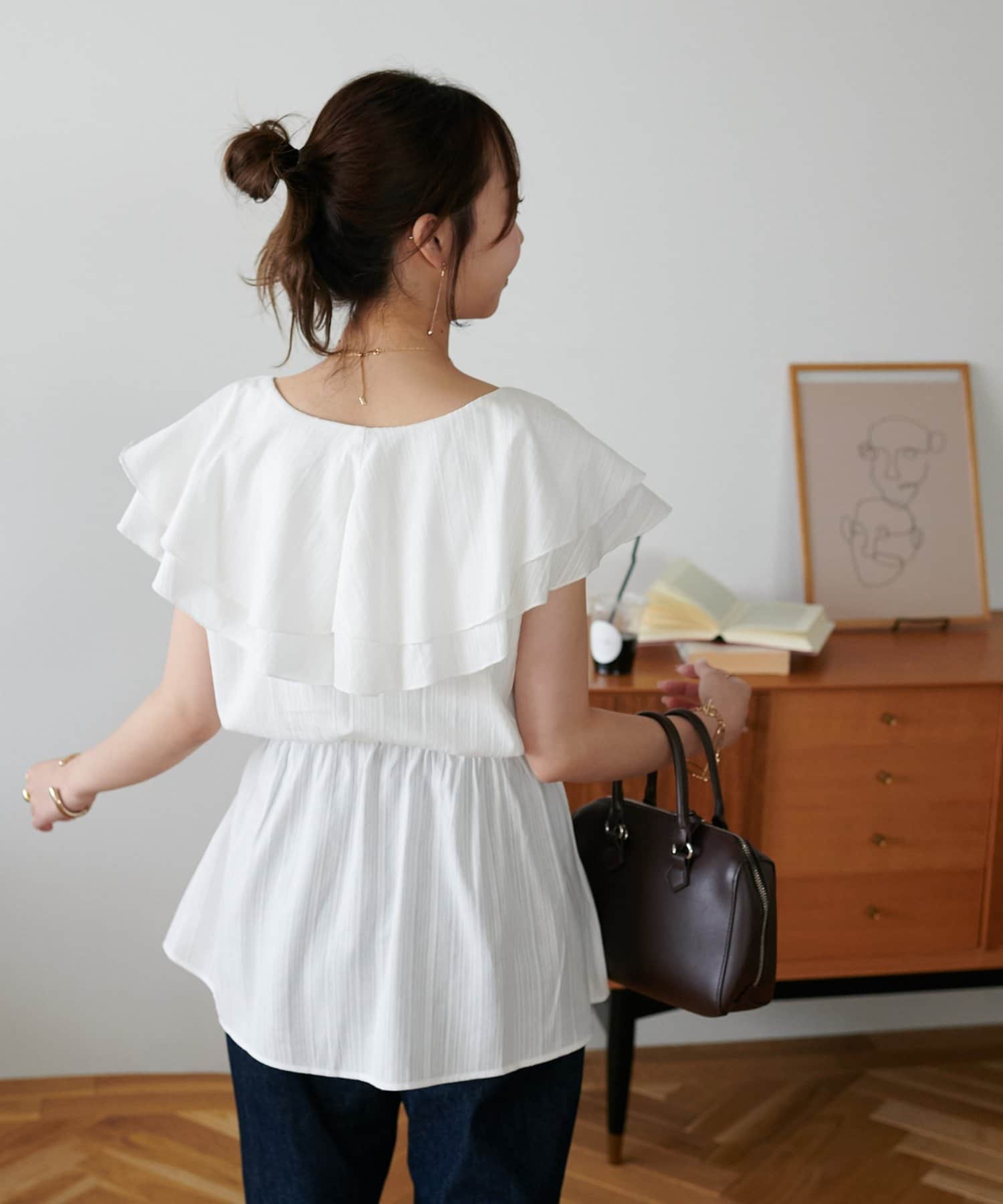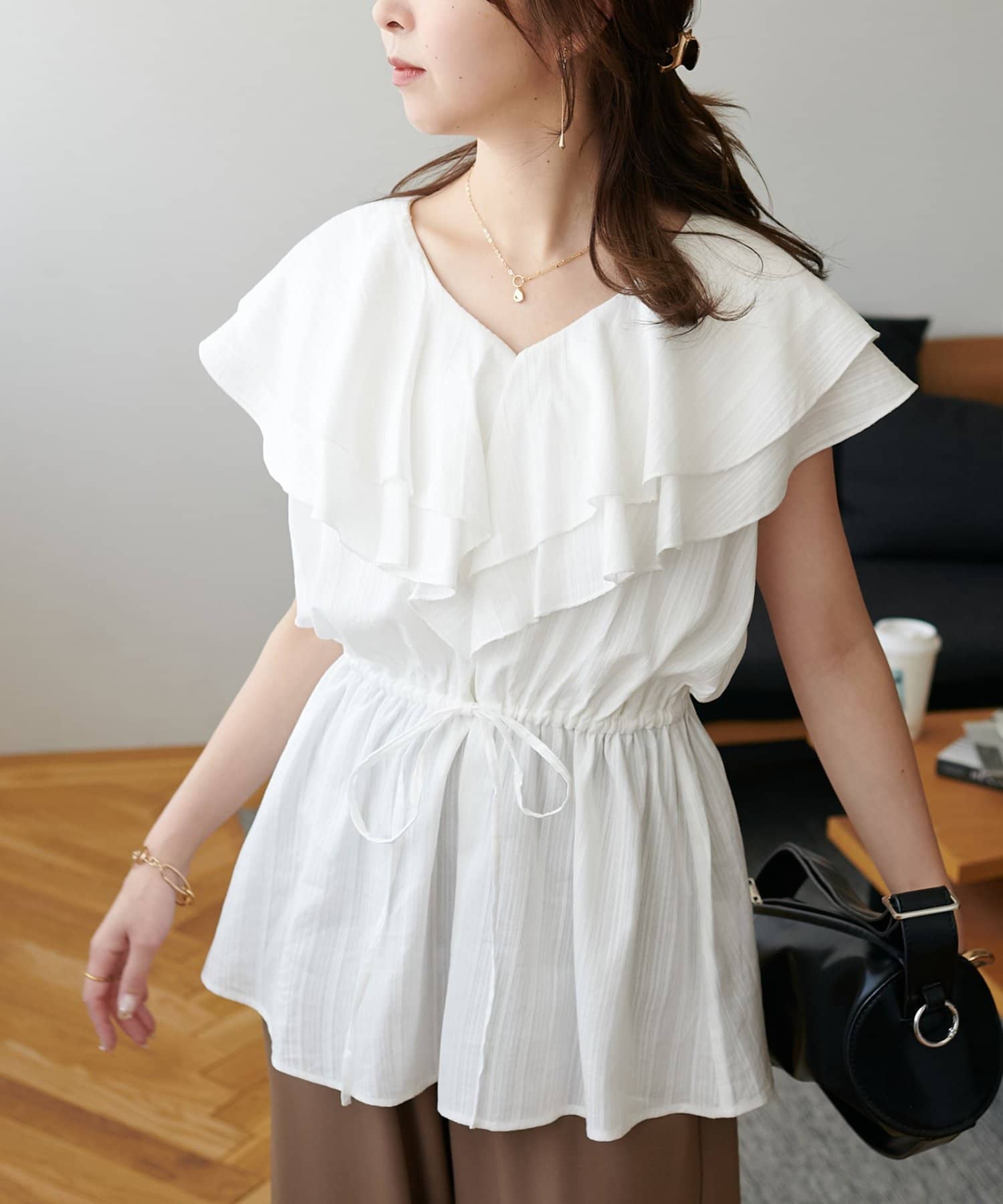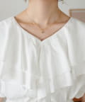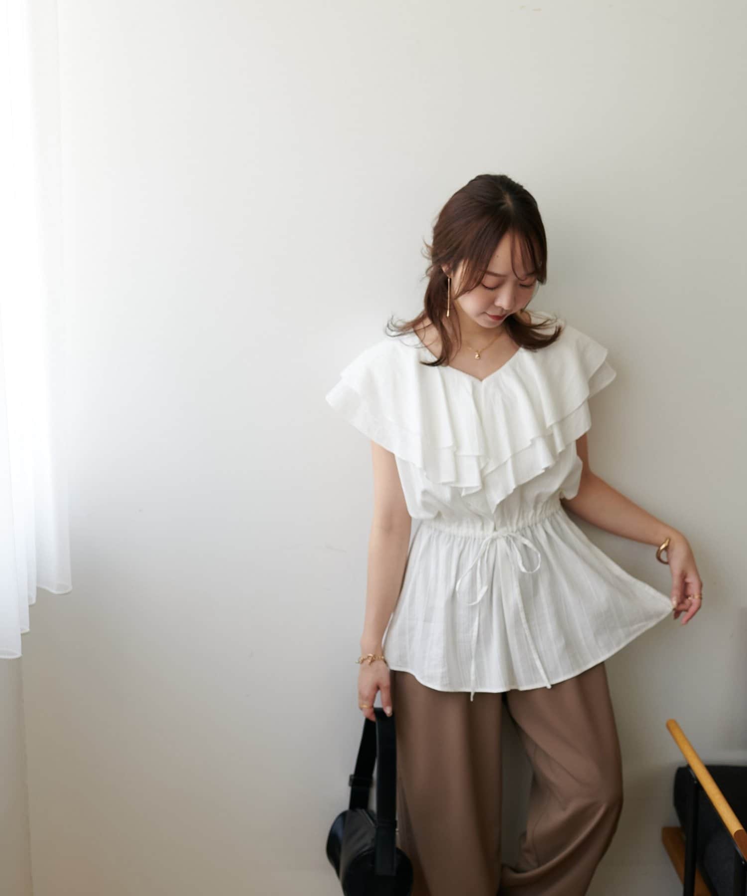 Vネックの程よい抜け感と、フリルの立体感が絶妙にマッチし、甘すぎず大人フェミニンな雰囲気に。