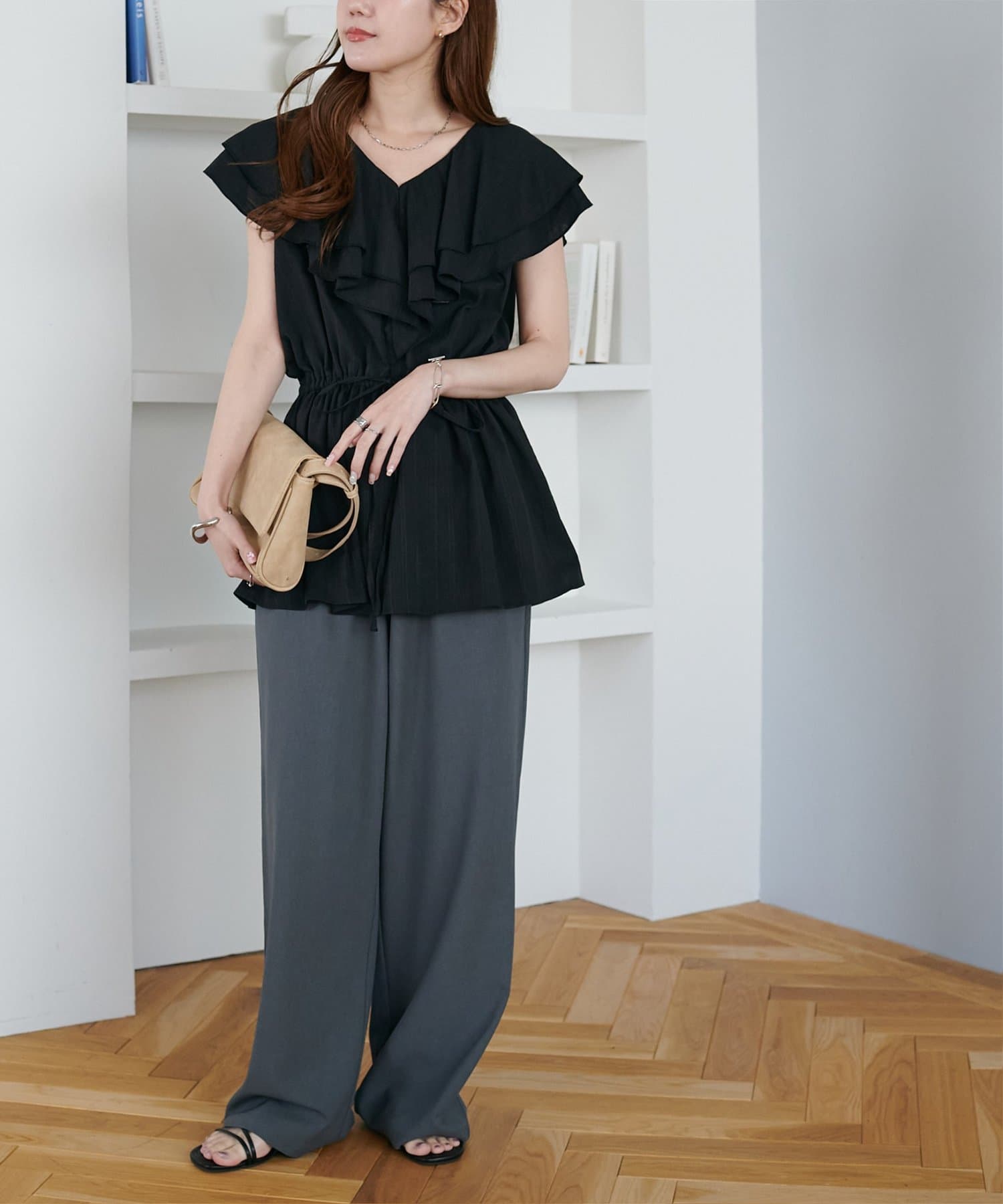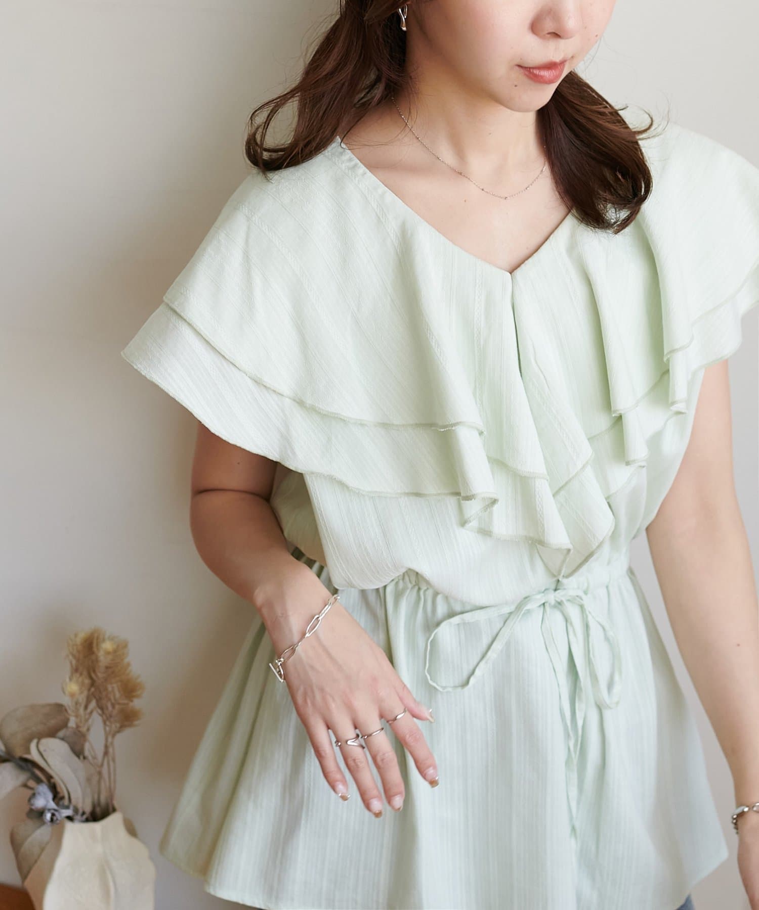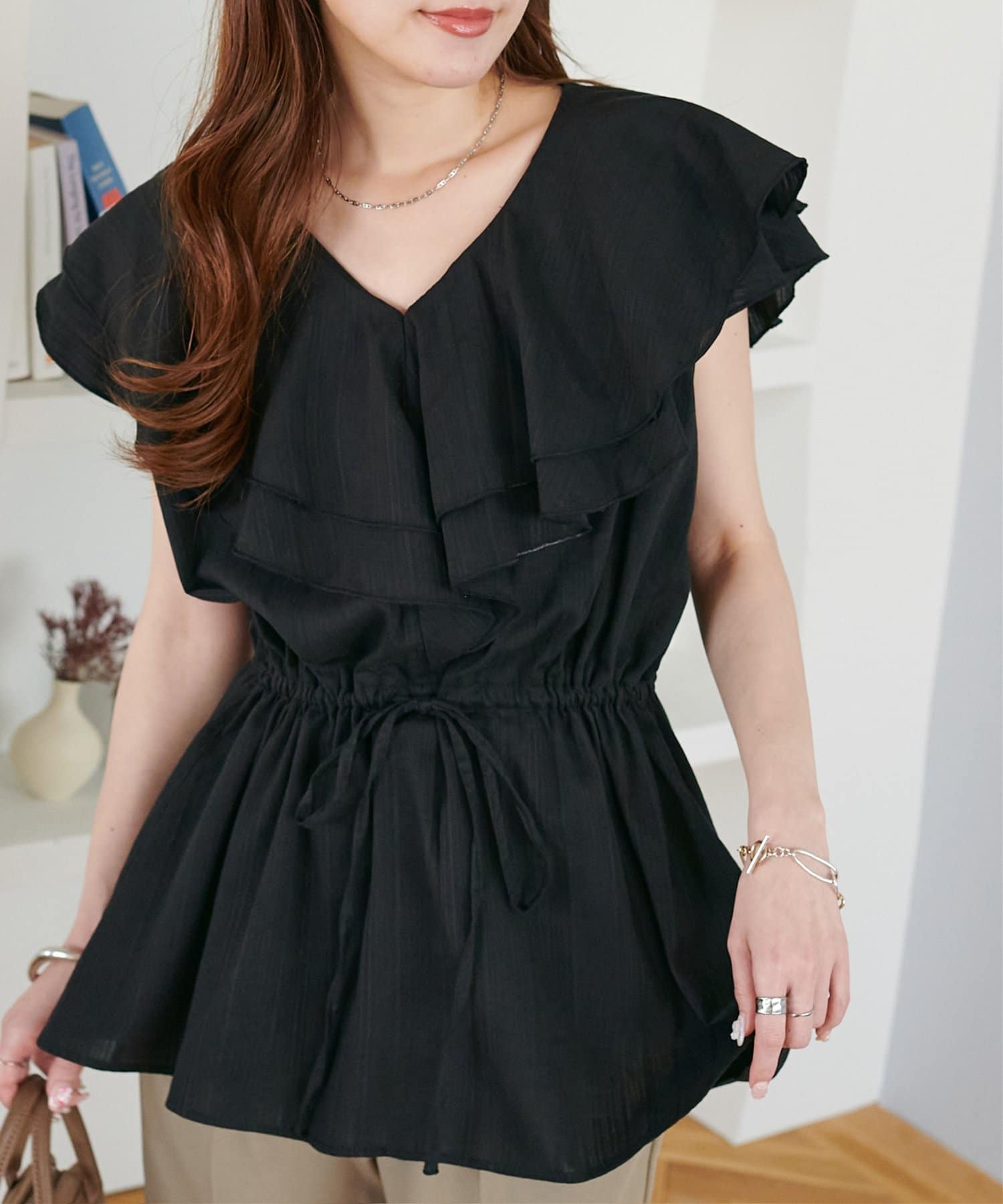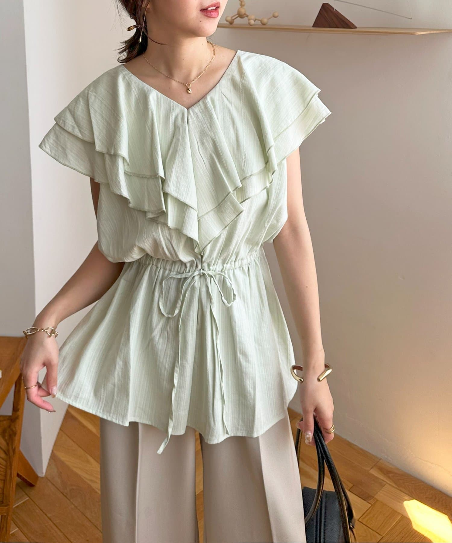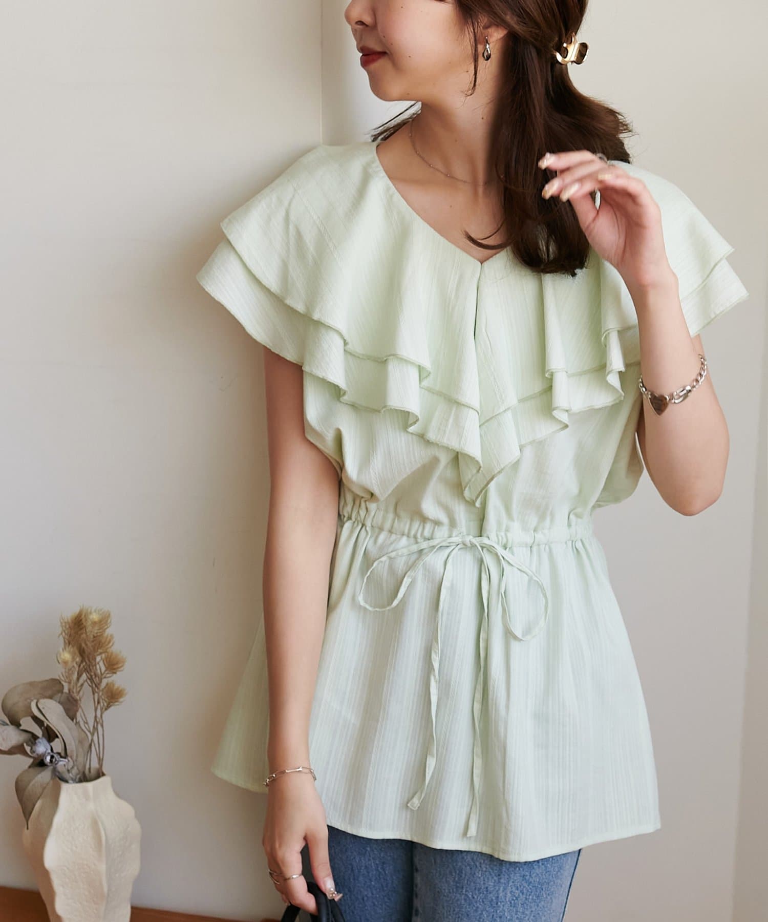 Vネックの程よい抜け感と、フリルの立体感が絶妙にマッチし、甘すぎず大人フェミニンな雰囲気に。