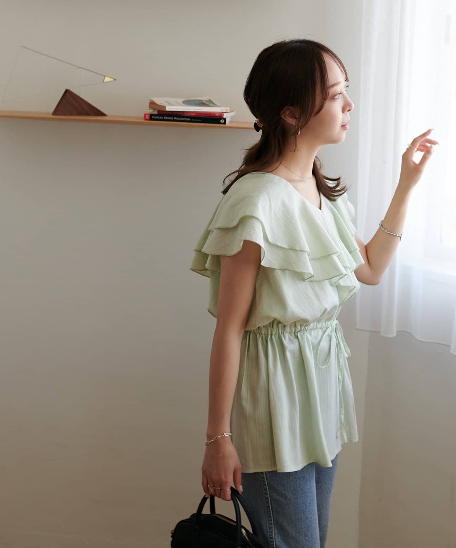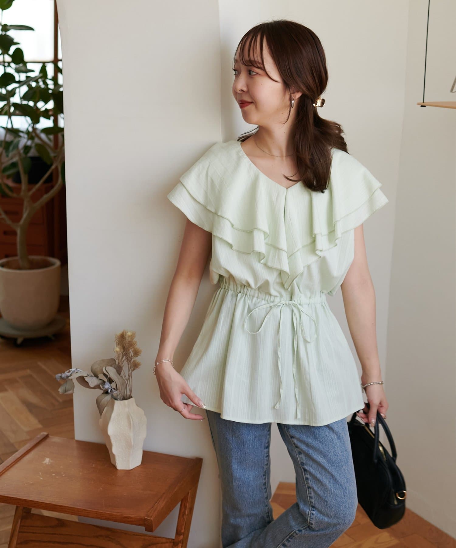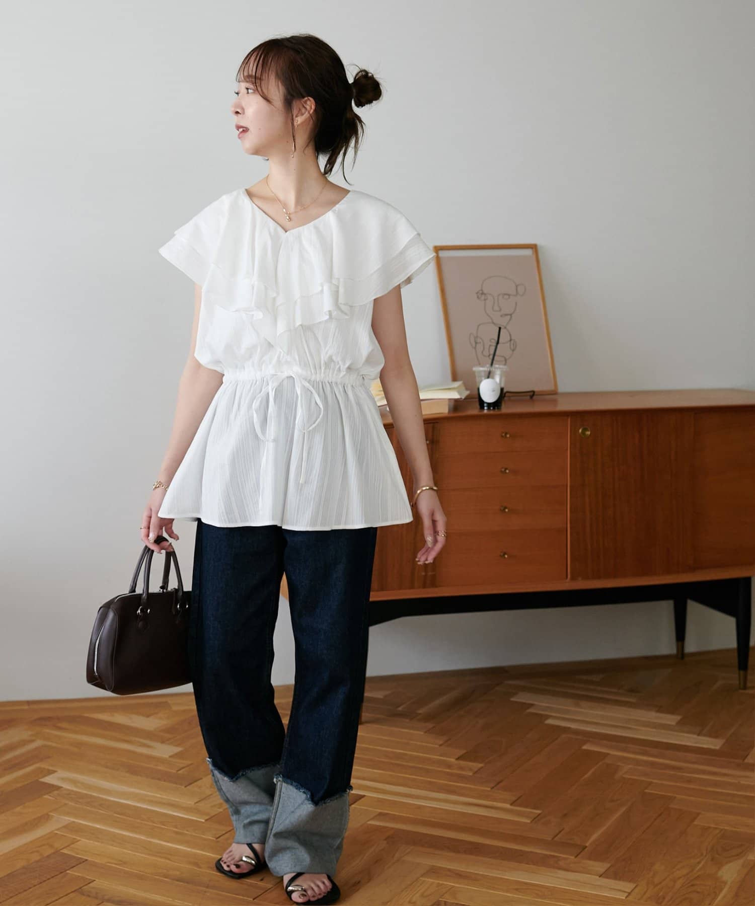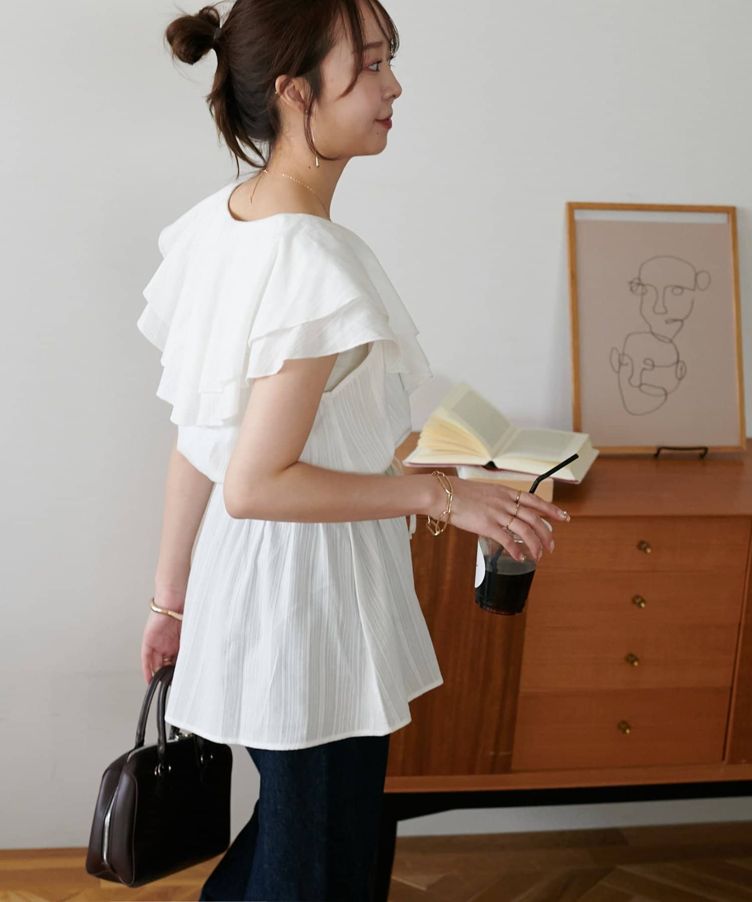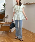 Vネックの程よい抜け感と、フリルの立体感が絶妙にマッチし、甘すぎず大人フェミニンな雰囲気に。