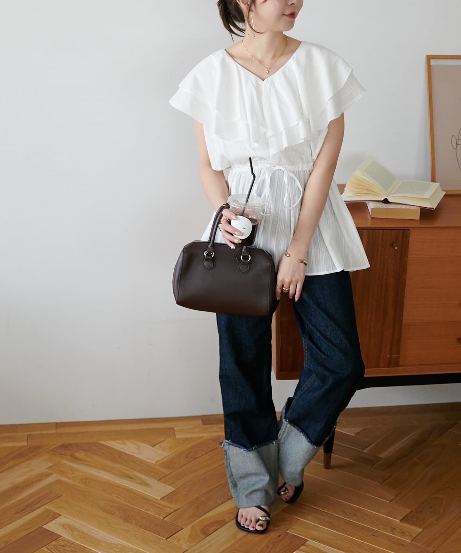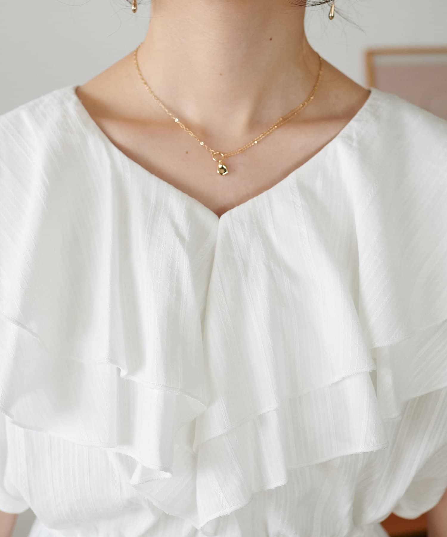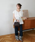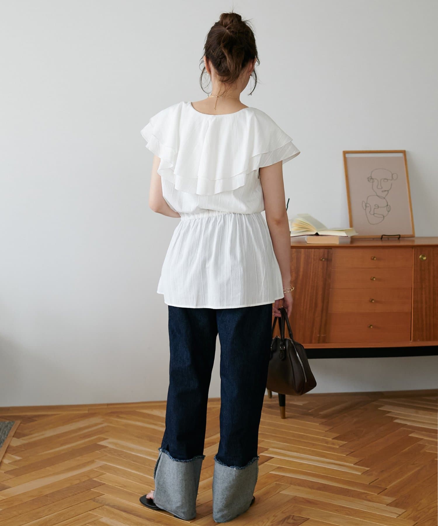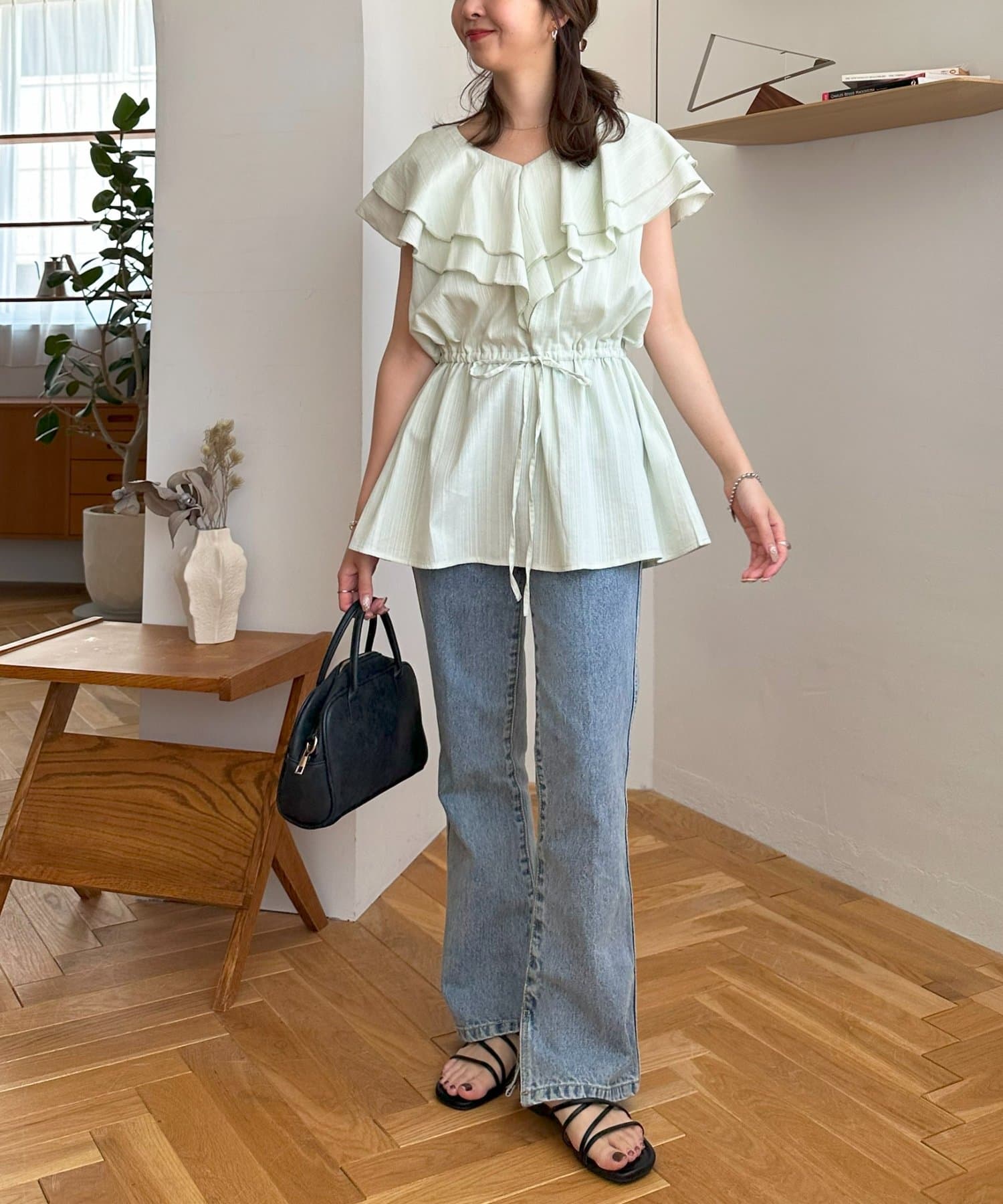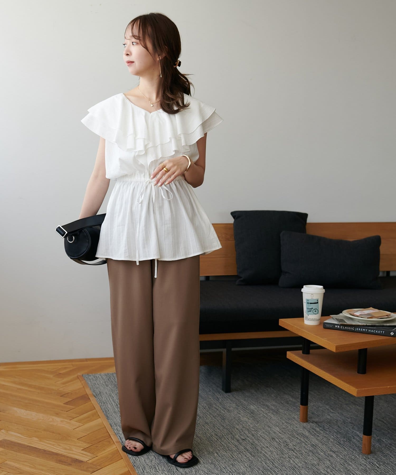 Vネックの程よい抜け感と、フリルの立体感が絶妙にマッチし、甘すぎず大人フェミニンな雰囲気に。