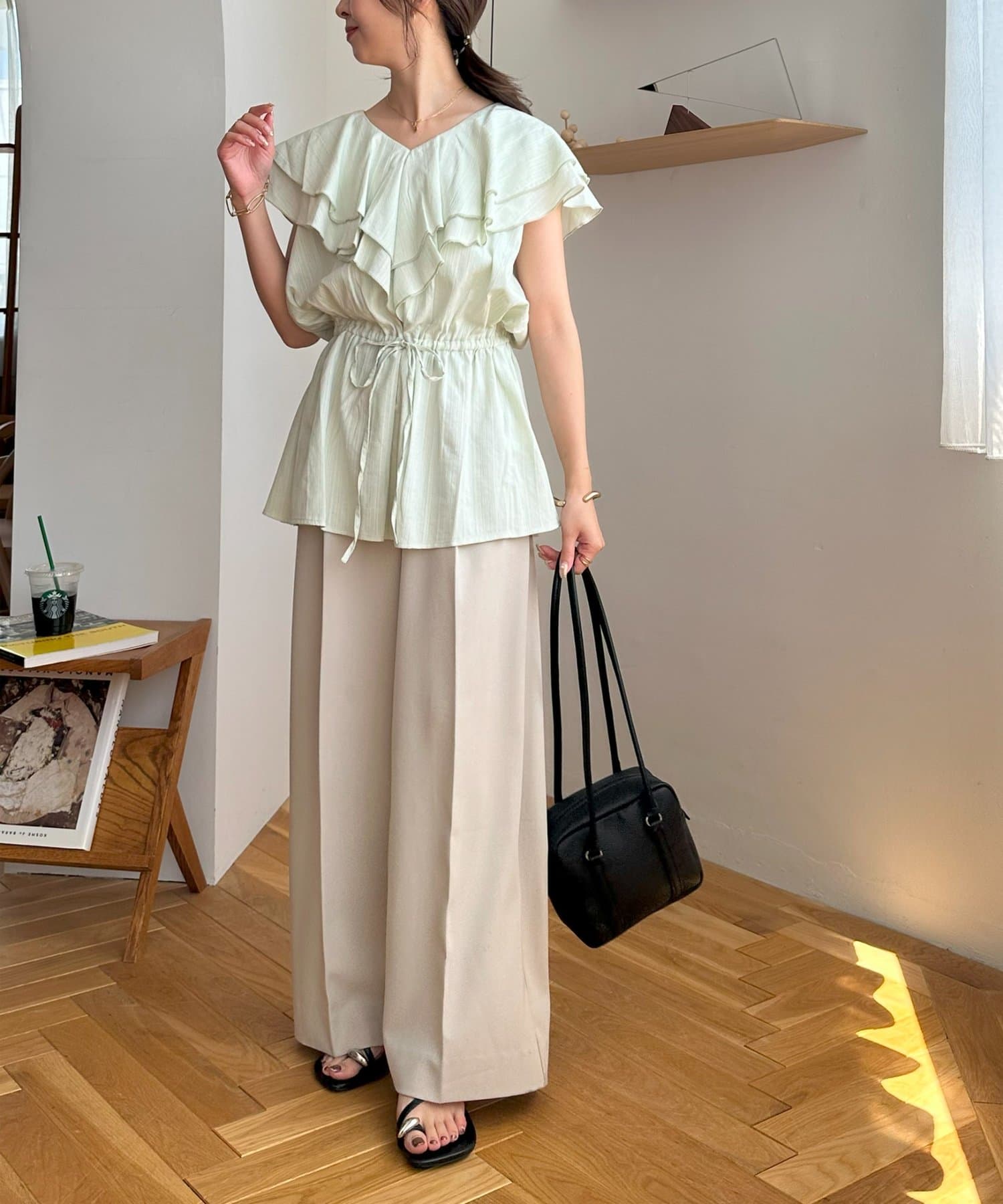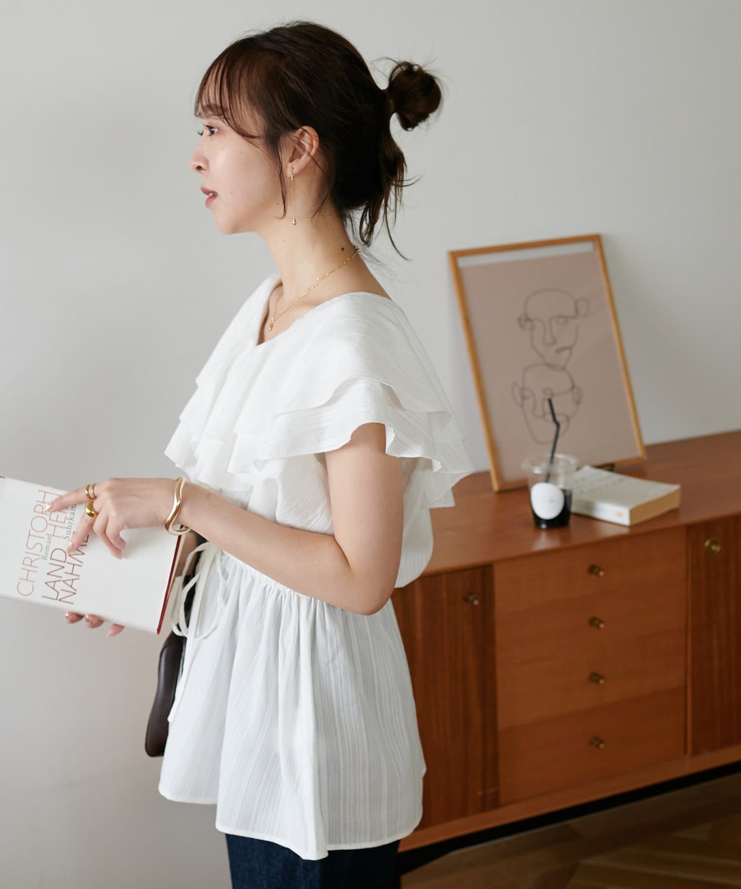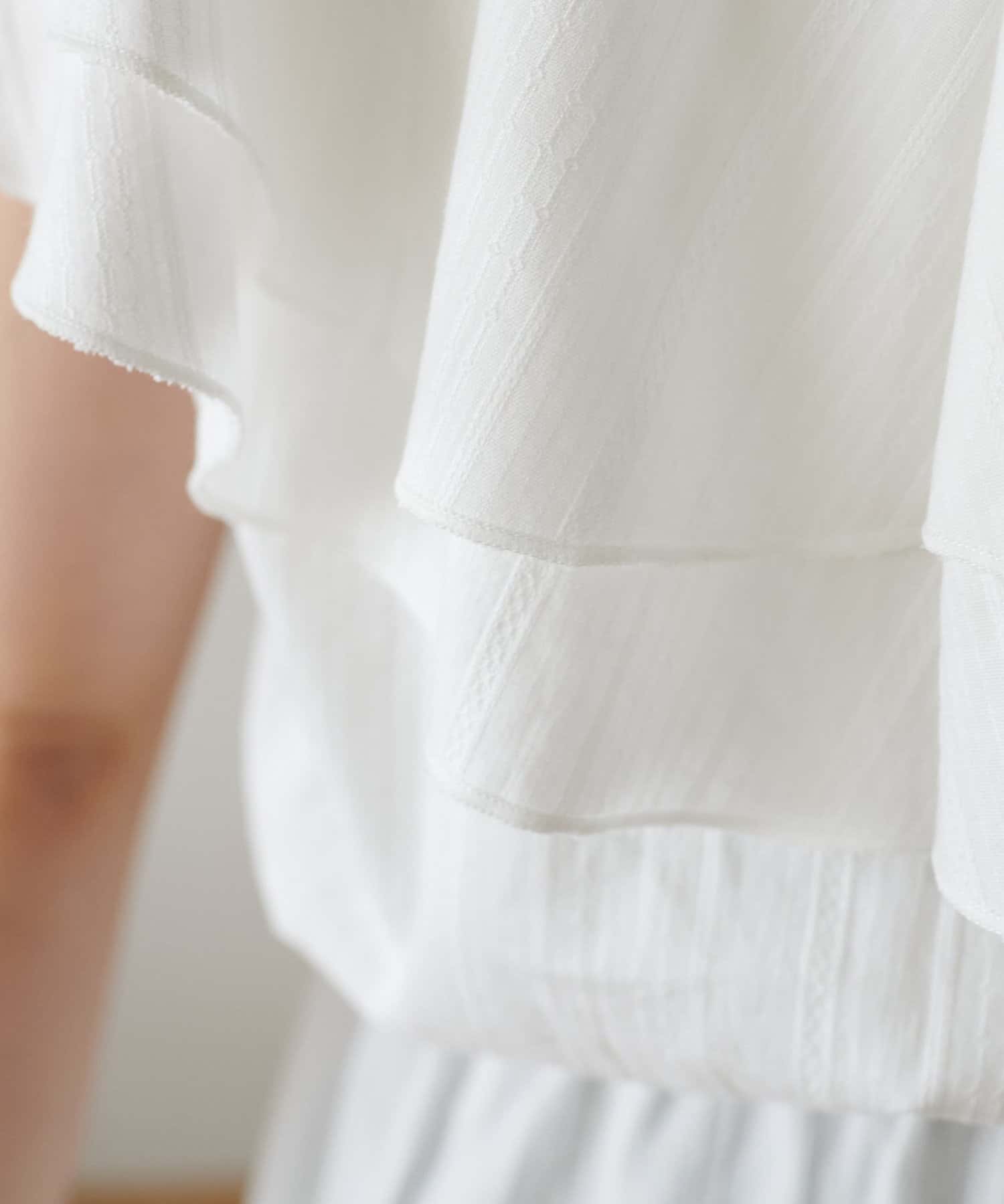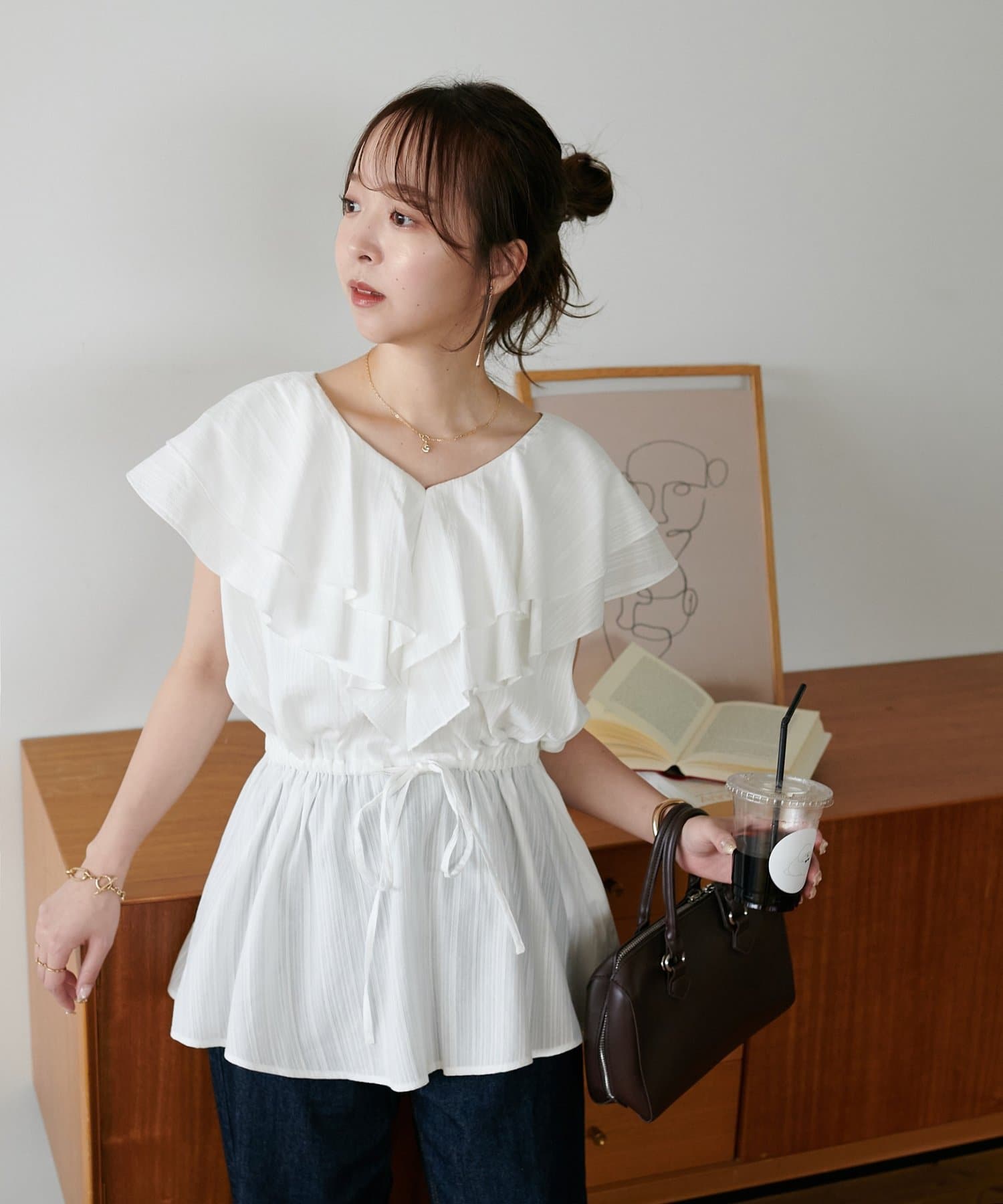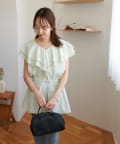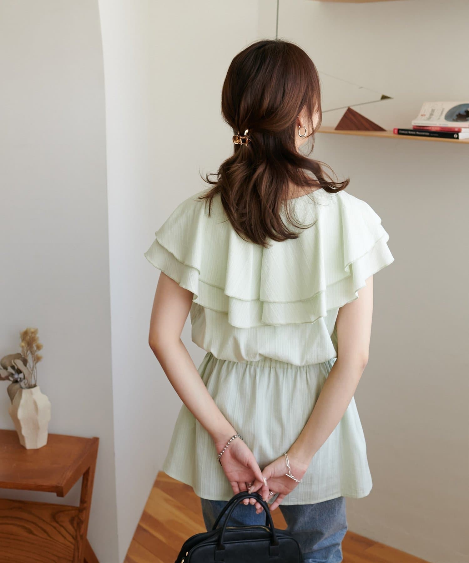 Vネックの程よい抜け感と、フリルの立体感が絶妙にマッチし、甘すぎず大人フェミニンな雰囲気に。