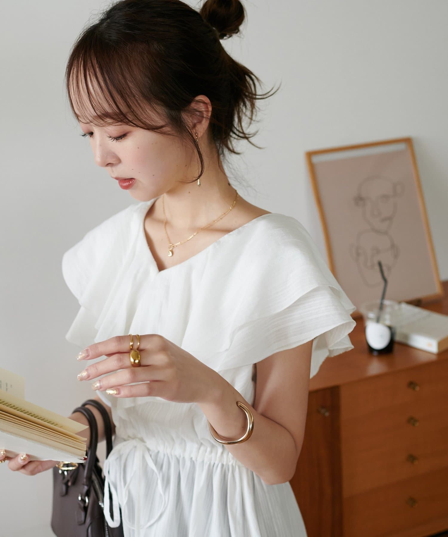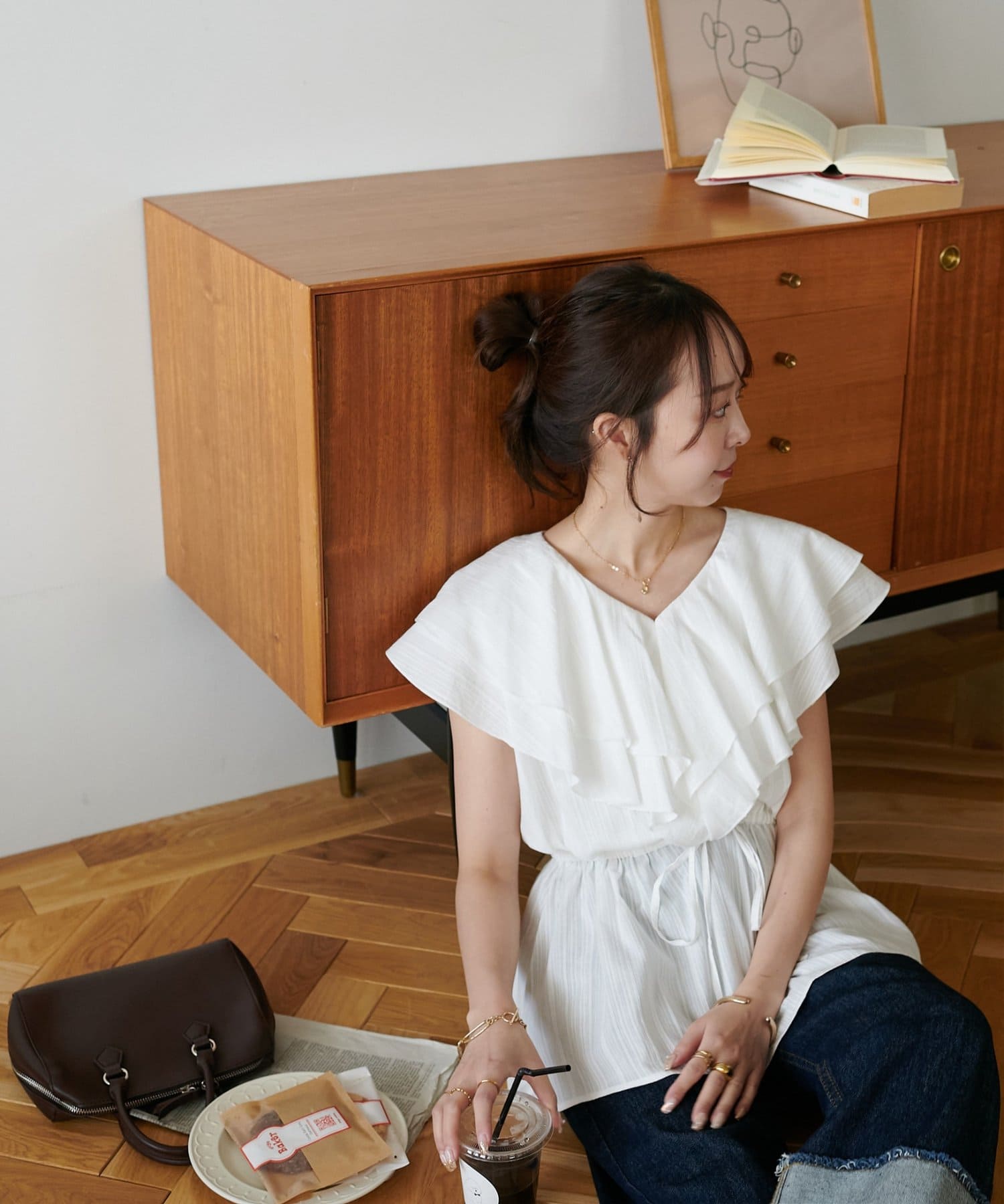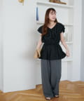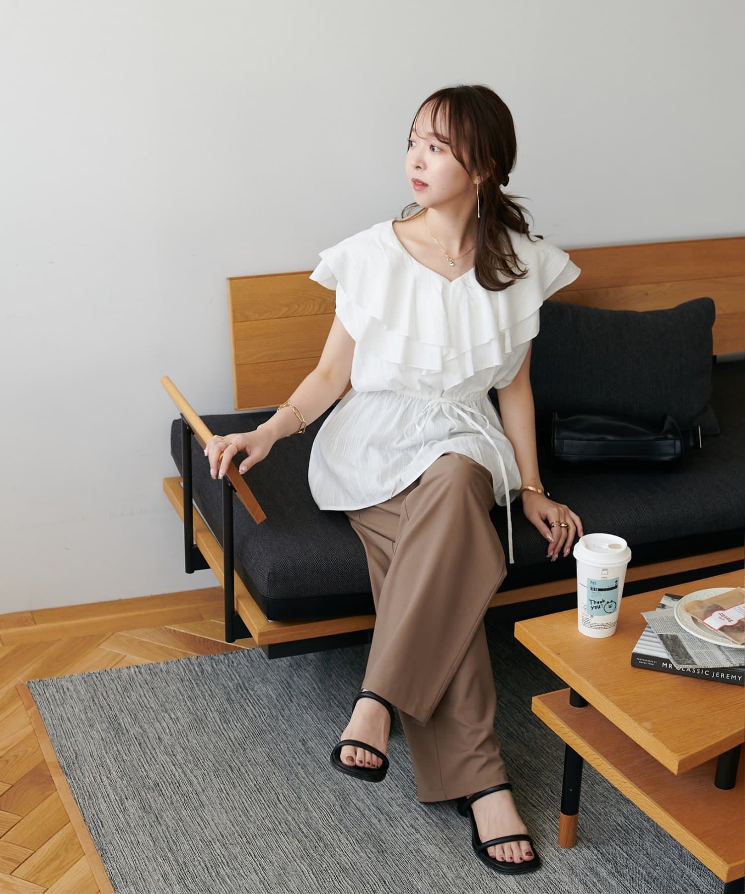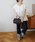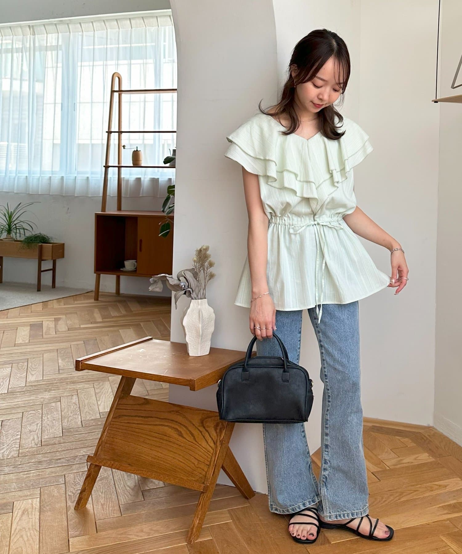 Vネックの程よい抜け感と、フリルの立体感が絶妙にマッチし、甘すぎず大人フェミニンな雰囲気に。