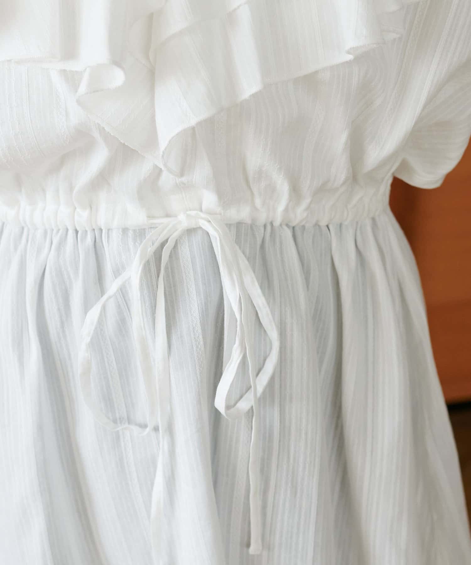153cmスタッフ:ウエストマークでメリハリが出るので、低身長さんにもおすすめです!フリルデザインが肩まわりを自然にカバーしてくれるので、ノースリーブでも安心感があります。