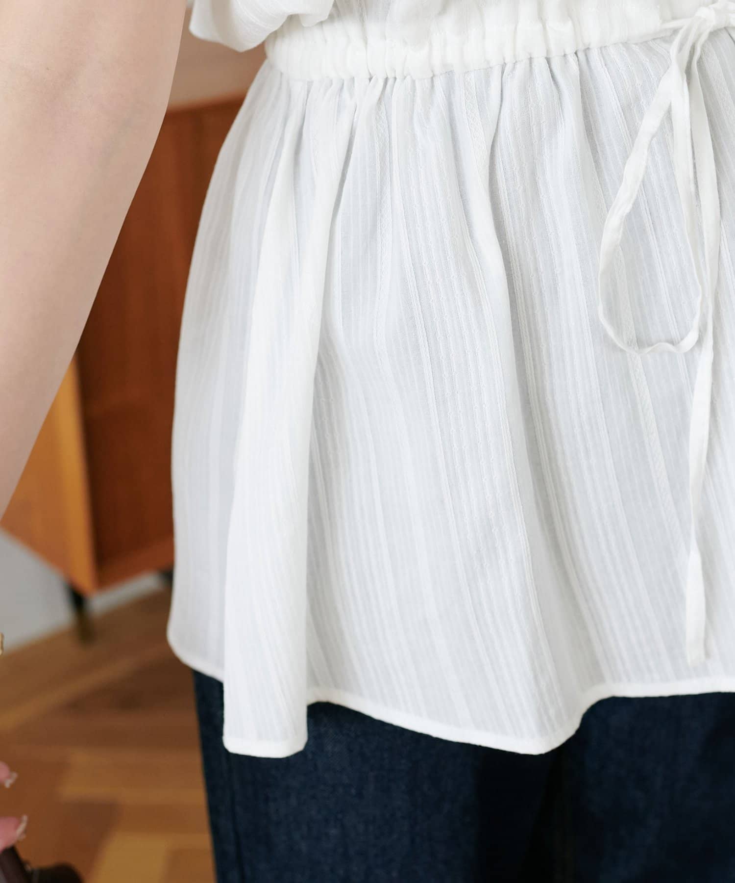 ウエスト部分は紐で絞れる仕様になっており、好みに合わせてシルエットを調整可能。