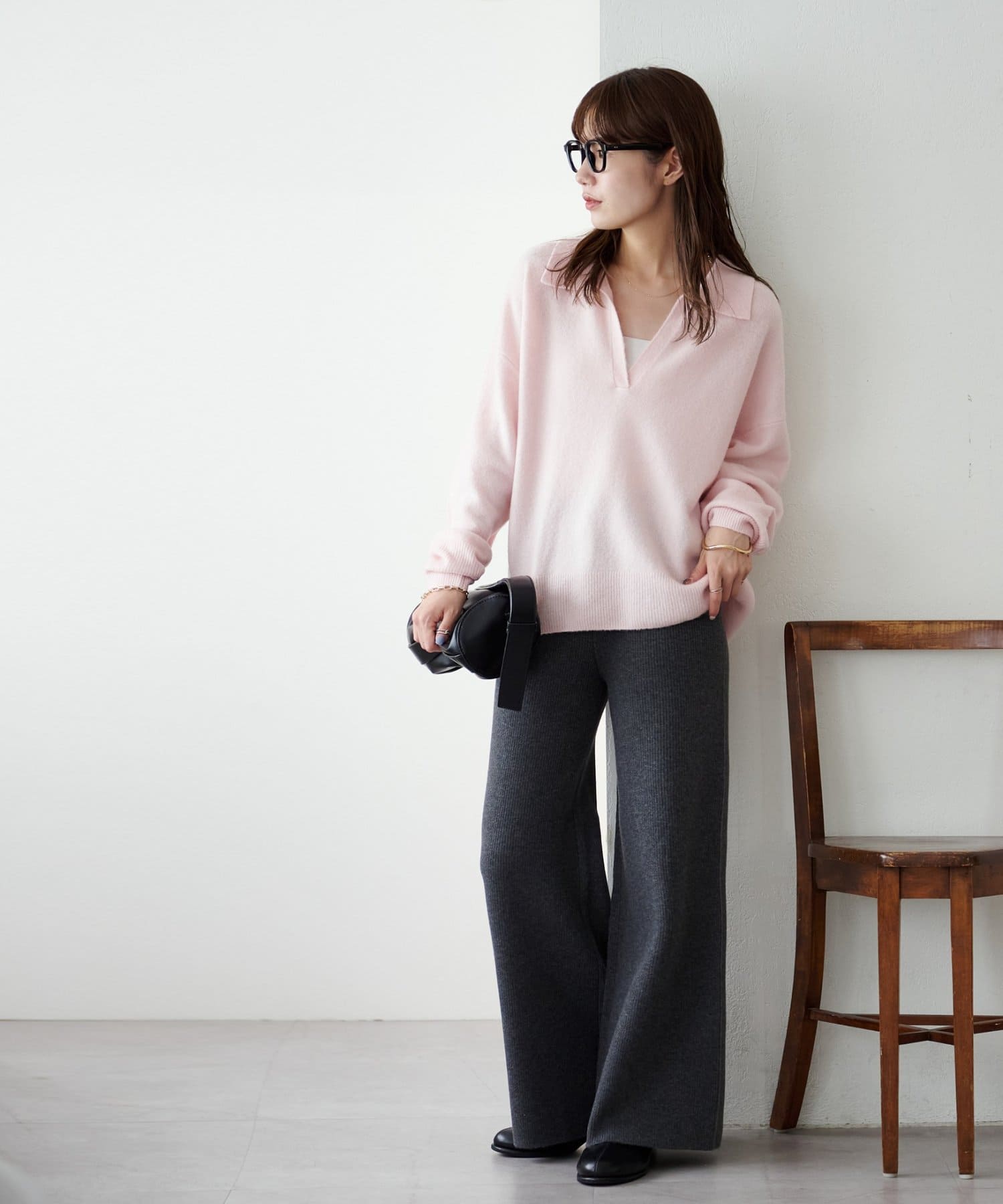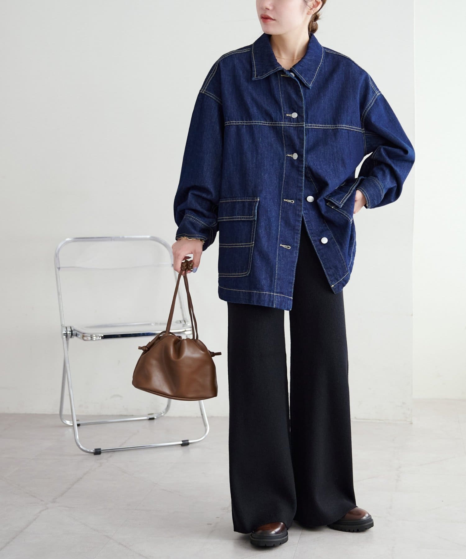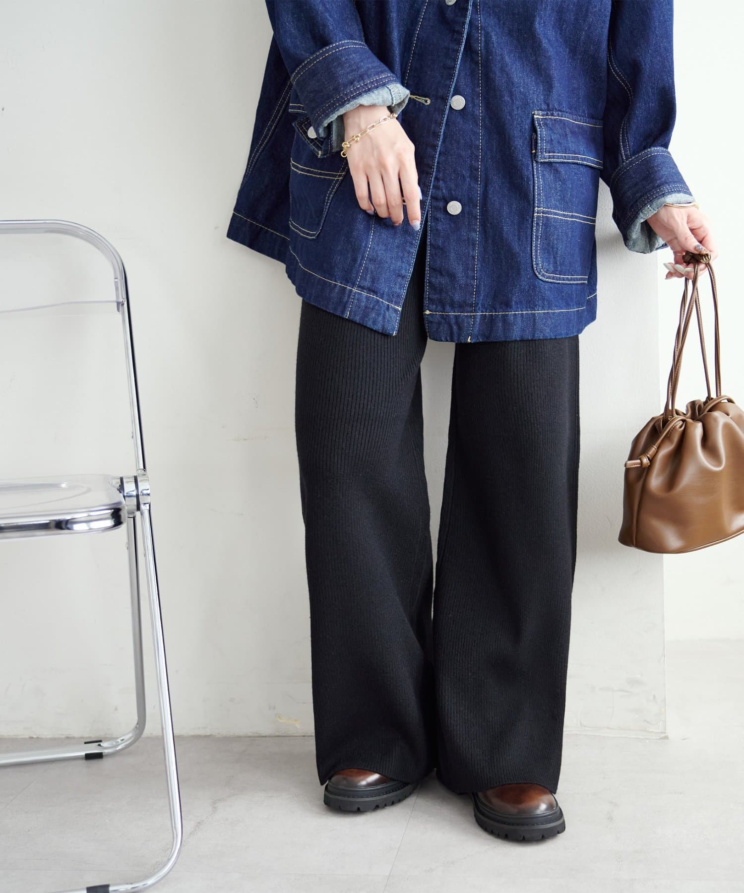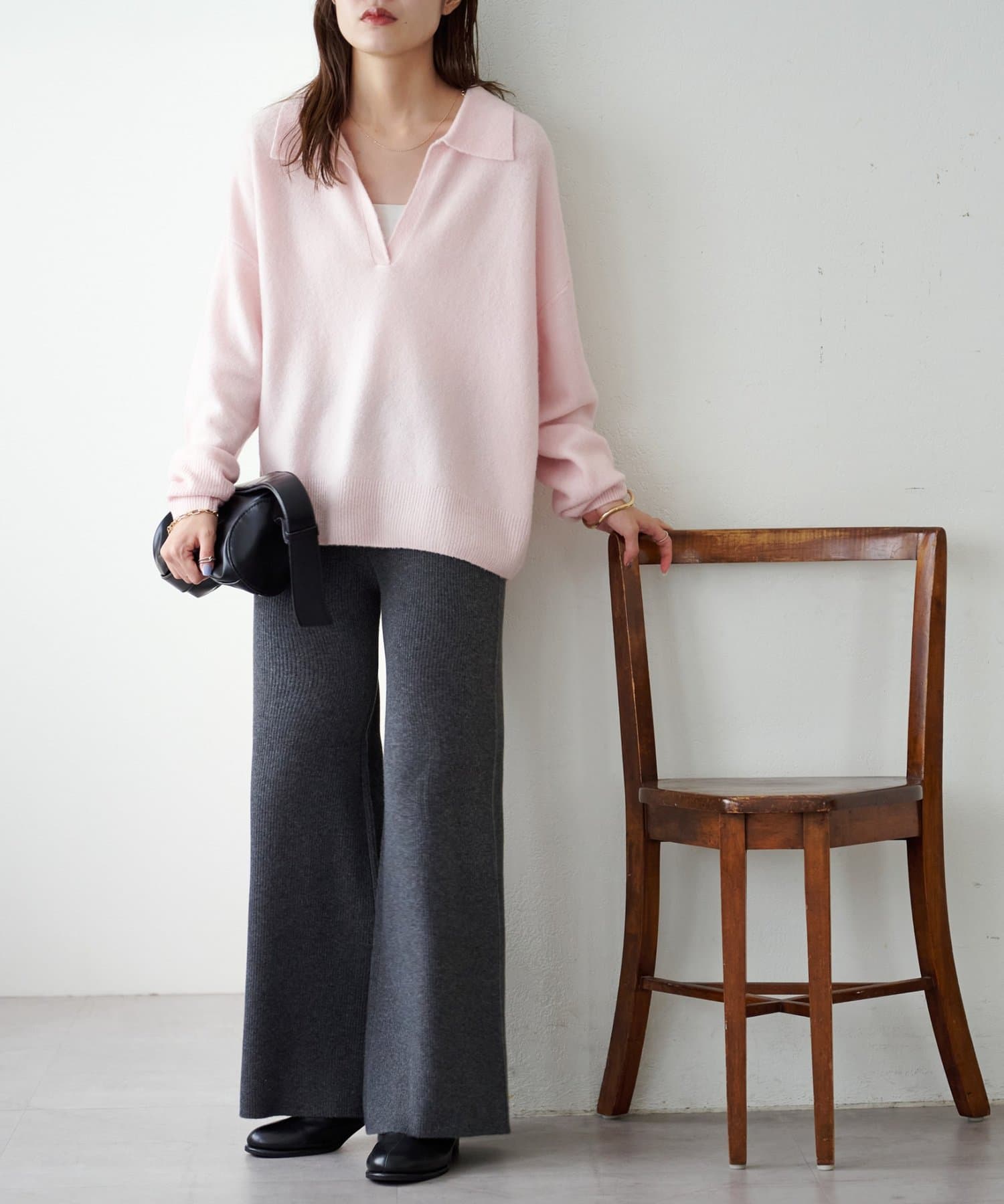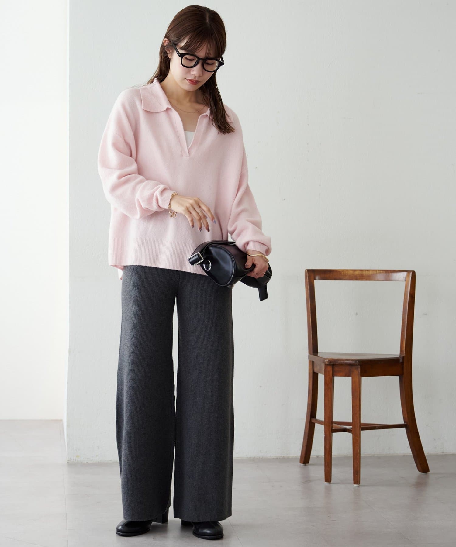 シンプルなので、合わせるアイテムはシンプルからトレンドまで問わず幅が広いです〇