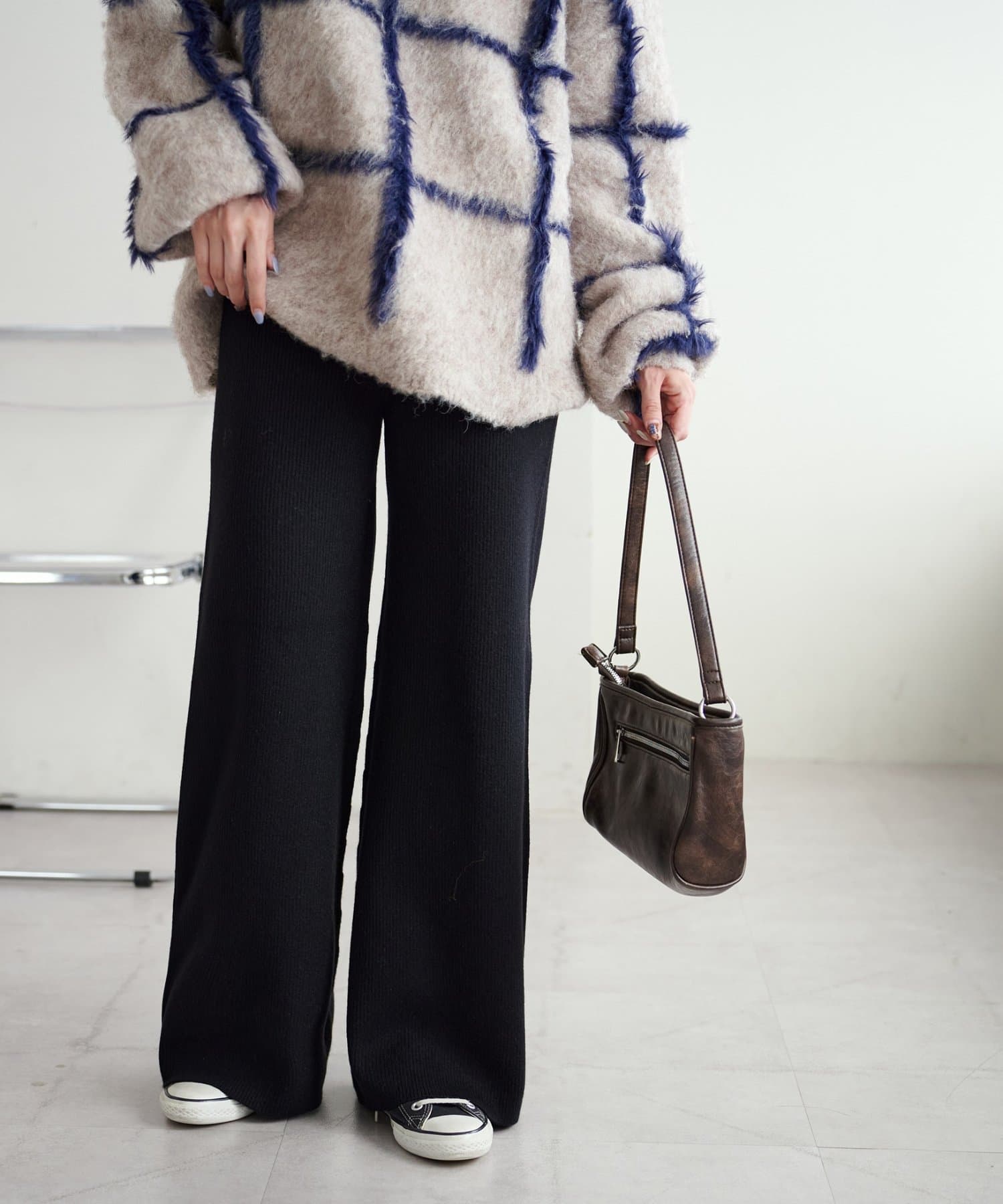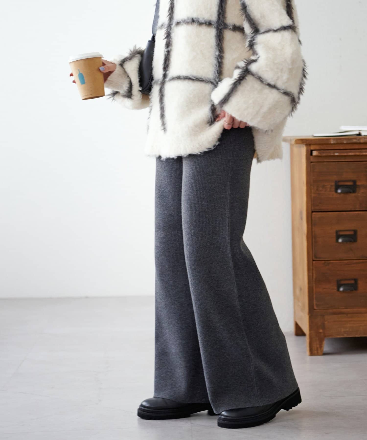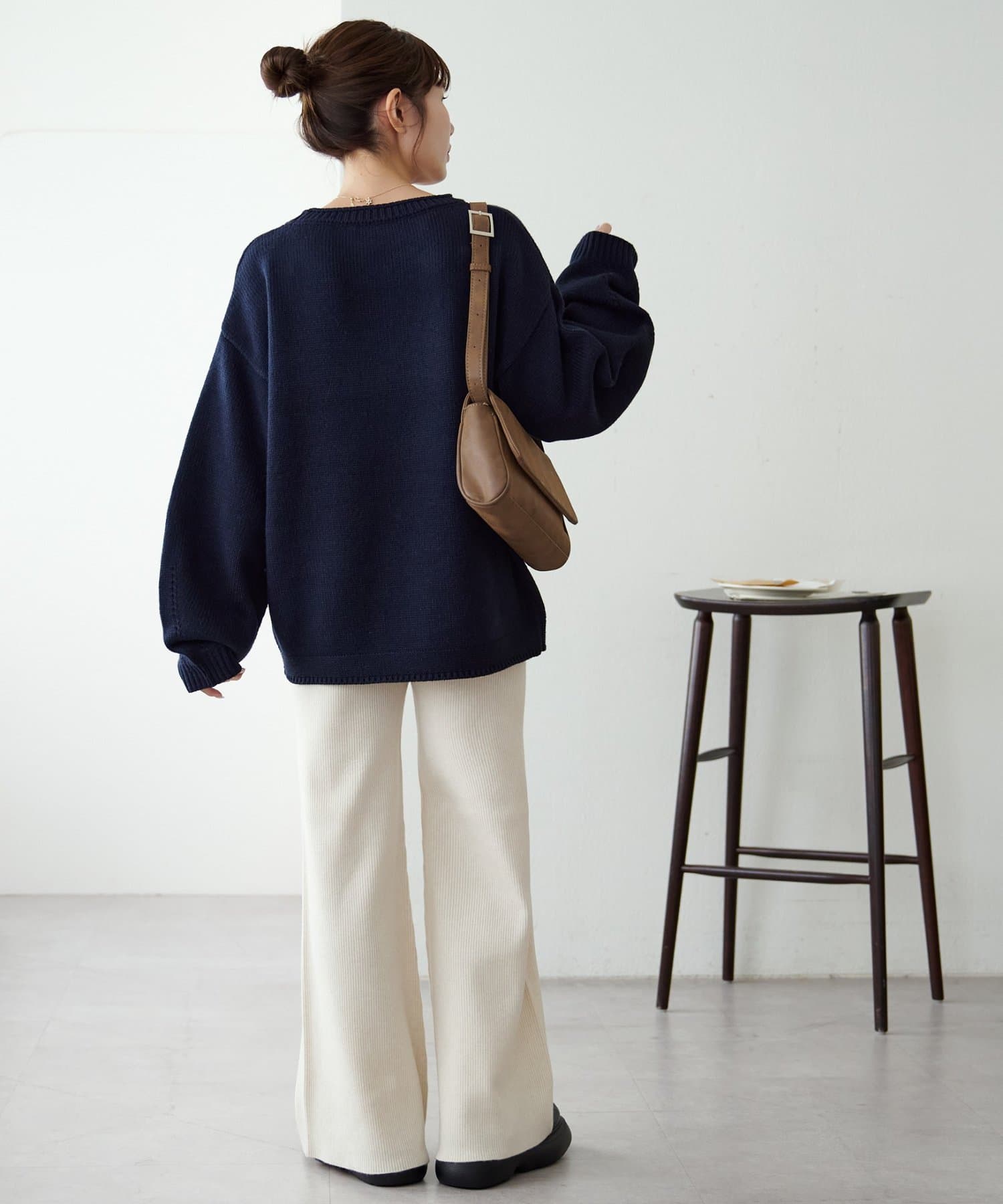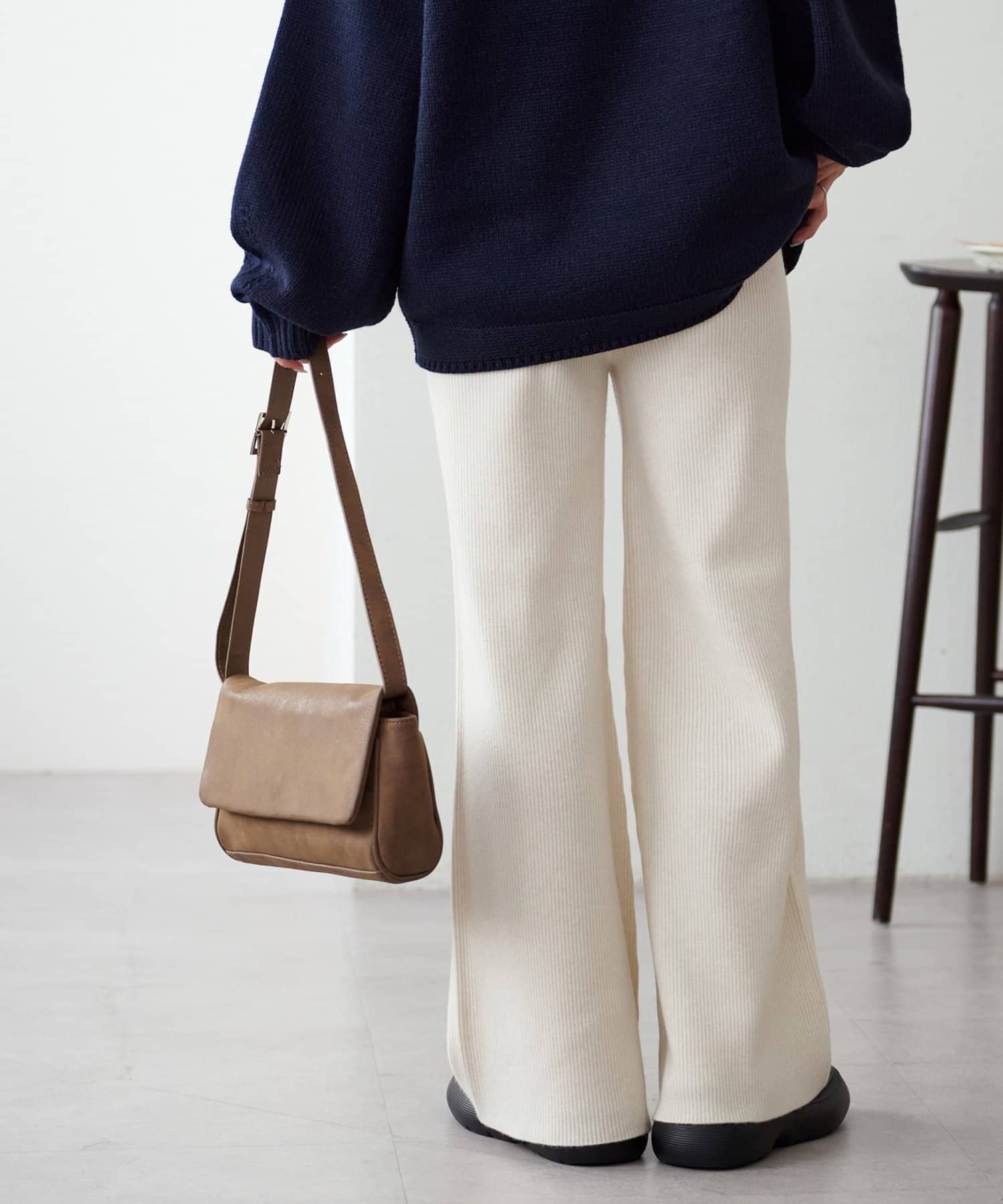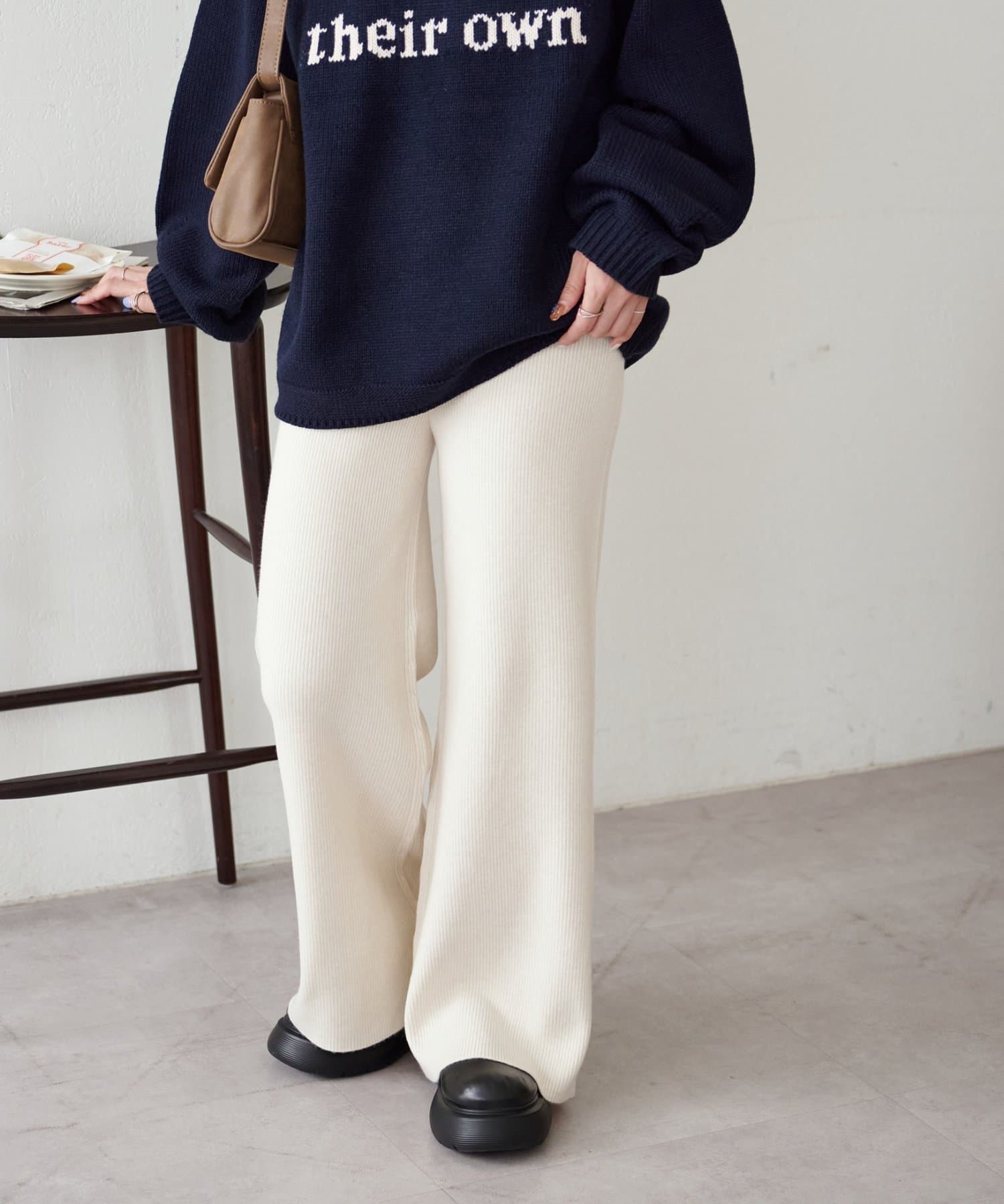ニットパンツでやや腰回りやヒップのラインは拾うので長めのトップとの合わせやチュニックとの合わせがおすすめ!