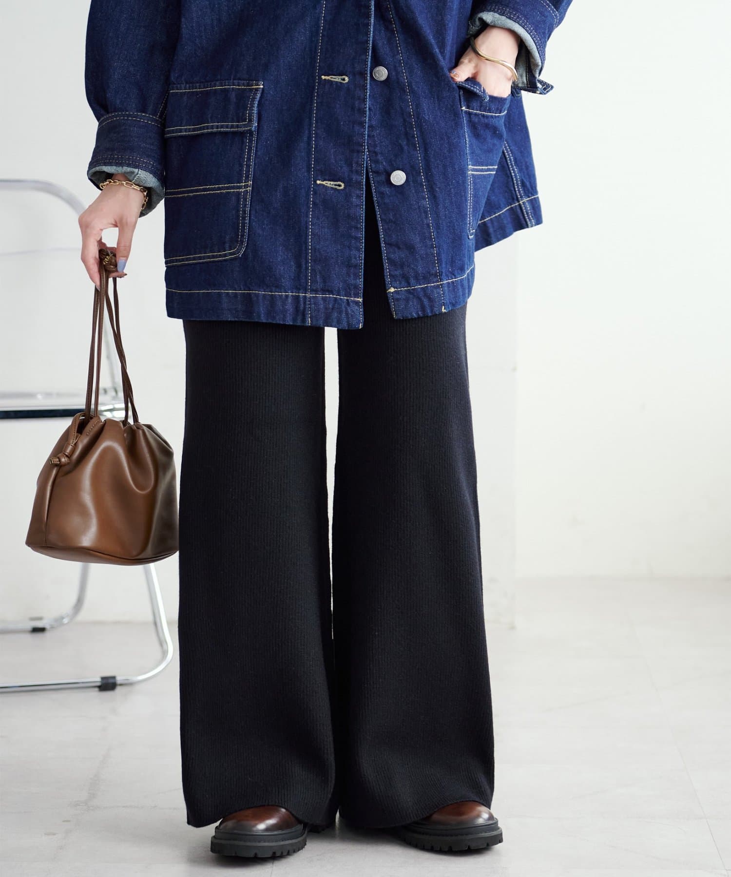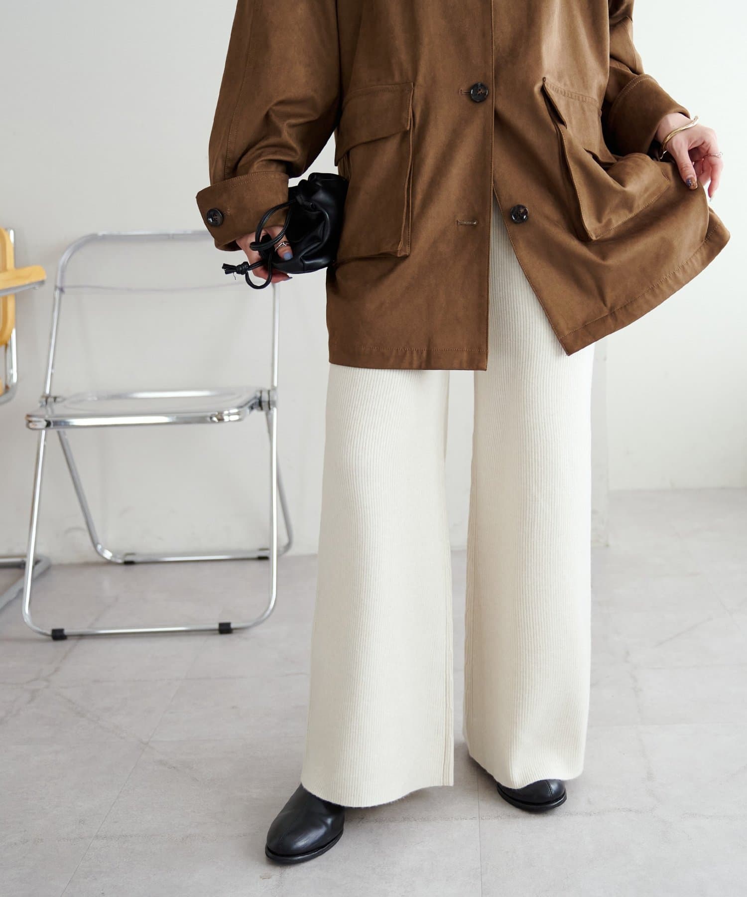 リブニットで細見えするので、着丈の長いニットやブラウス合わせがおすすめ!