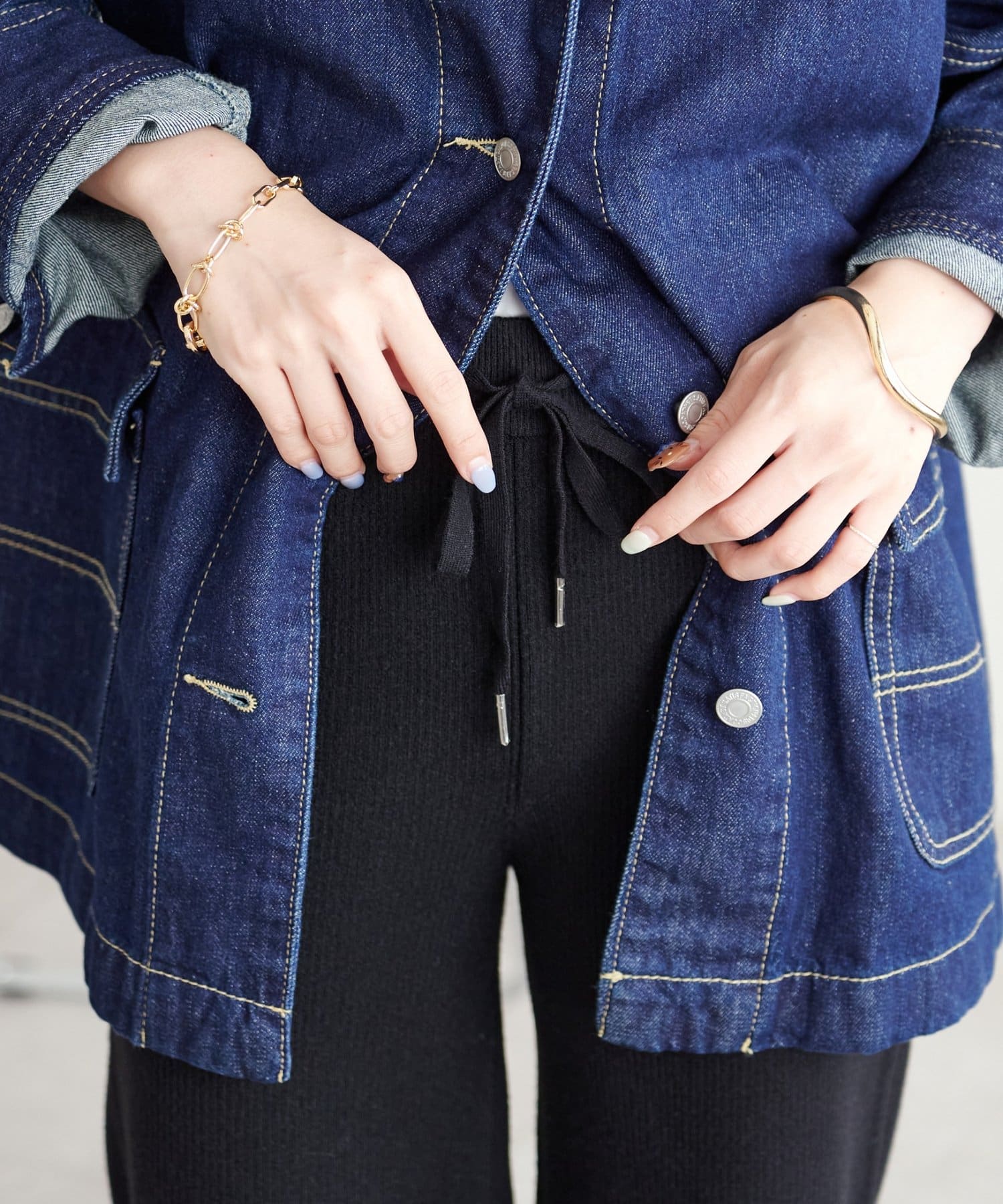 155cmスタッフ:Fサイズですが、ウエスト部分はゴムに加え紐でしっかりと調節が可能です〇